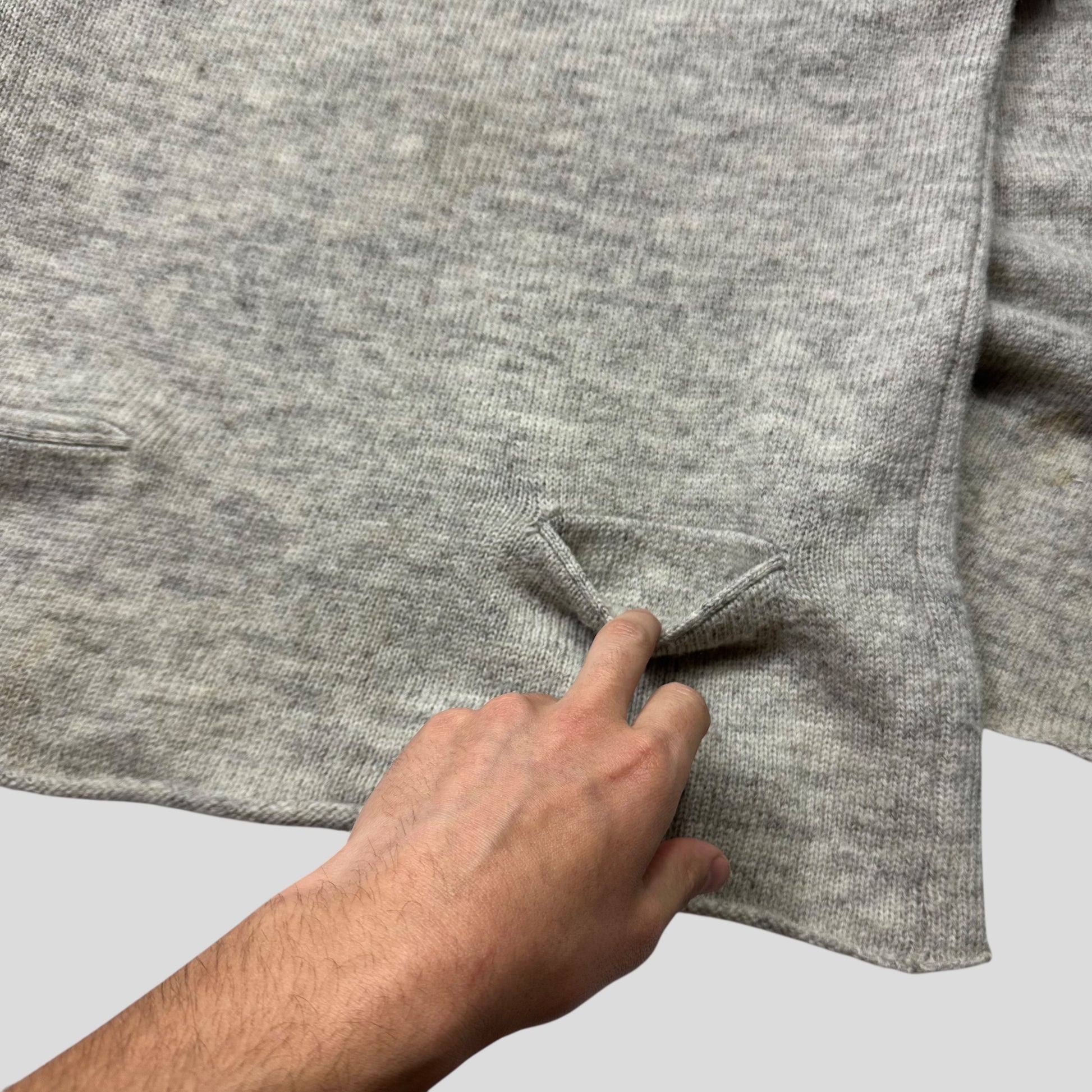 Very rare AD 1995 CDG HOMME wool pullover cardigan in heather cream, beautiful piece, simple textured stripe across the chest, cardigan hand pockets at the bottom, collared neck.