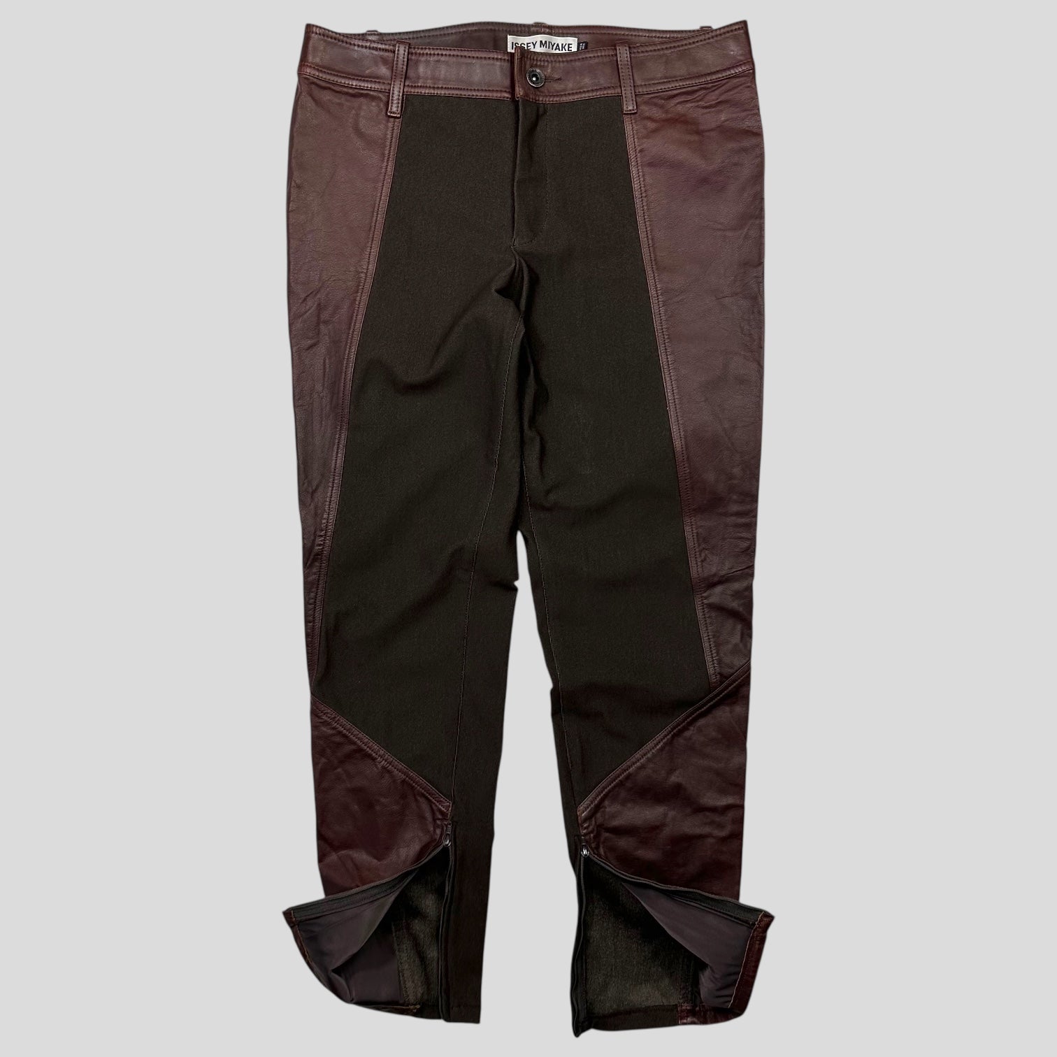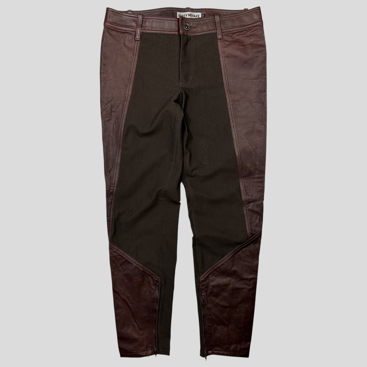 Very rare 2003 Issey Miyake mainline leather chaps / moto trousers, unique real leather panelling on poly nylon, zips at ankles and Issey buttons.