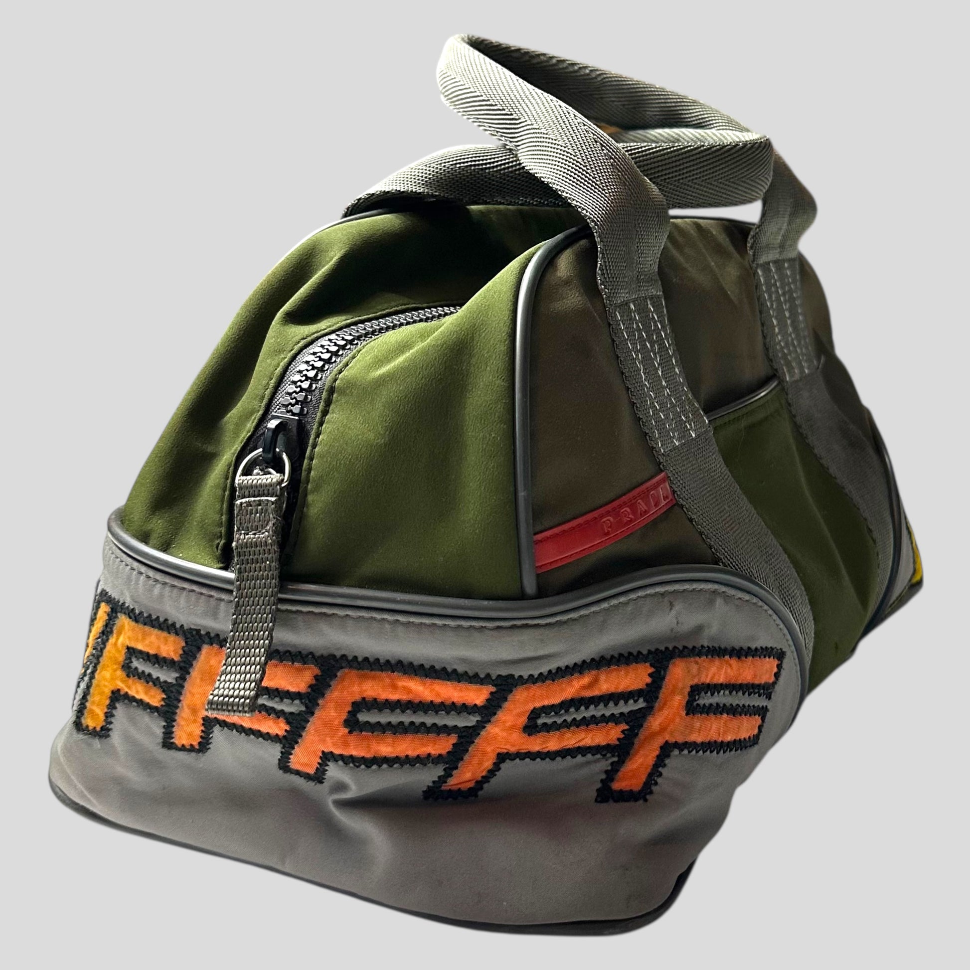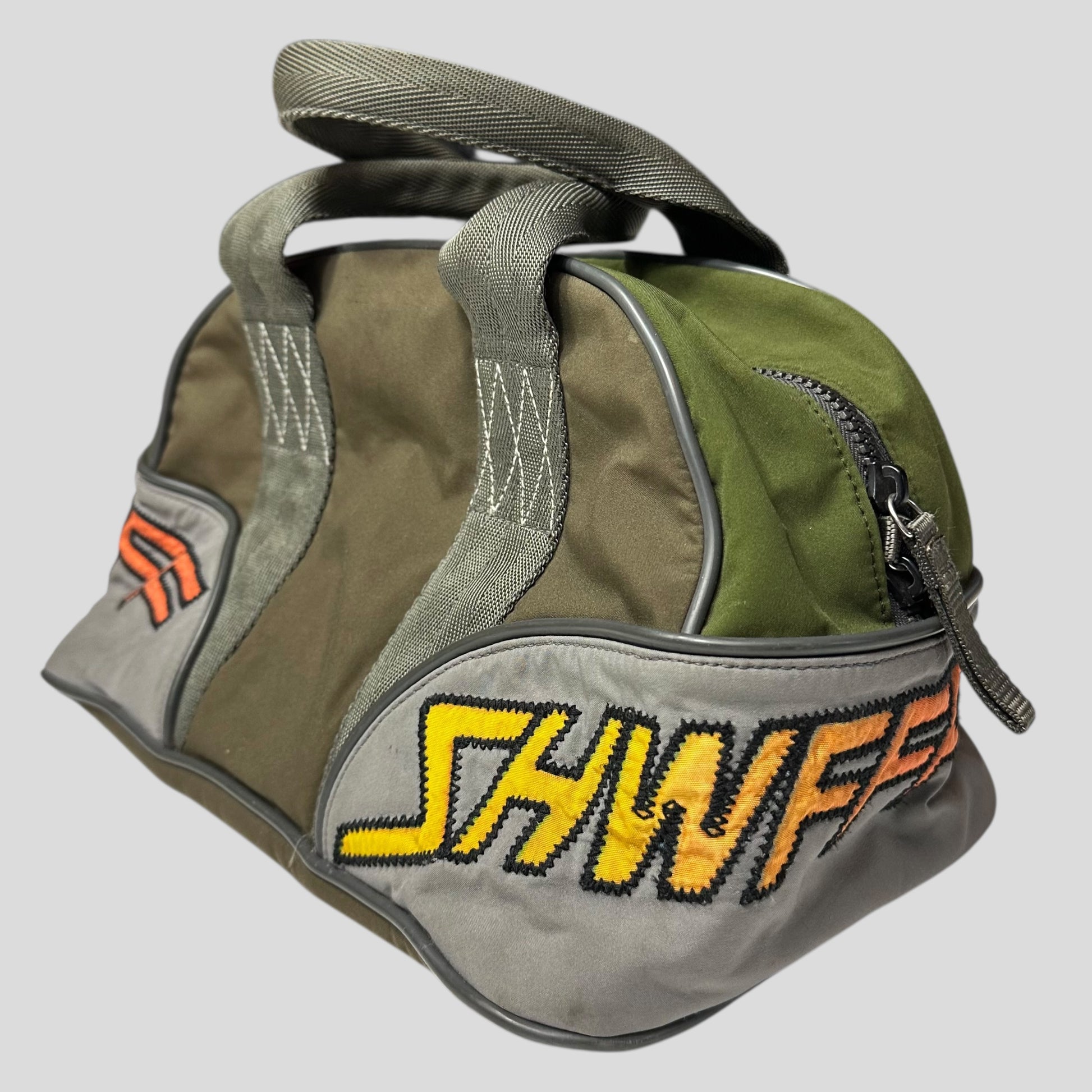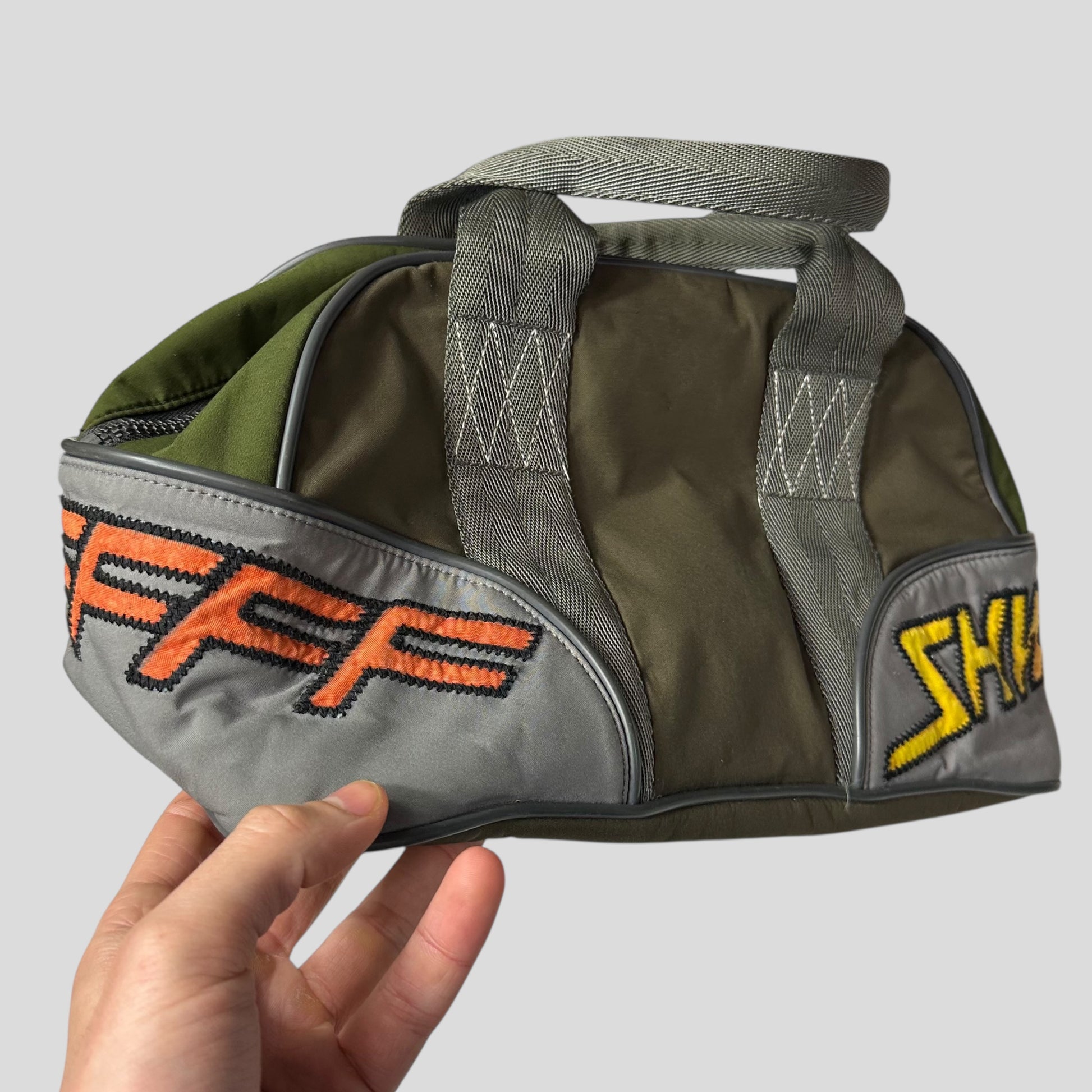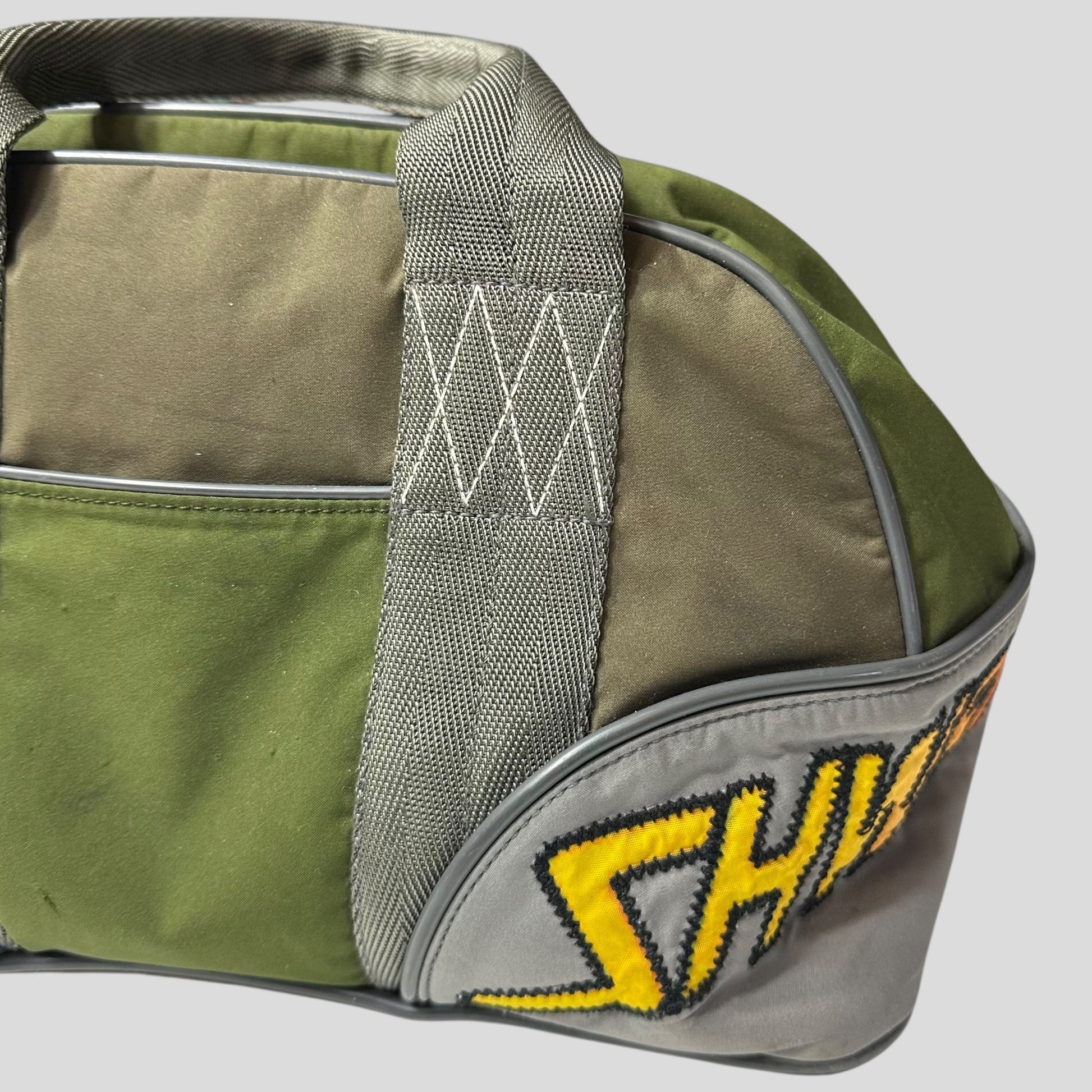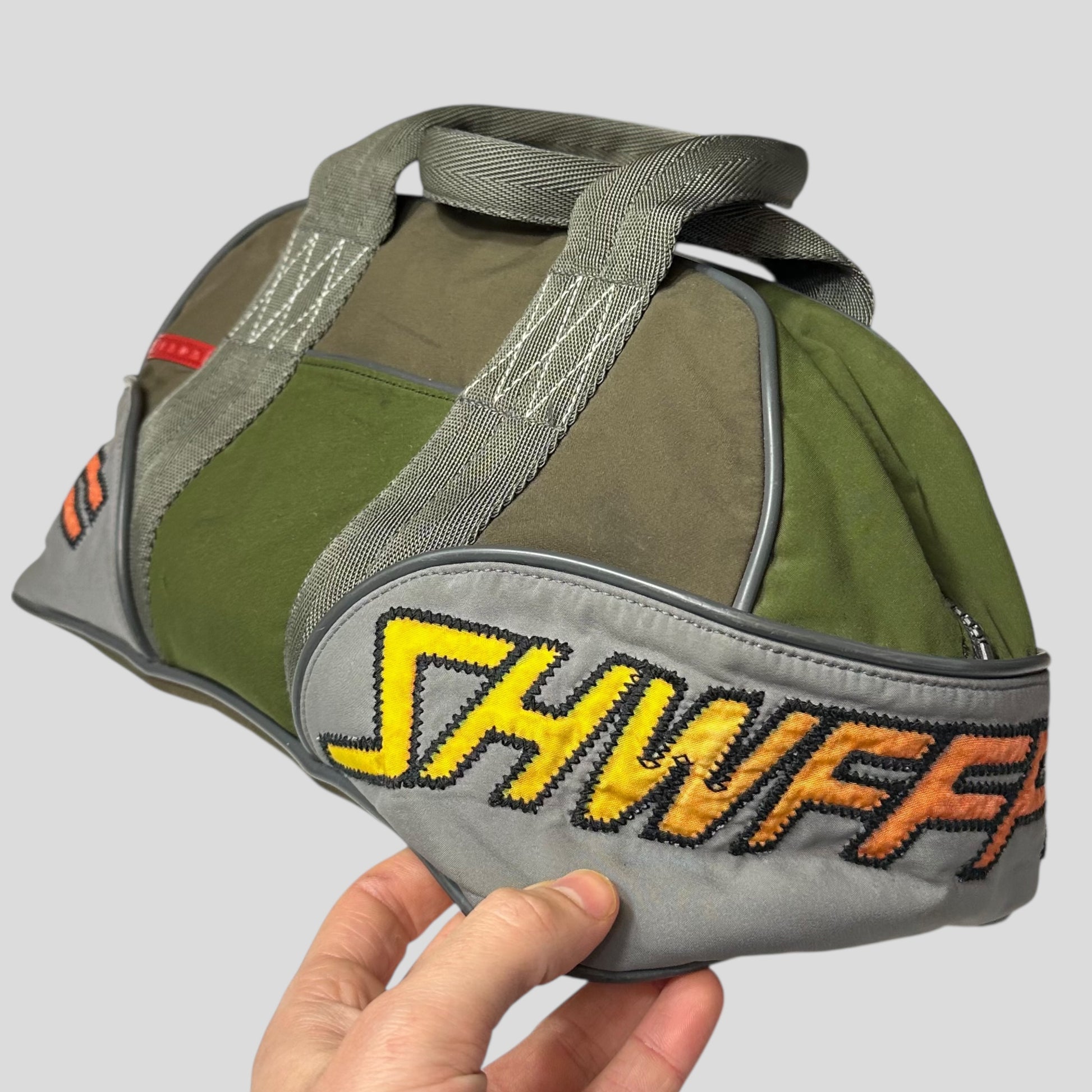 Early 2000’s Green and Khaki Prada Sport polyester handbag, very unique moto racing design with embroidered SHWFFFF detailing, small slot pocket to front with Prada rubber logo tab, structured bag that keeps its shape, bowling style.