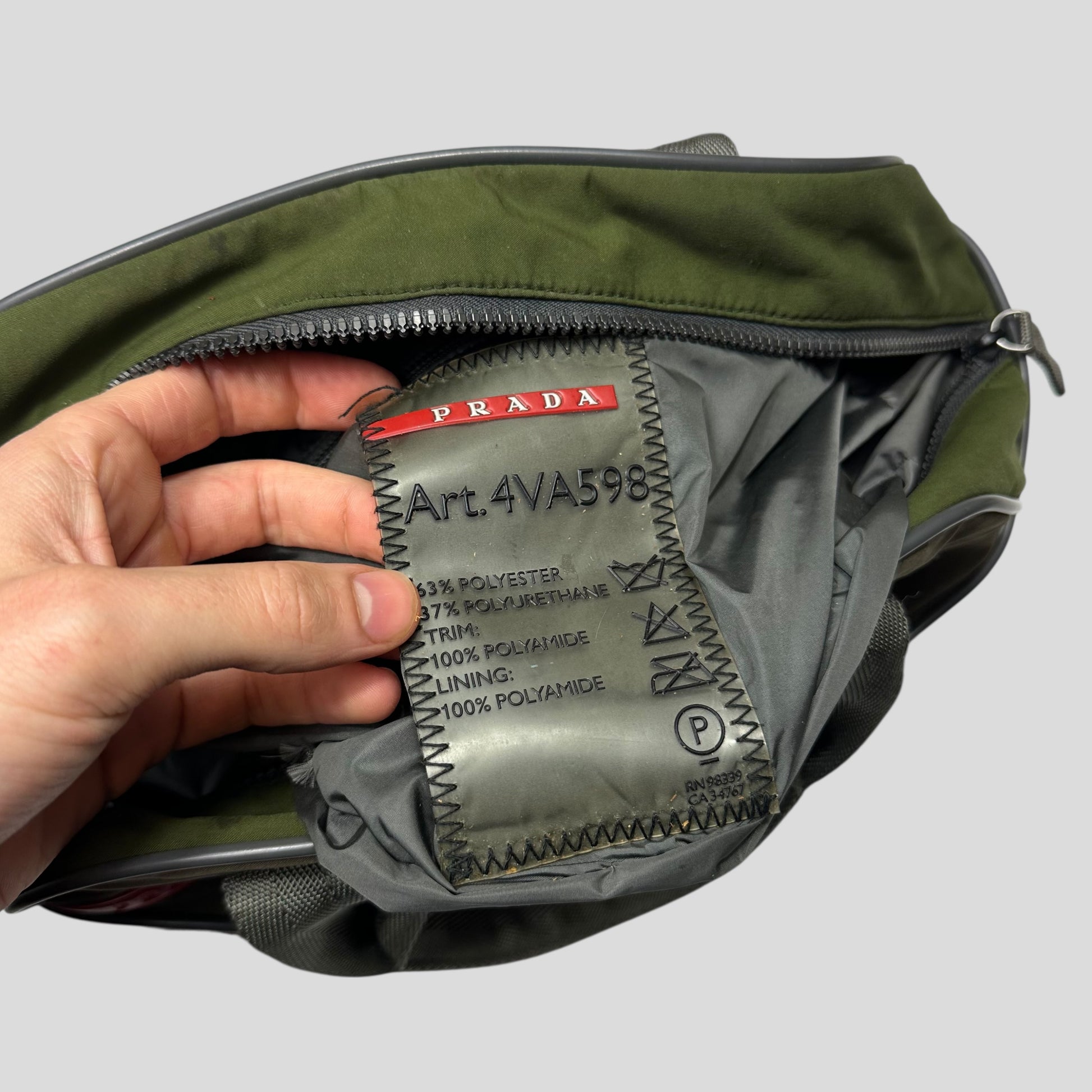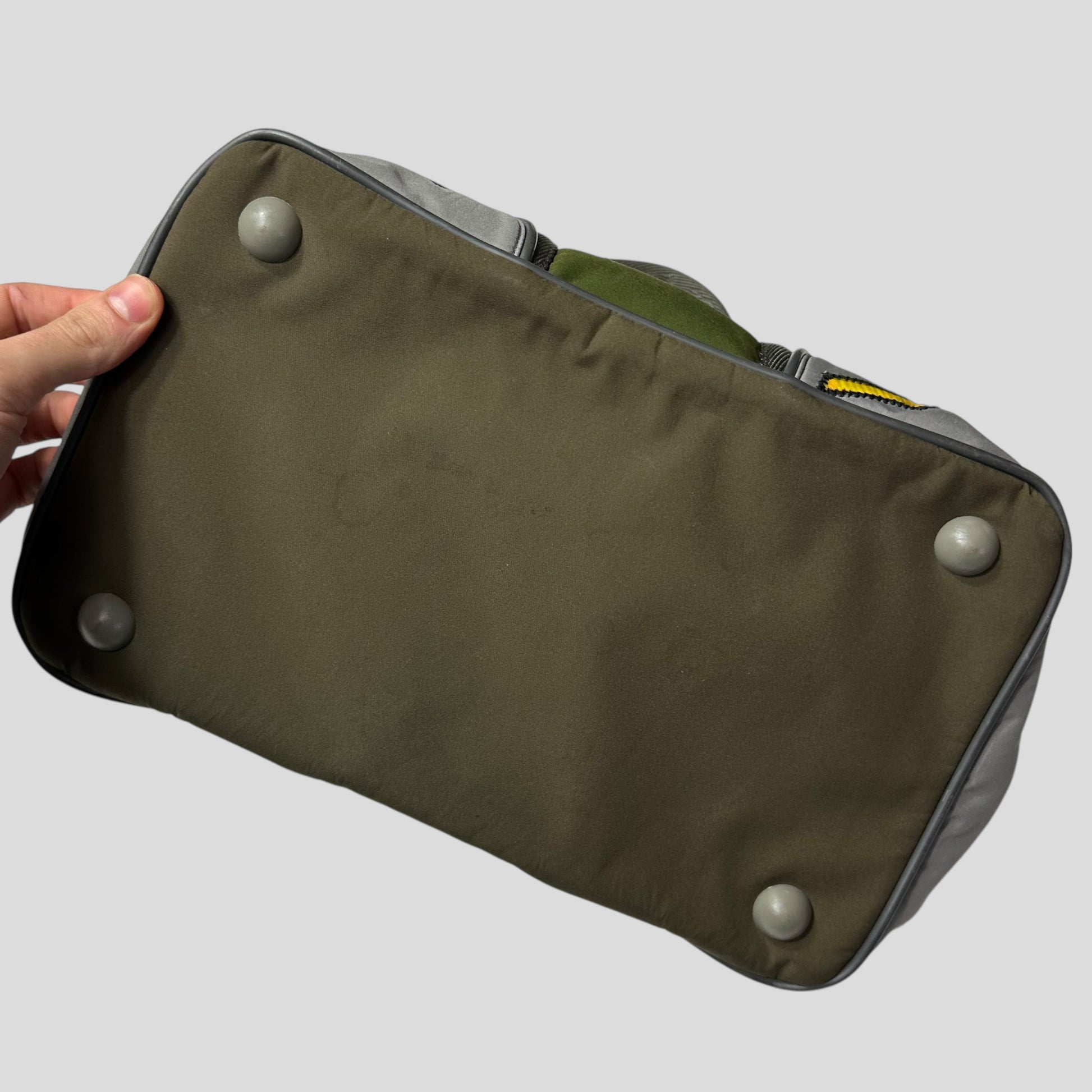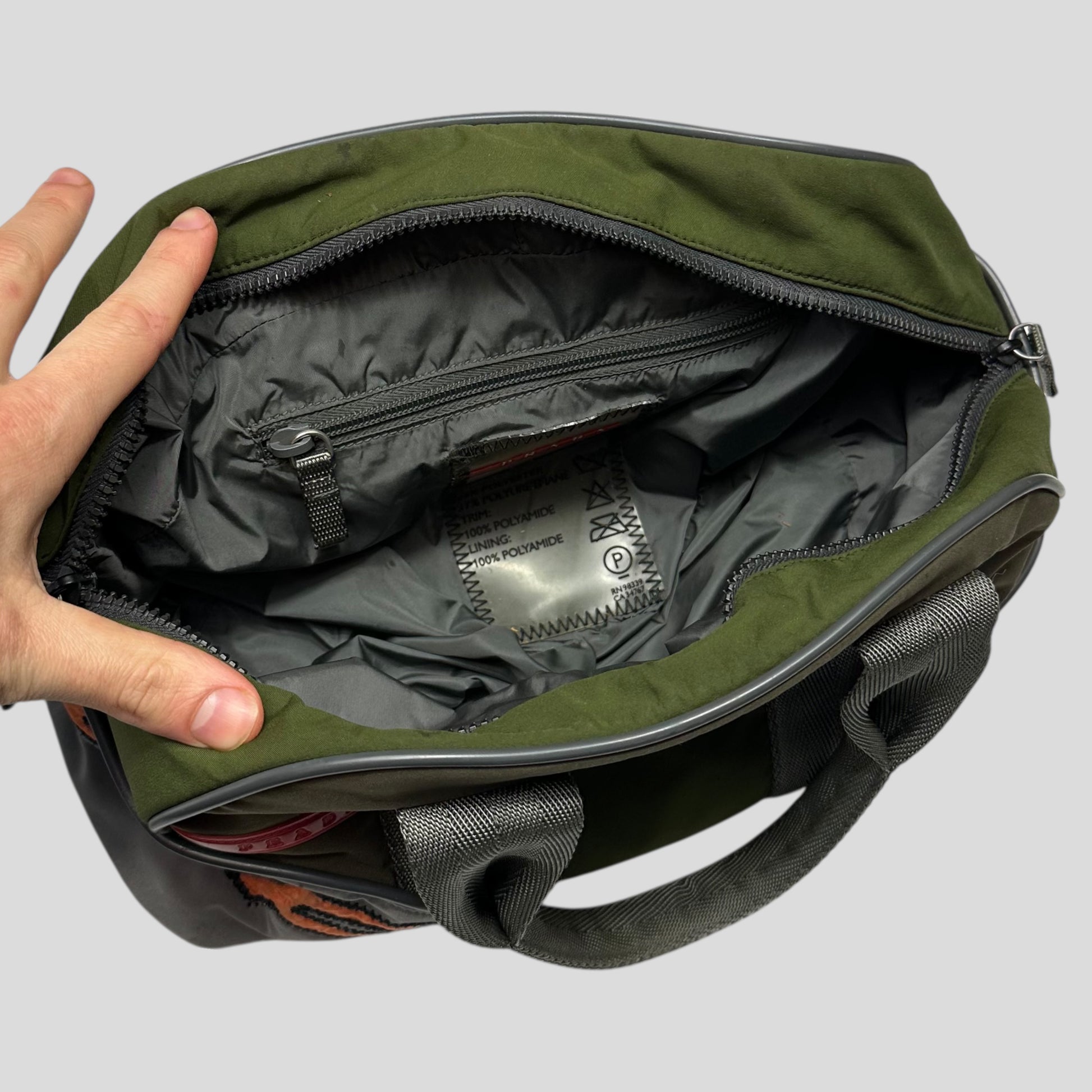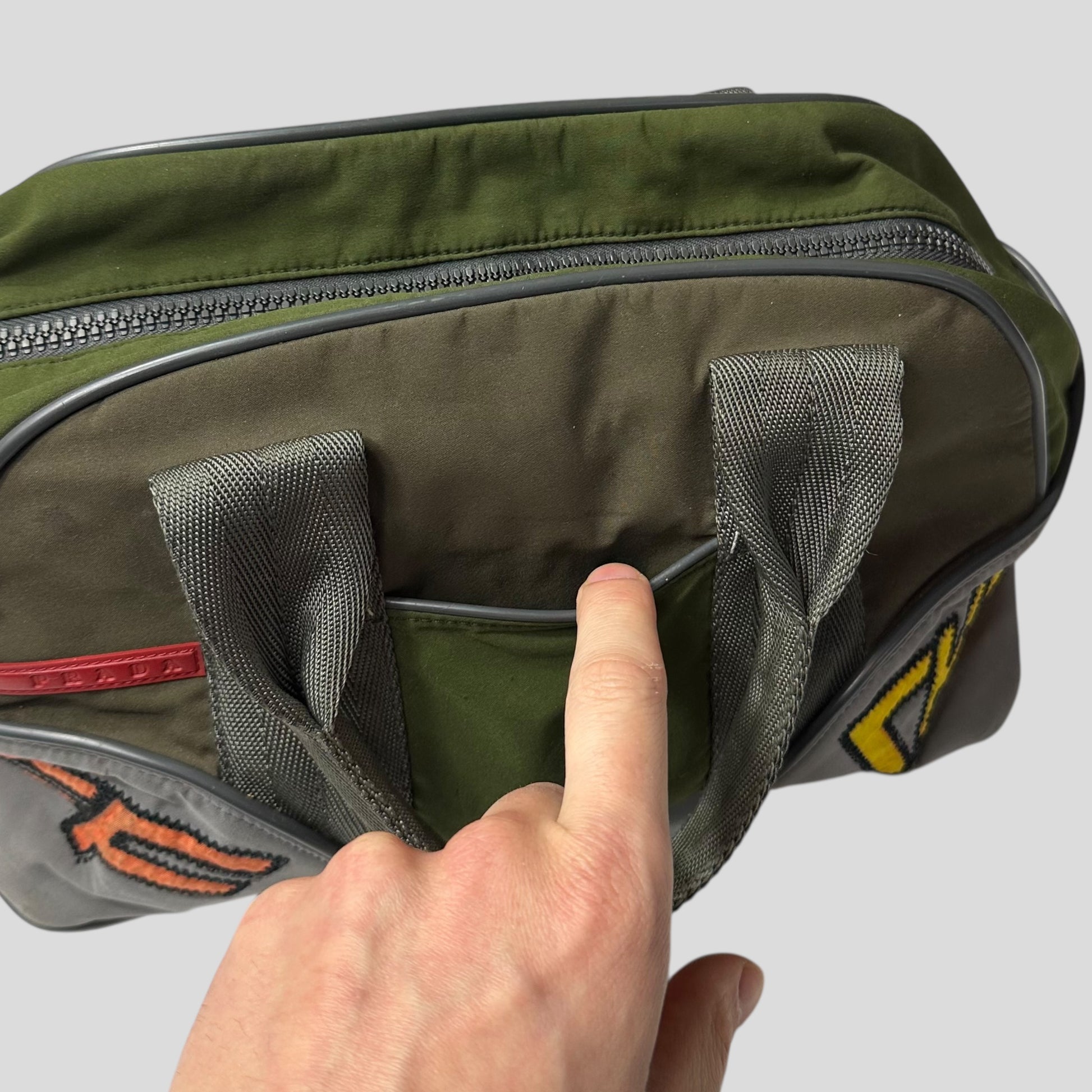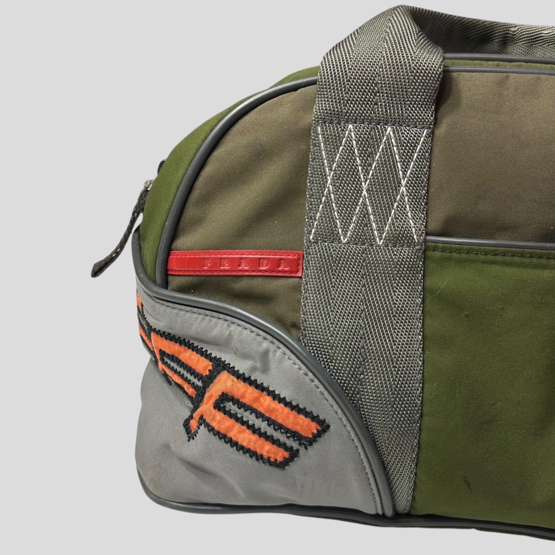 Early 2000’s Green and Khaki Prada Sport polyester handbag, very unique moto racing design with embroidered SHWFFFF detailing, small slot pocket to front with Prada rubber logo tab, structured bag that keeps its shape, bowling style.