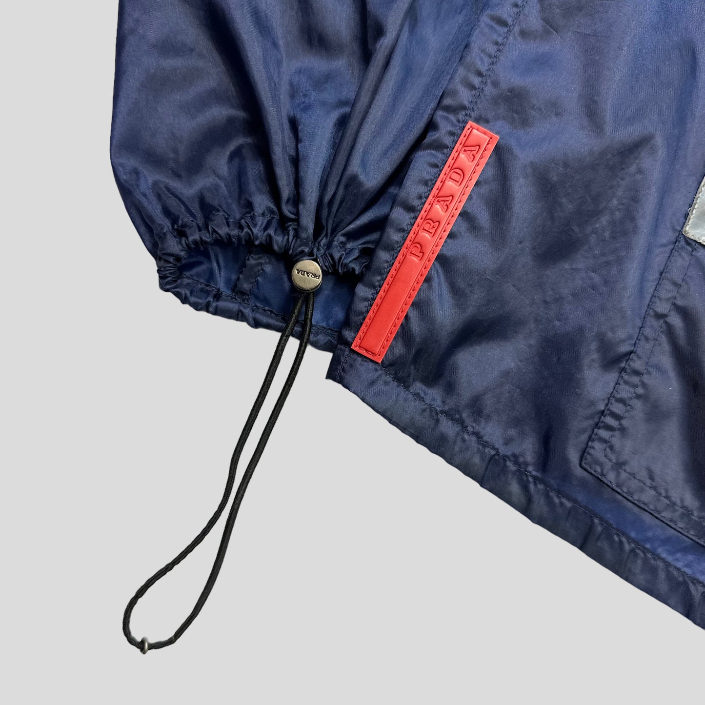 Features reflective strips at the pockets, convertible arms which allow the jacket to be transformed from long to short sleeve, Prada metal drawstrings at the wrist to adjust fit, a miniature track style collar and the Prada Sport red tab at the waist.