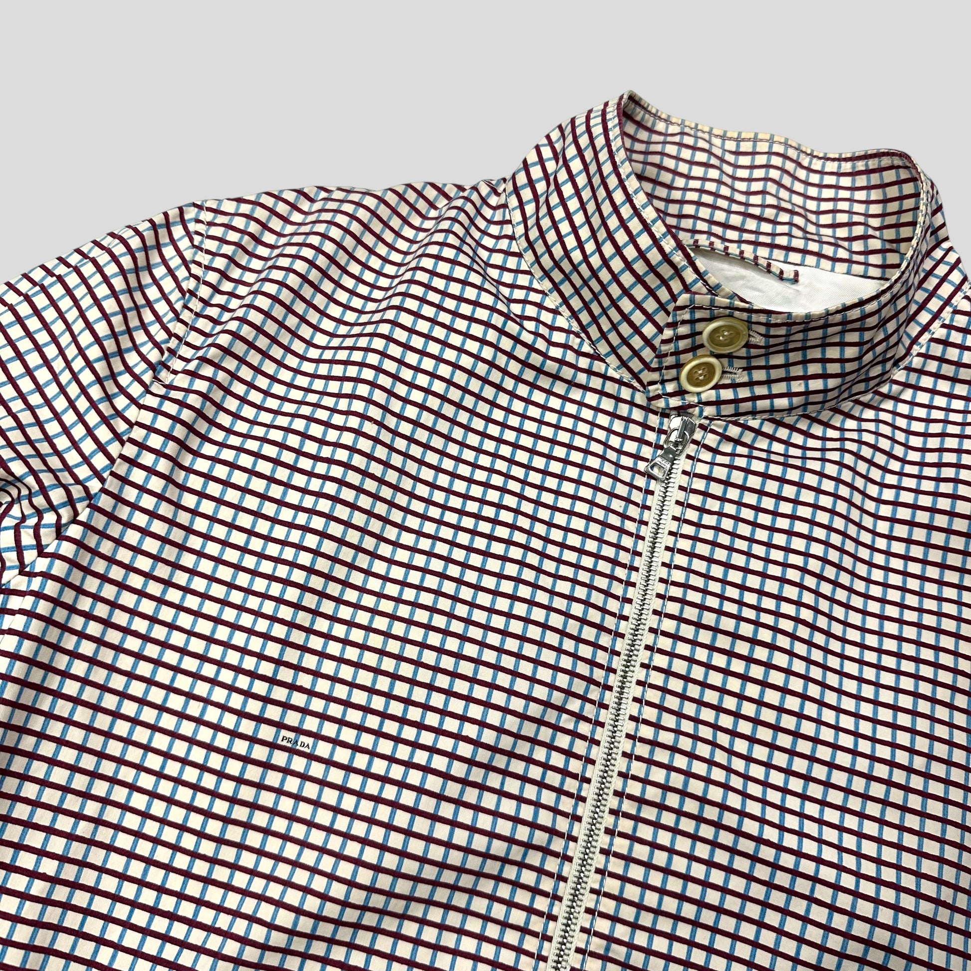 Extremely rare spring summer 2008 Prada Mainline Milano blue and burgundy checkered Harrington bomber jacket in a lovely white cotton grid check print, mini Prada logos are classily placed throughout the print, chunky cream and blue wool textured cuffs and hem, button collar, silky viscose lining with suit style pocket, hand pockets to front.