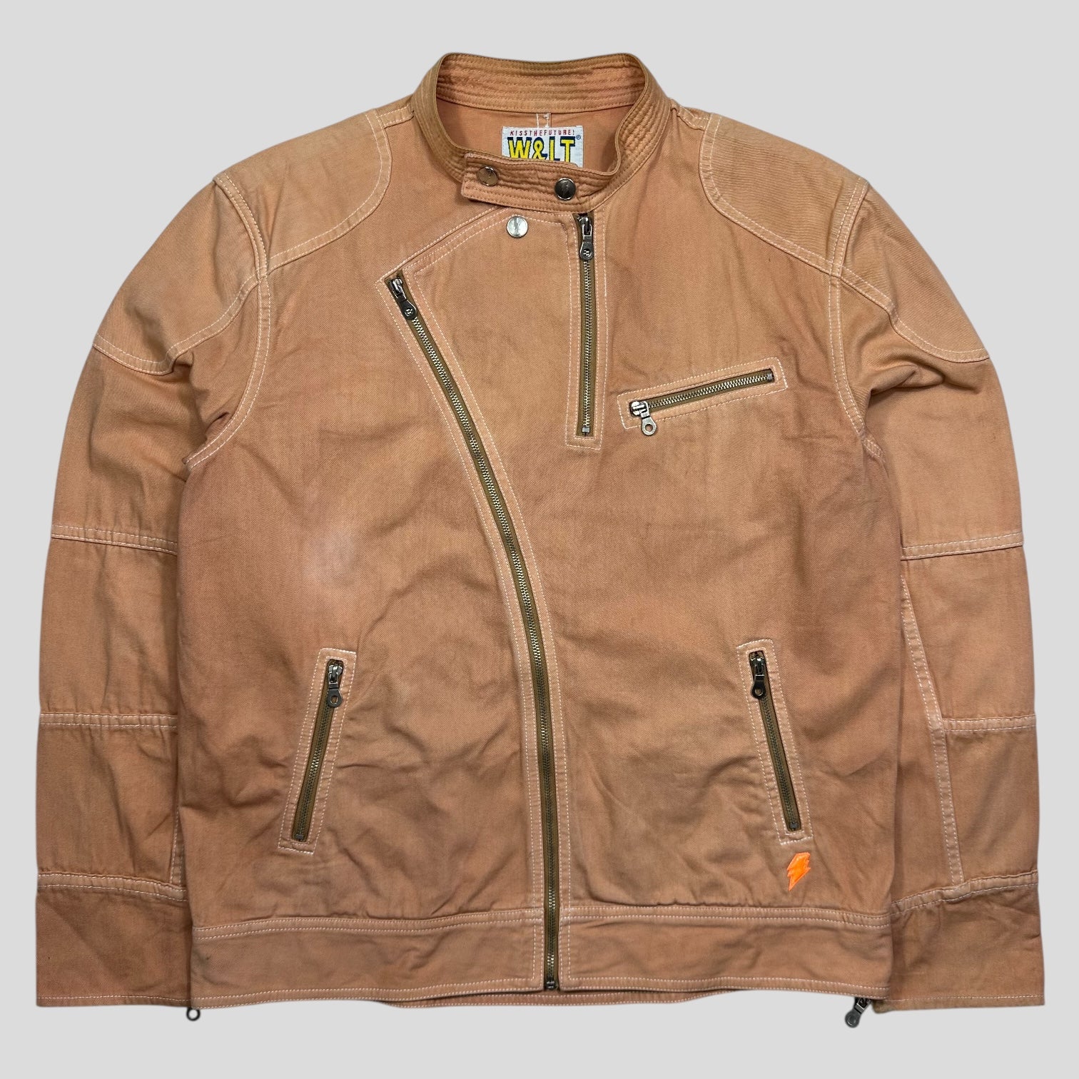 Wild and Lethal Trash by walter van beirendonck 1997 heavy duty peach cotton motorcycle jacket, 3D gel lightning logo to bottom right, metal lightning bolt buttons, exposed metal zip pockets throughout, crazy panelling and asymmetrical moto design.