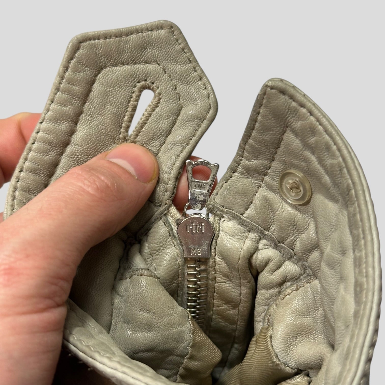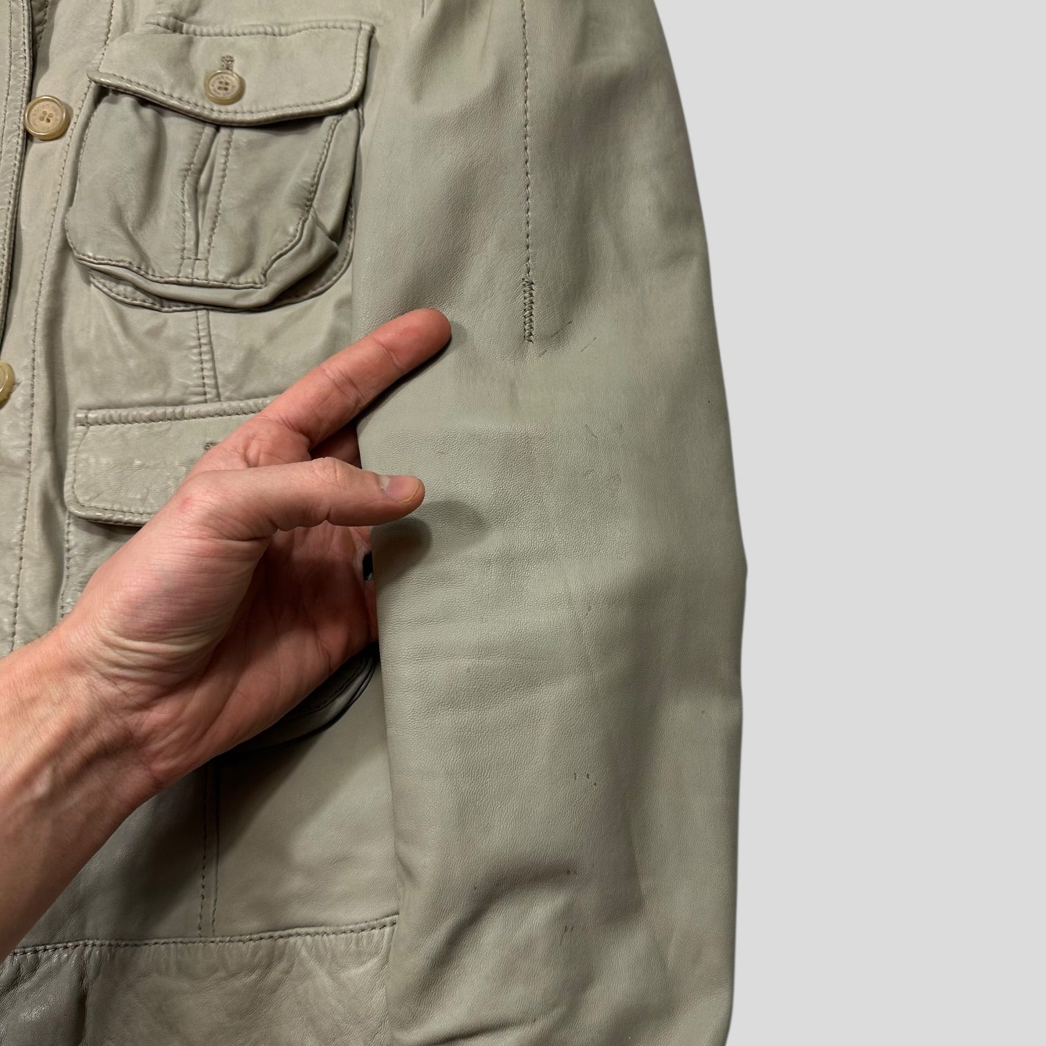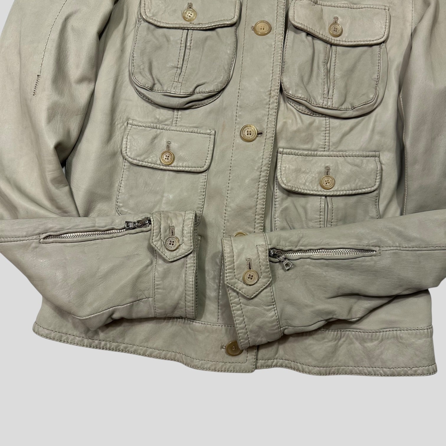 Incredibly soft leather, unique asymetrical 3D multipockets, silky cupro lining, metal Riri Zippers at cuffs, made in Italy and retailing for £1000+ in the early 2000’s.