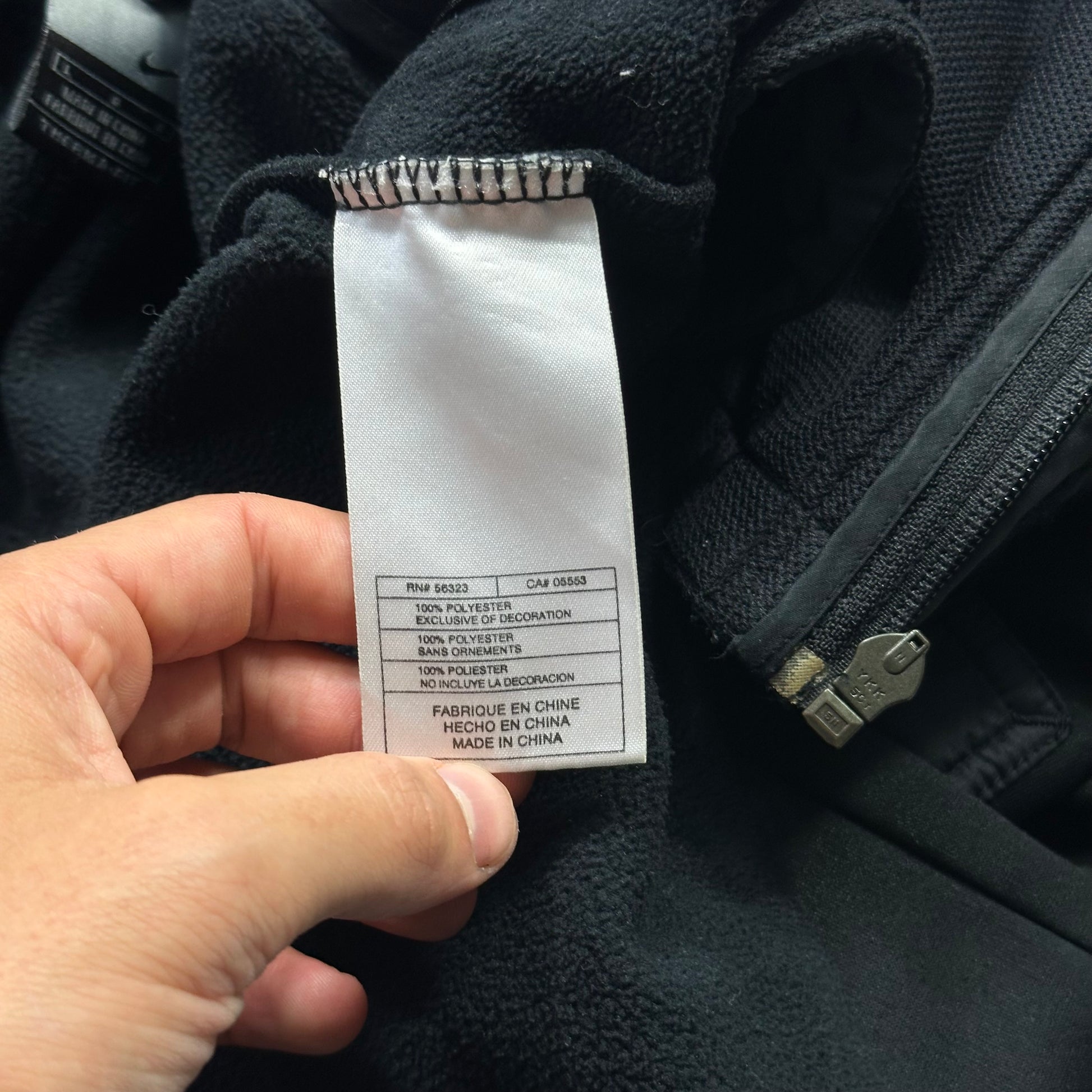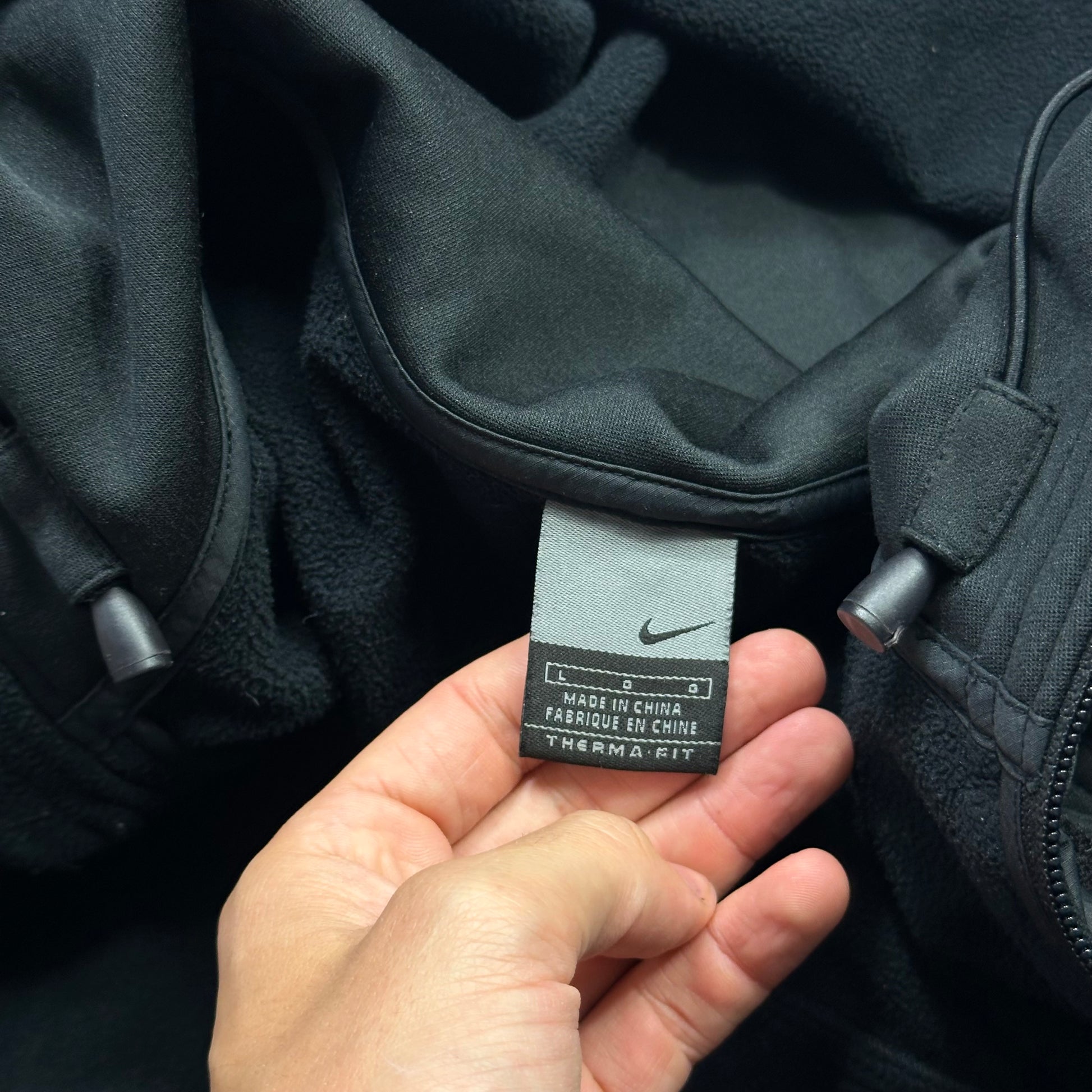 Nike jet black 2002 Therma-fit polyester soft shell jacket with black ripstop nylon panelling on the arms, pockets and hood, embroidered grey swoosh to chest, high neck balaclava style hood with adjustable cords to fit, grey tag era.
