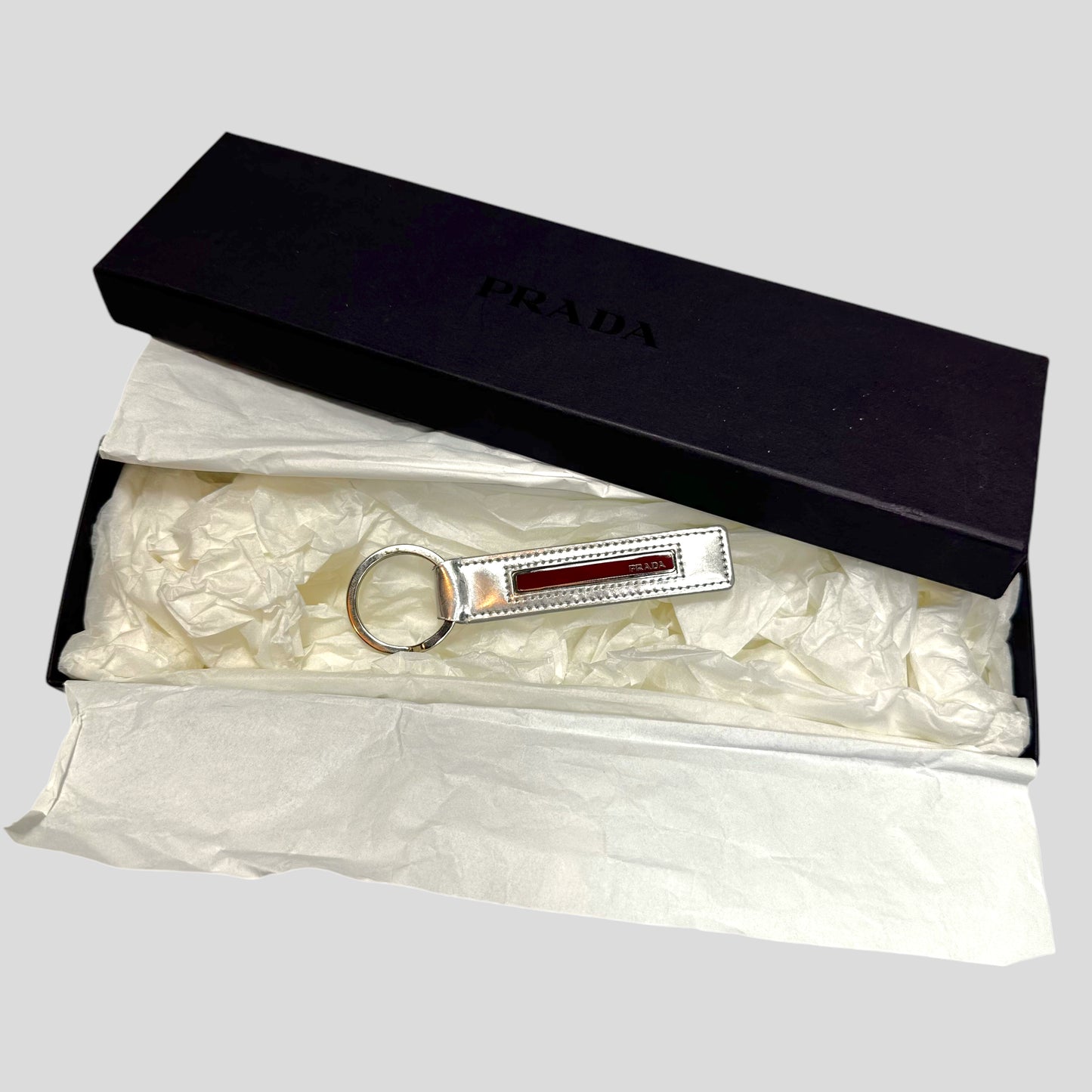 Very rare 2000’s Prada Sport silver Astro leather keyring with red Sport plaque logo, comes with the original Prada box and papers.