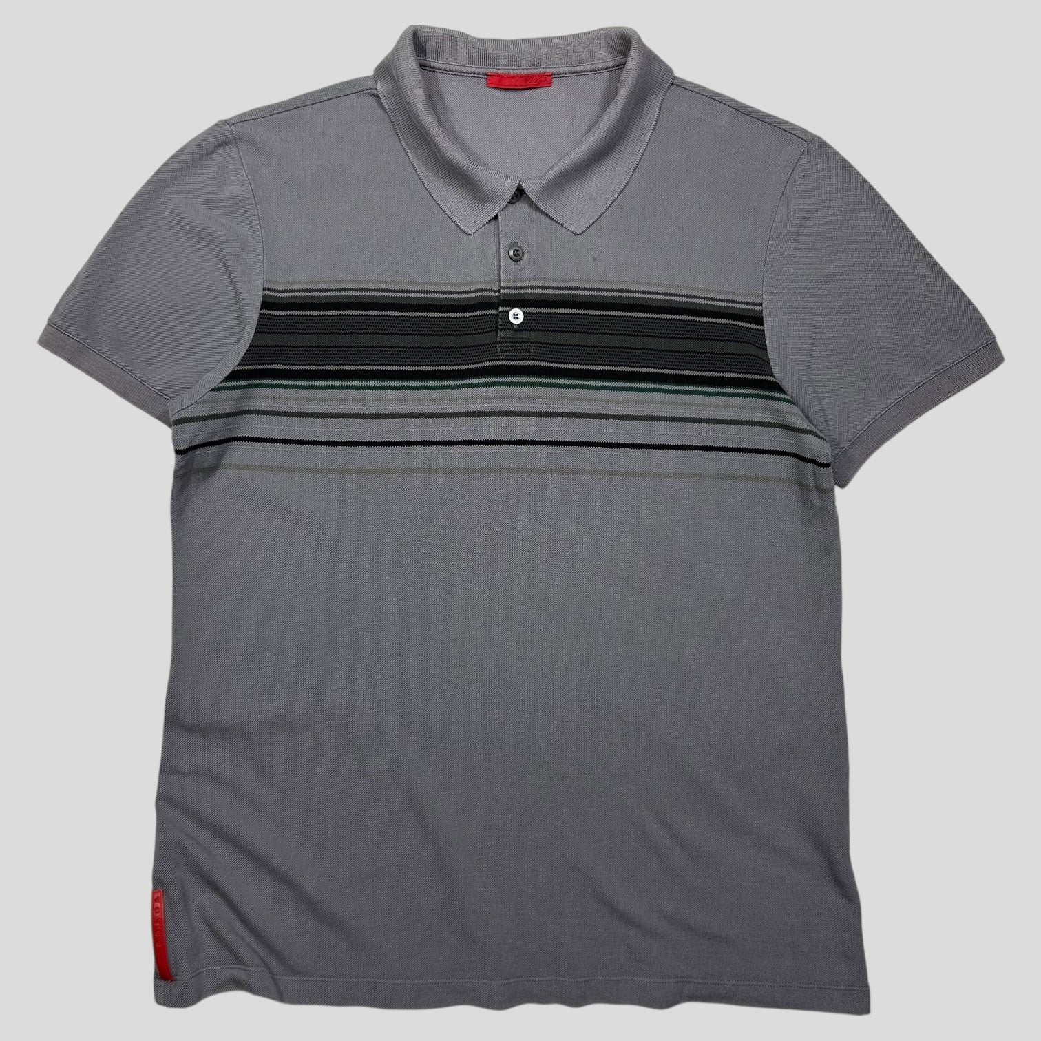 Rare Prada Sport grey polo, unique embroidered striping across the chest, you never see these for sale, red logo tab to hip.