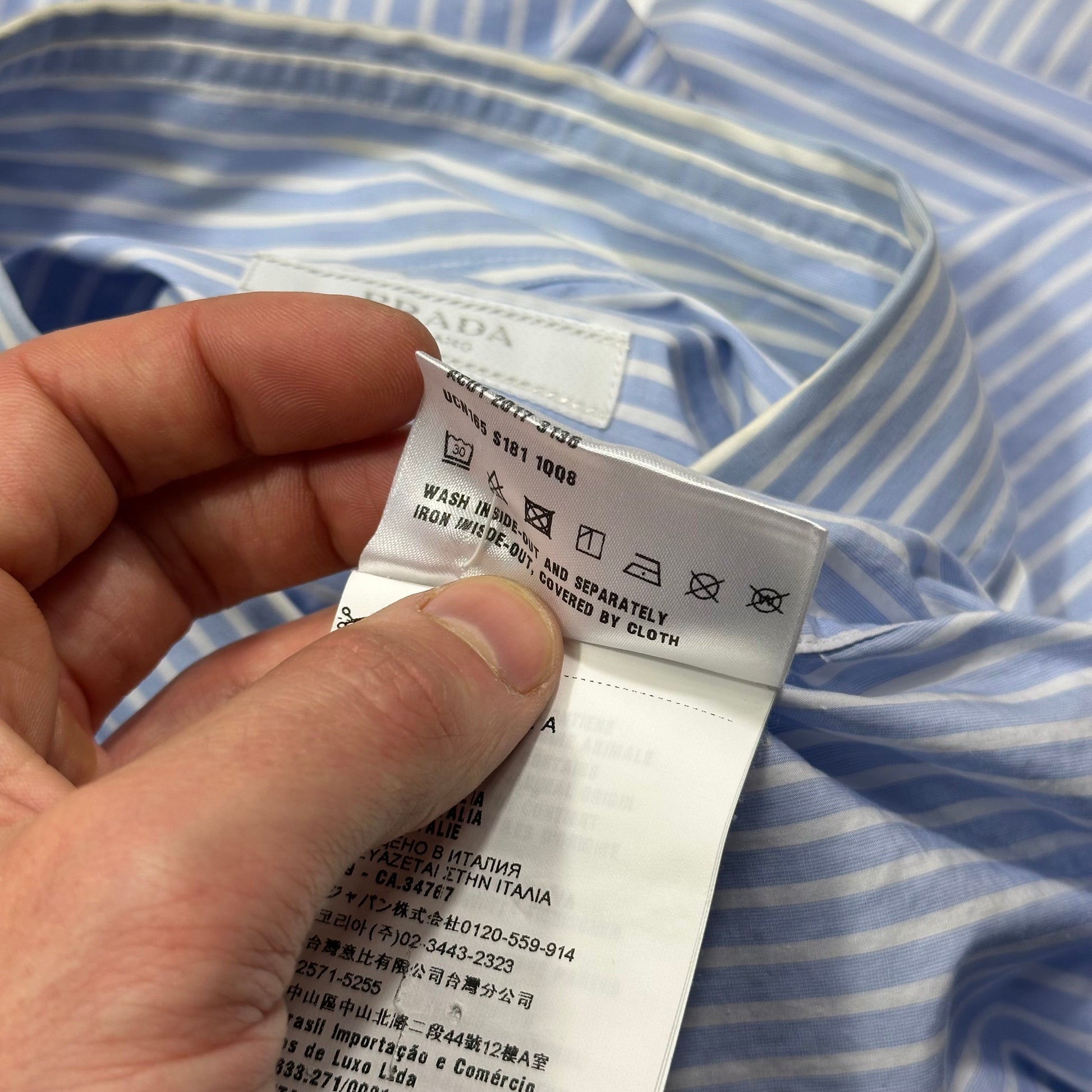 Very rare and sought after Prada Spring Summer 2018 James Jean artist rabbit comic print blue and white striped button down smart shirt, very unique rabbit comic print, synonymous with this season.