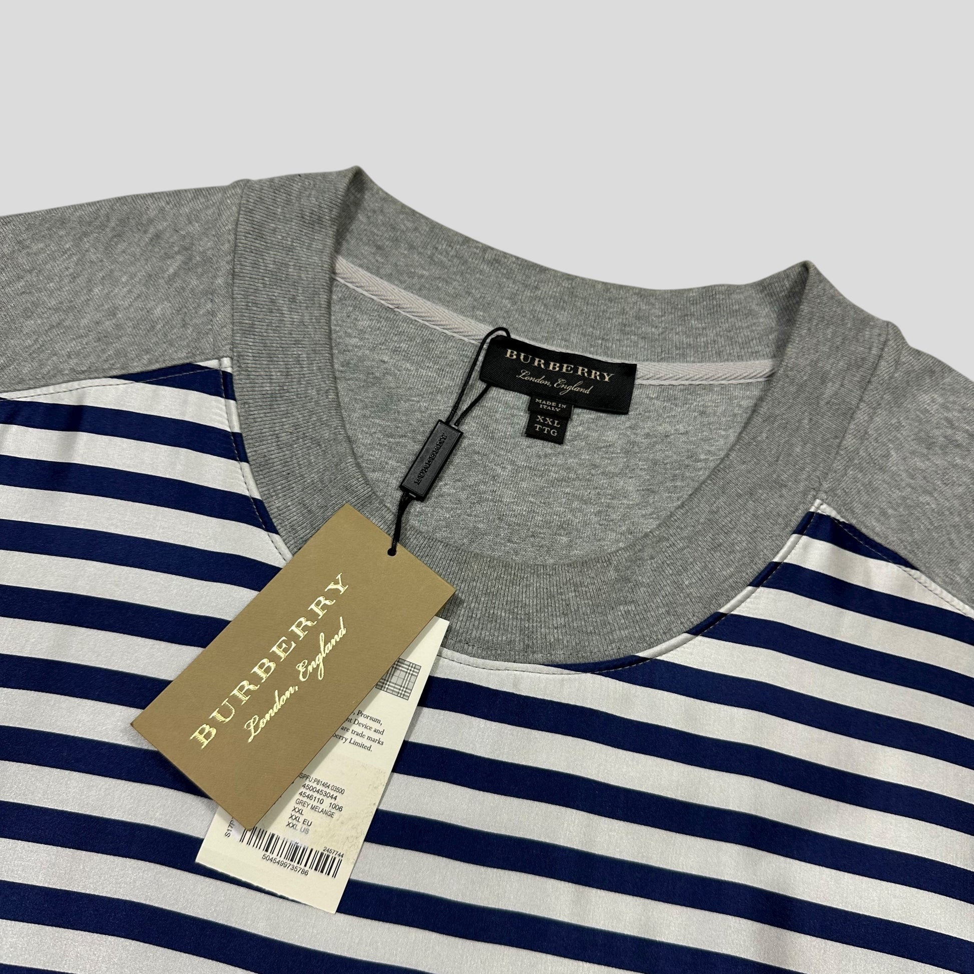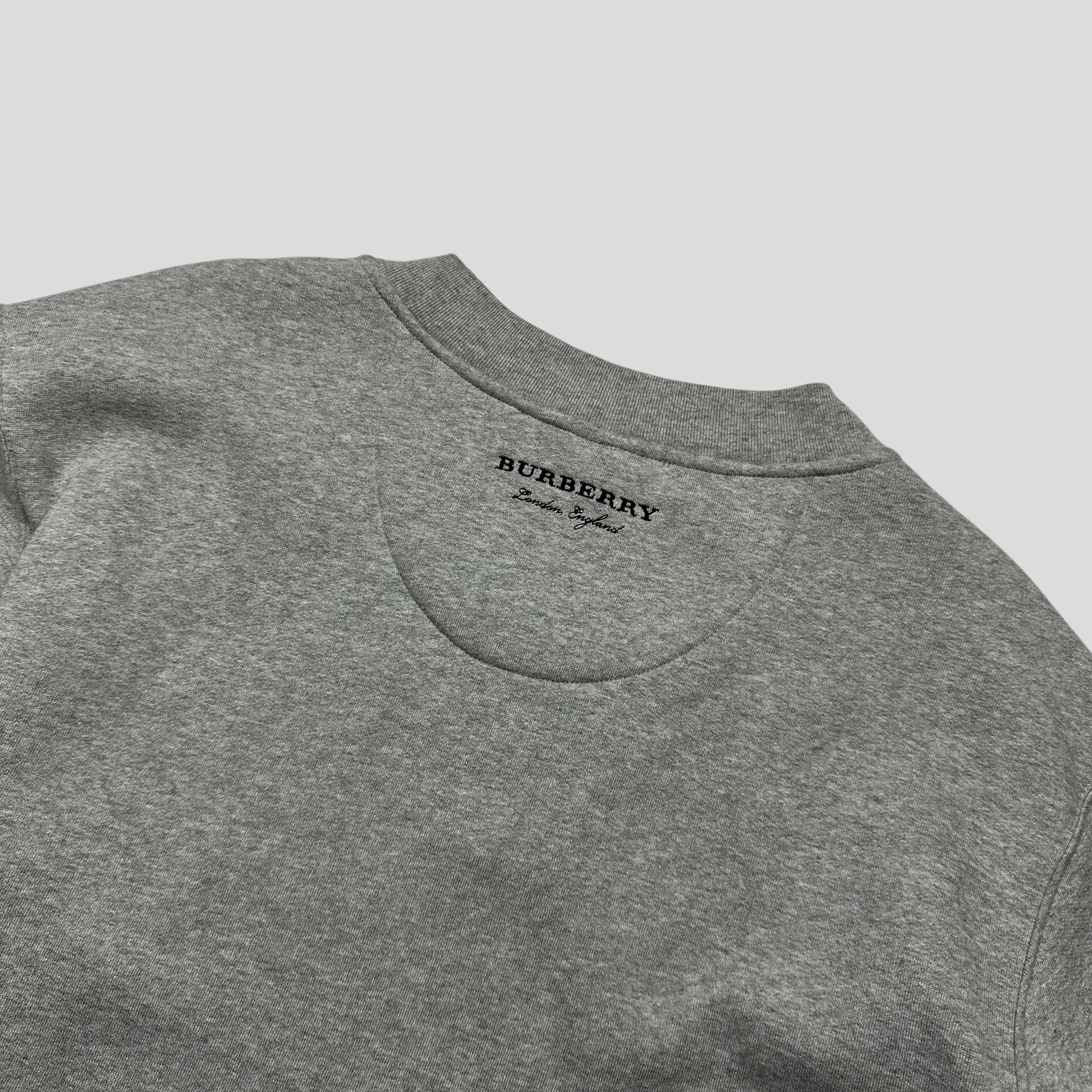 Burberry mainline 2017 grey marl sweatshirt with nylon navy and white striped panel to the front, embroidered Burberry logo to back neck, slight tail at the back.