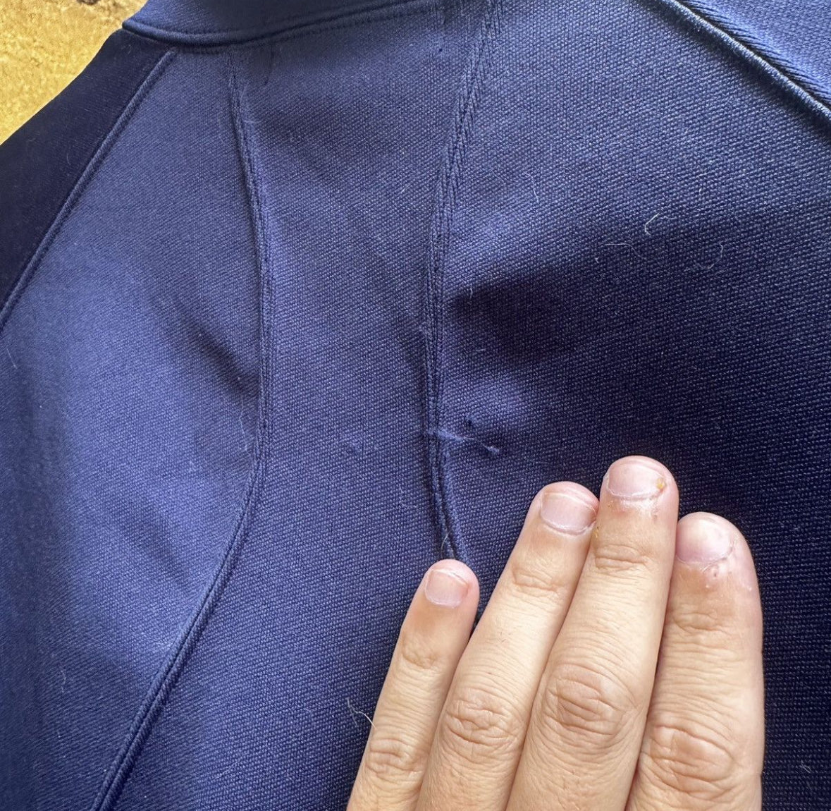 Lovely blue AD 2003 Comme Des Garcons Homme Plus polyester track jacket, unique slice panelling across the front, back and arms, sporty stretchy polyester material that’s also relatively warm, hand pockets to front.