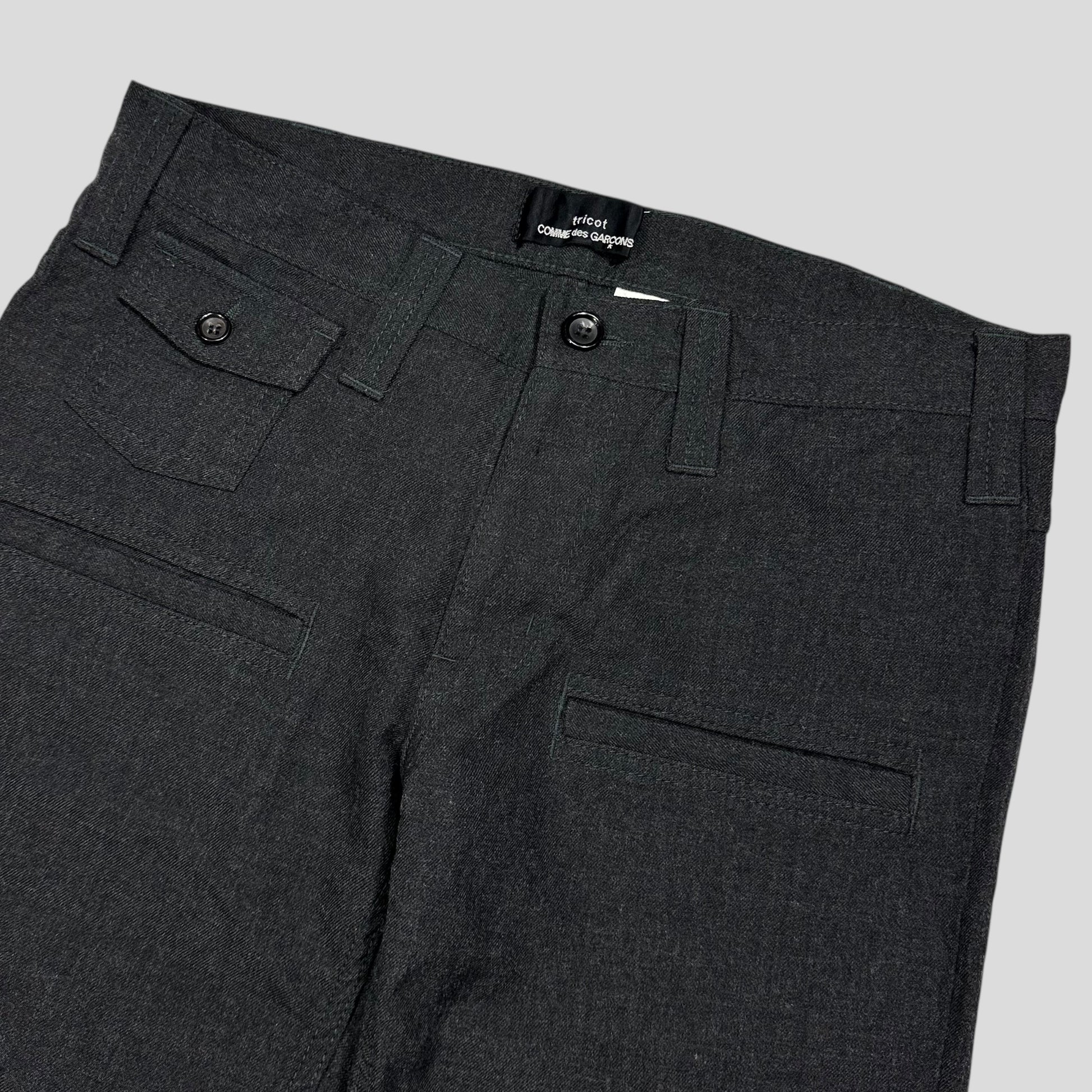 Rare 2007 CDG Tricot line unisex wool trousers, these are a baggy / straight fit, unique mini button pocket to front alongside some nice slot pockets, large carpenter style button back pockets.
