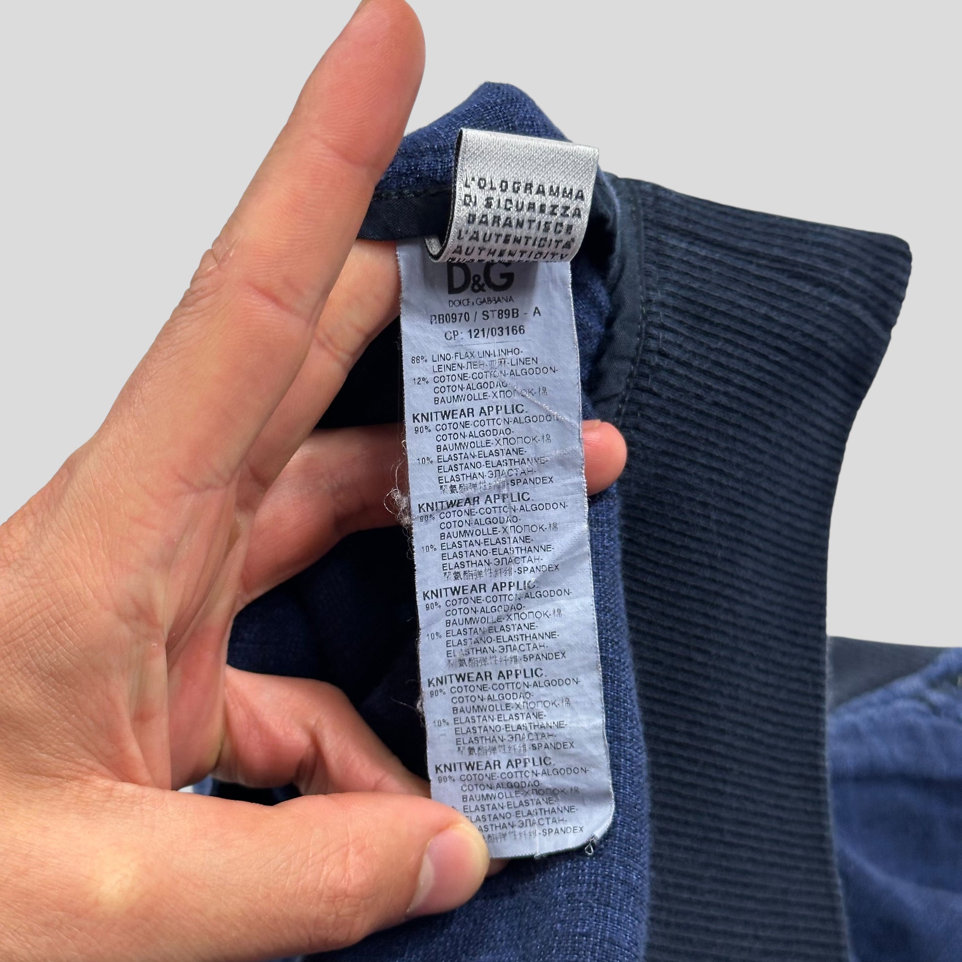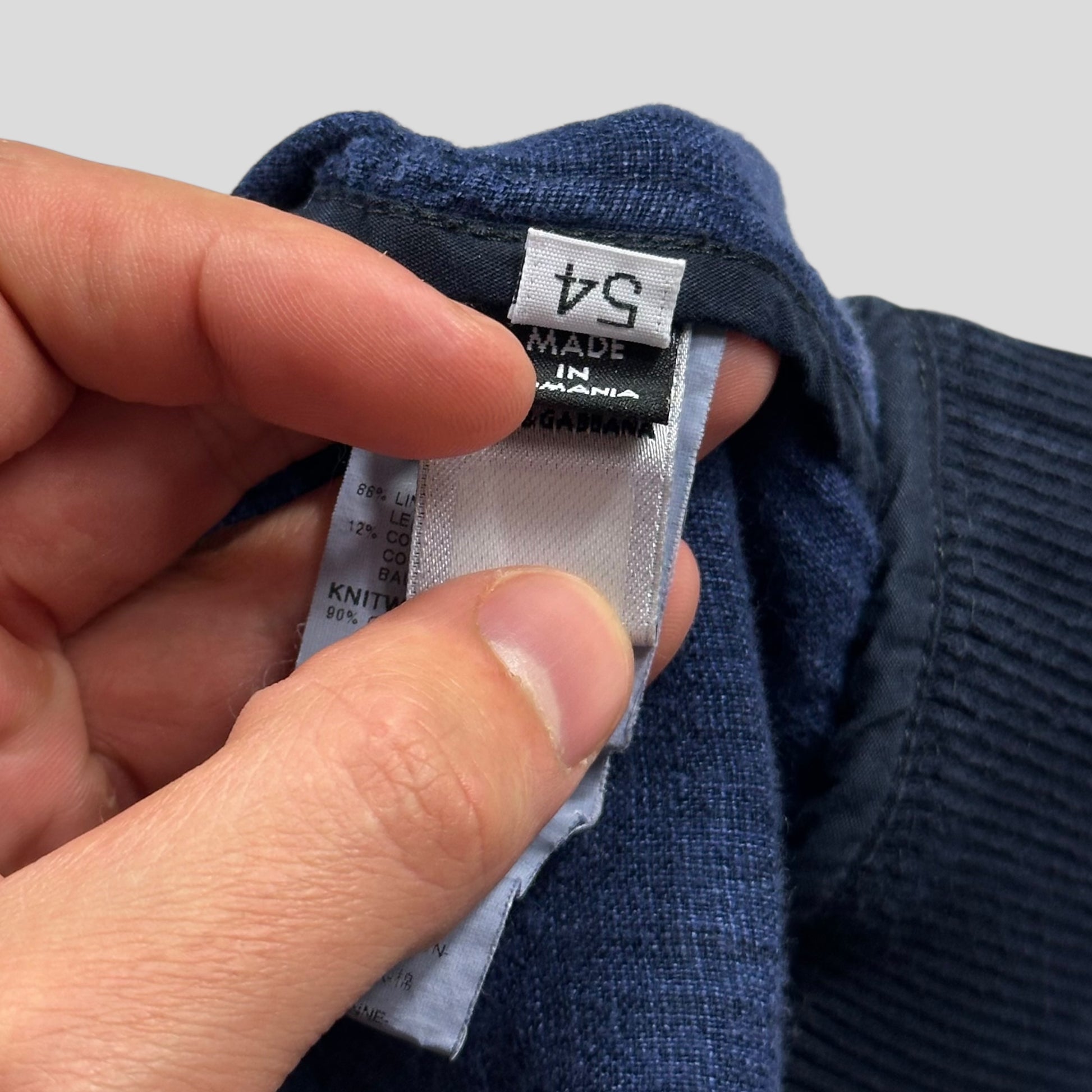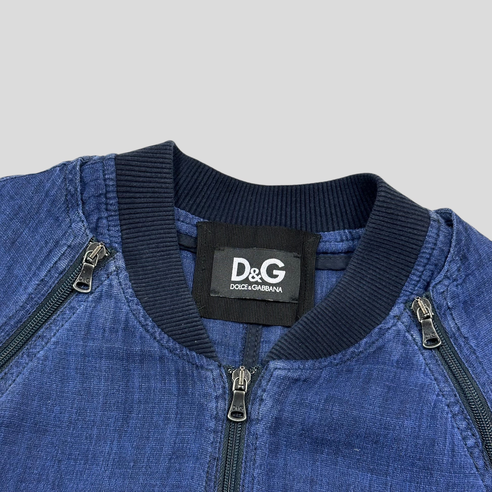 2000’s Dolce & Gabbana dark blue flax and cotton blend lightweight bomber jacket with multi zip functionality on the shoulders, button flap pockets to front.