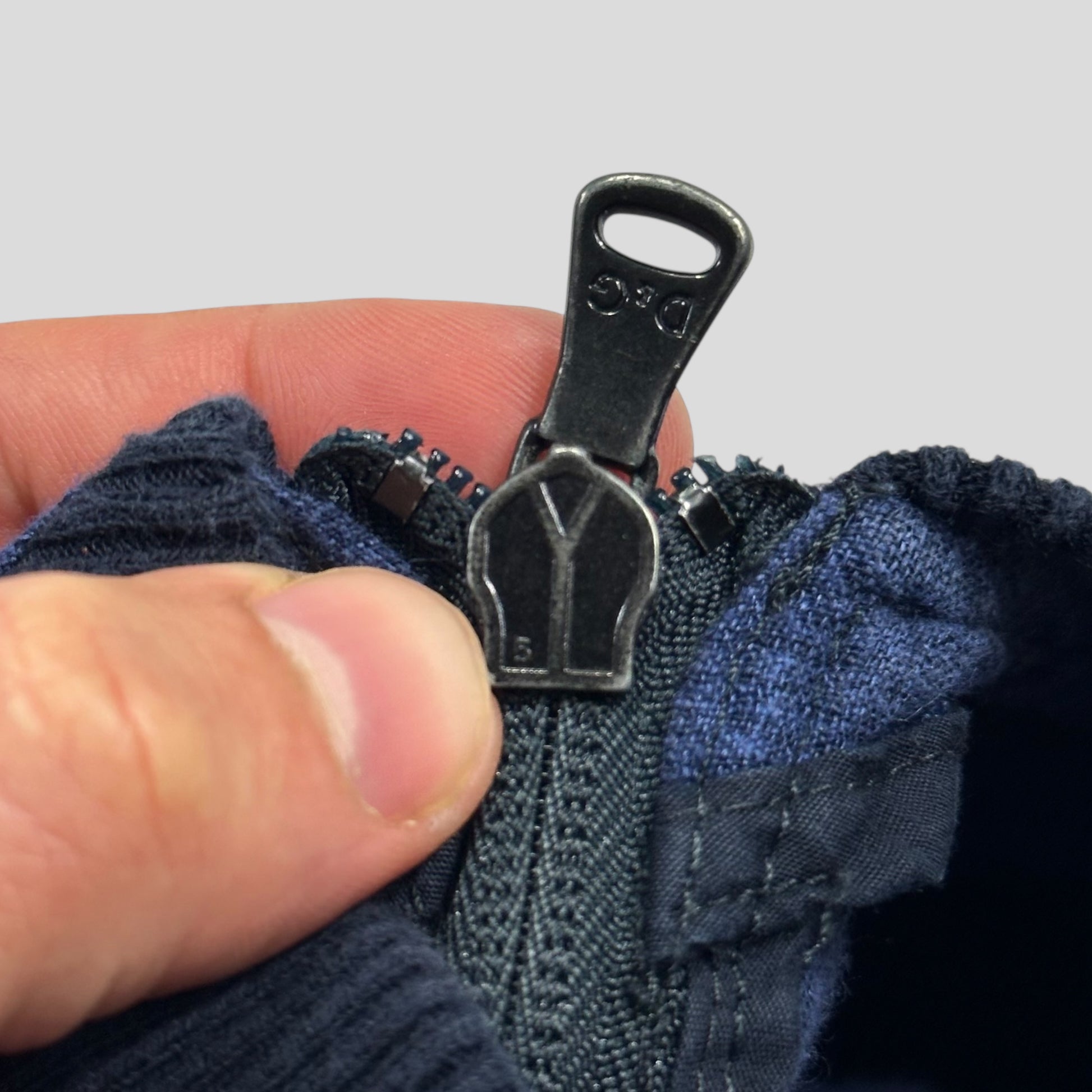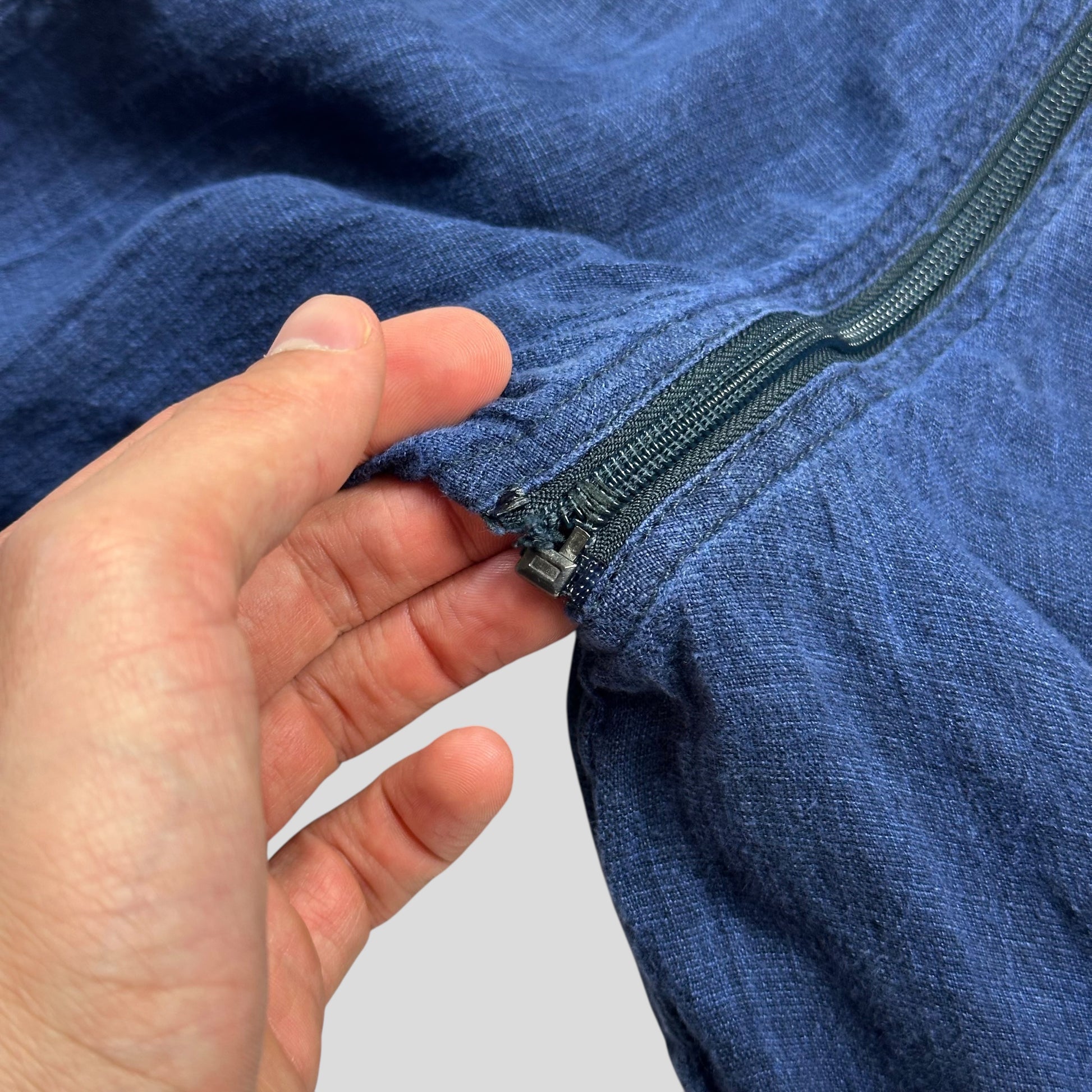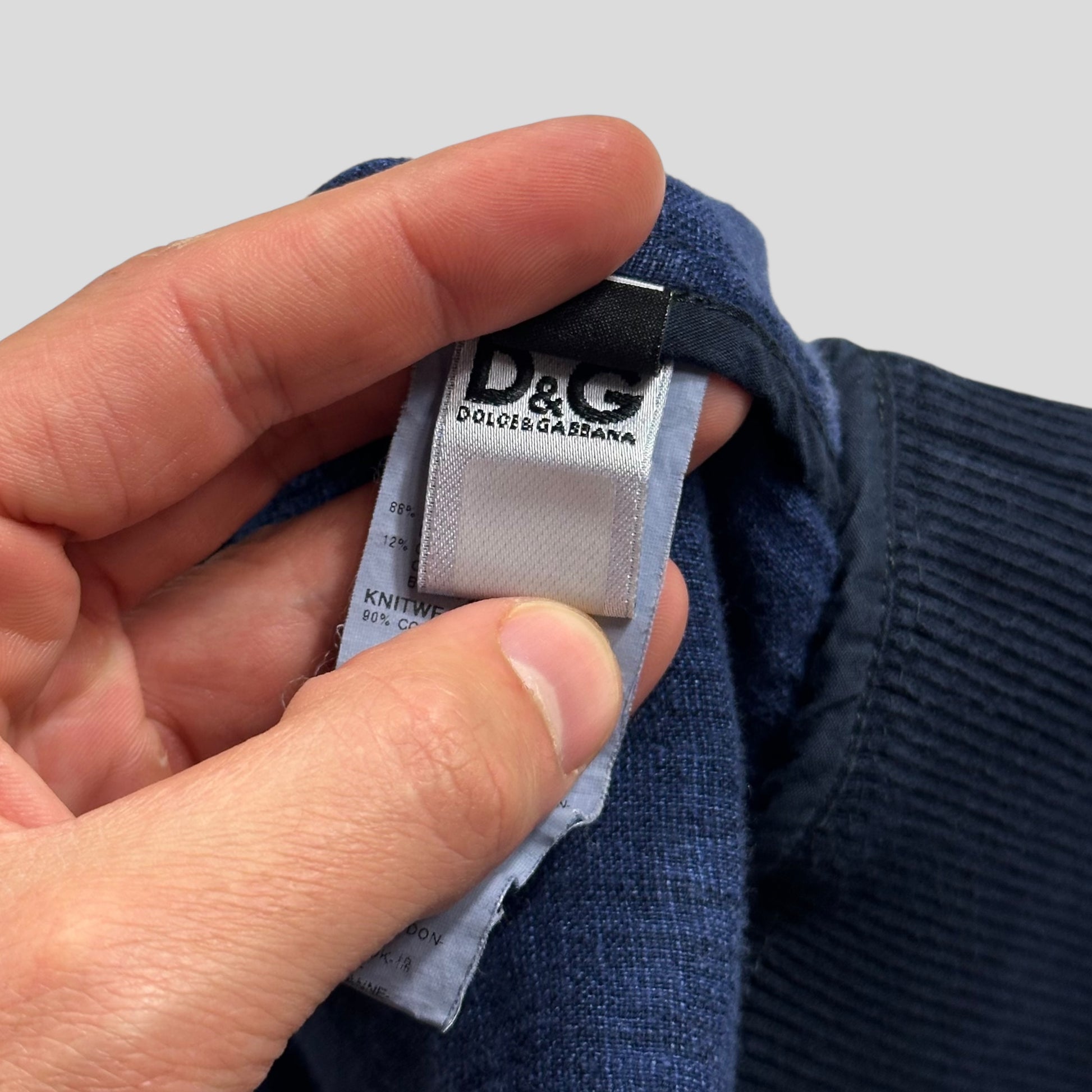2000’s Dolce & Gabbana dark blue flax and cotton blend lightweight bomber jacket with multi zip functionality on the shoulders, button flap pockets to front.