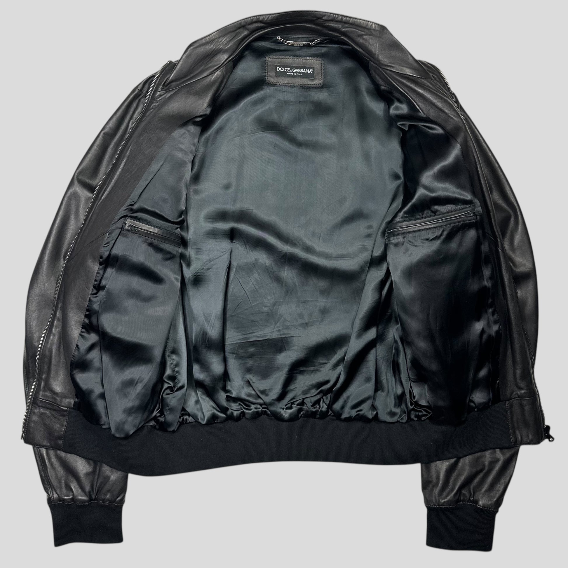 Very rare 2000’s Jet black Lambs Leather Dolce & Gabanna blouson jacket, beautifully constructed, made in Italy, tonnes of branded zip cargo pockets, thick soft hem and cuffs, beautiful silky suit jacket like lining.