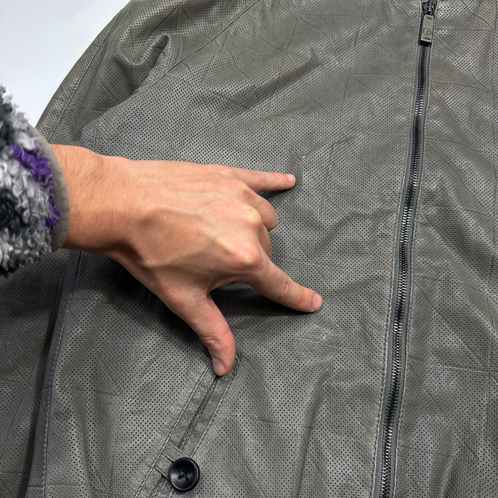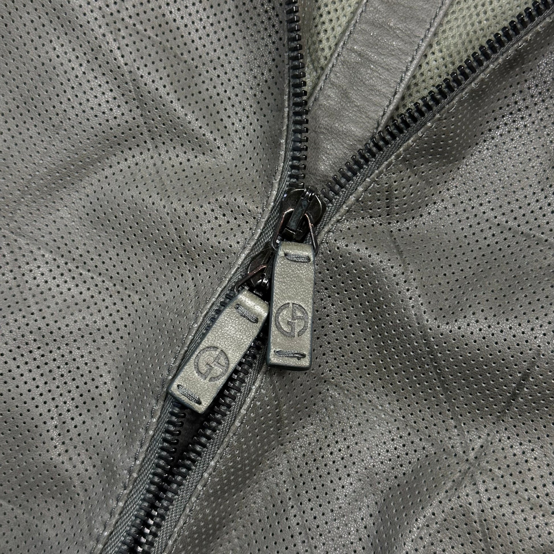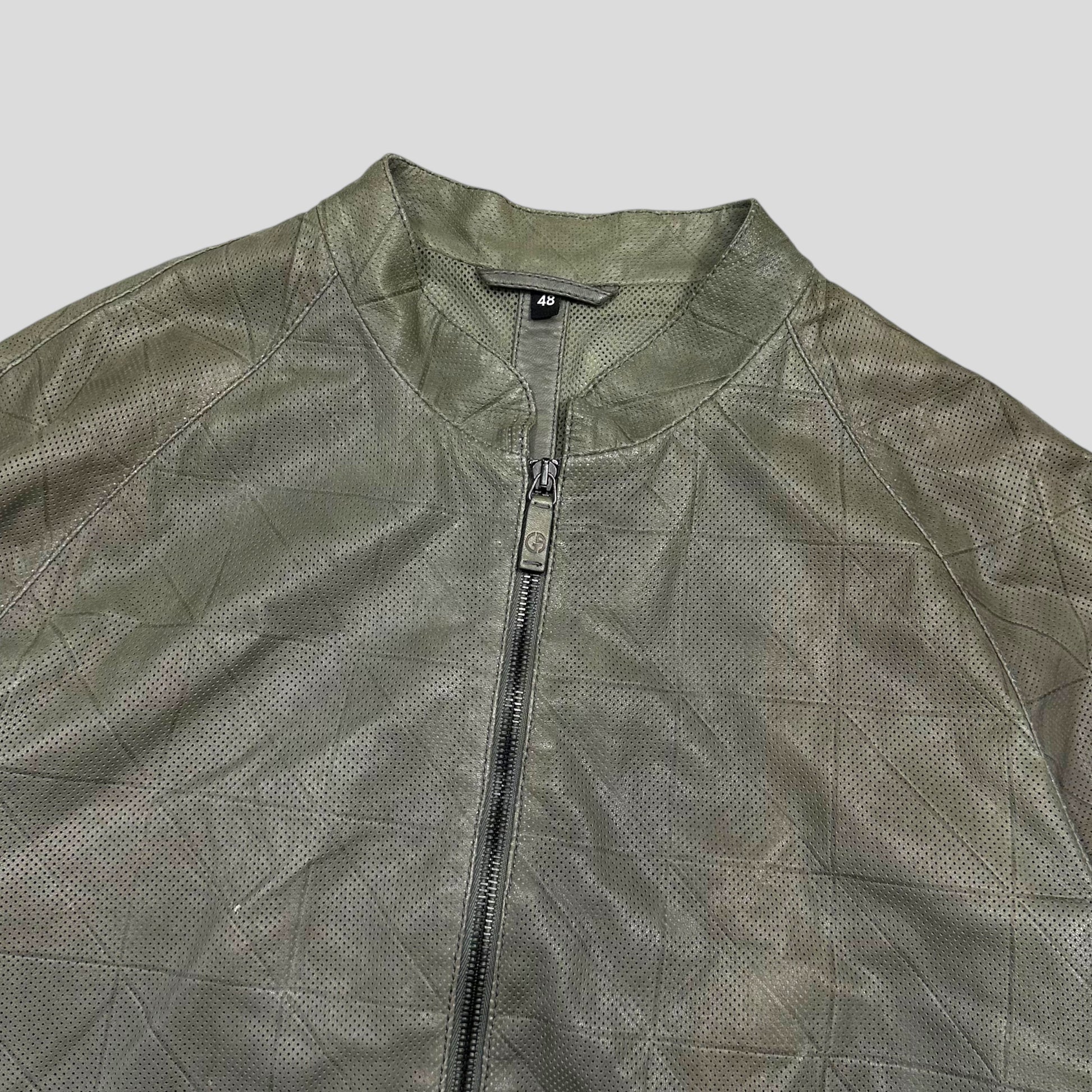 Extremely rare Giorgio Armani mainline lightweight lambs leather bomber jacket, lovely cropped sporty moto cut, unique perforated mesh leather with all over embossed grid pattern, soft khaki grey colour, dual branded lampo zips, made in Italy, buttoned cuffs and hand pockets, inside pockets and mesh lining.