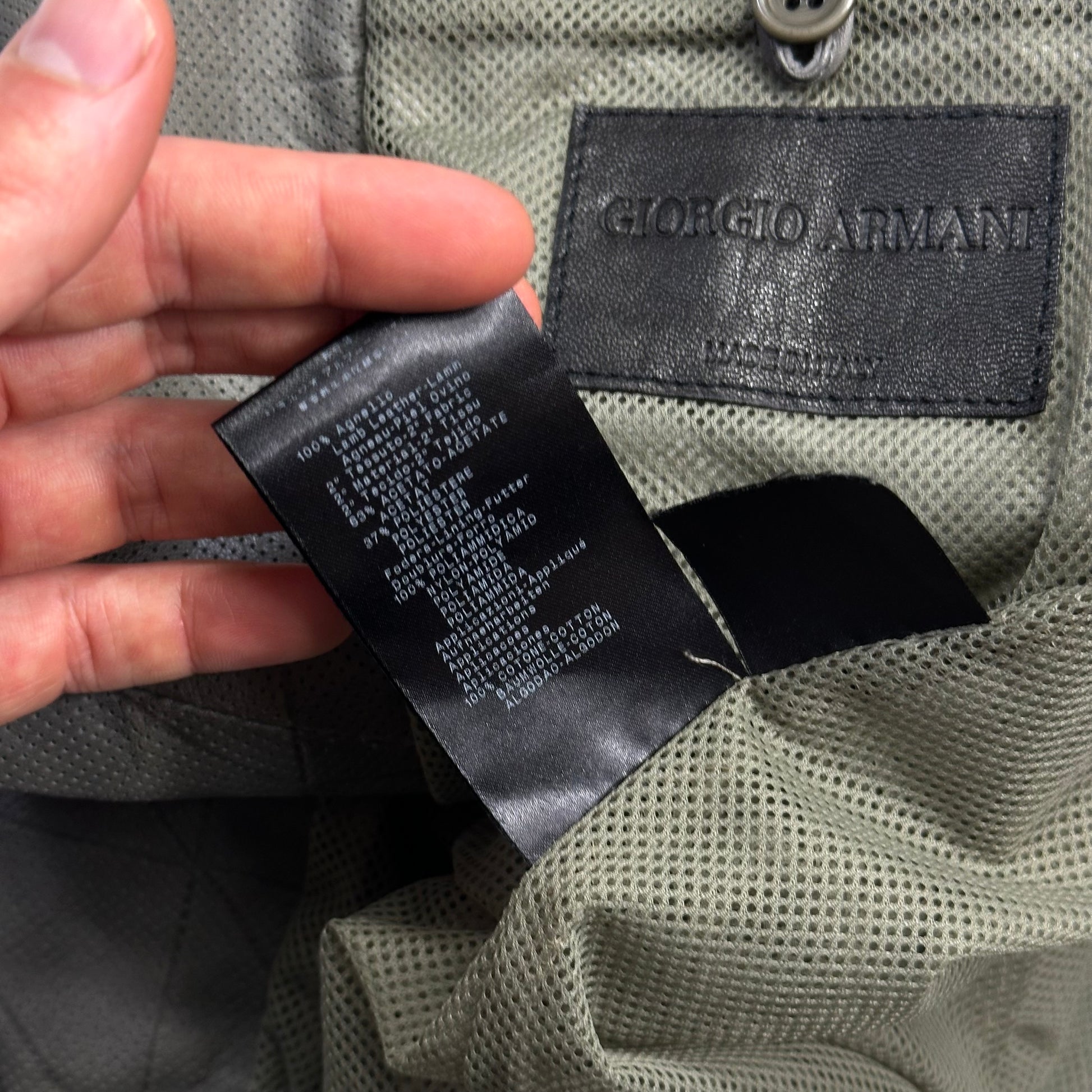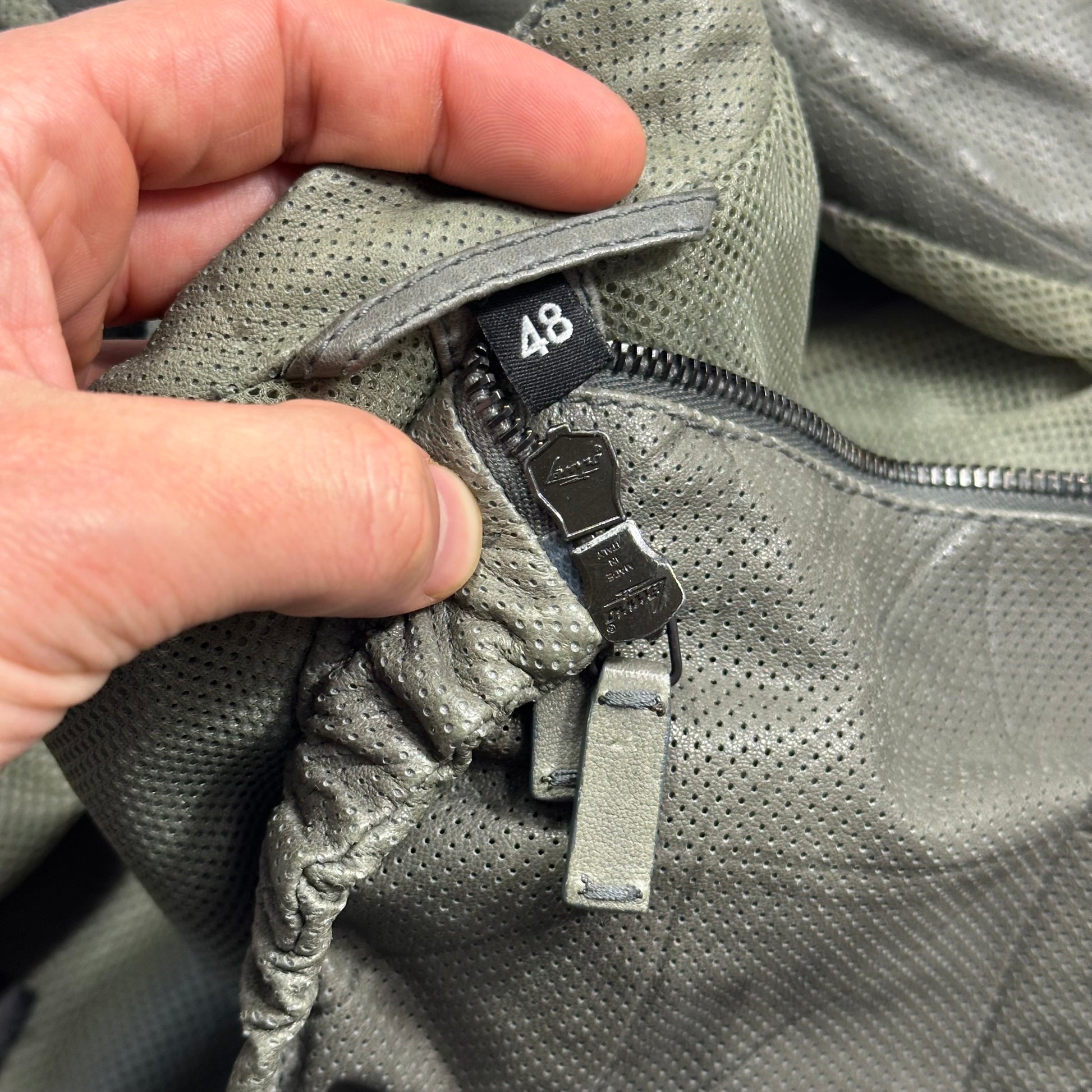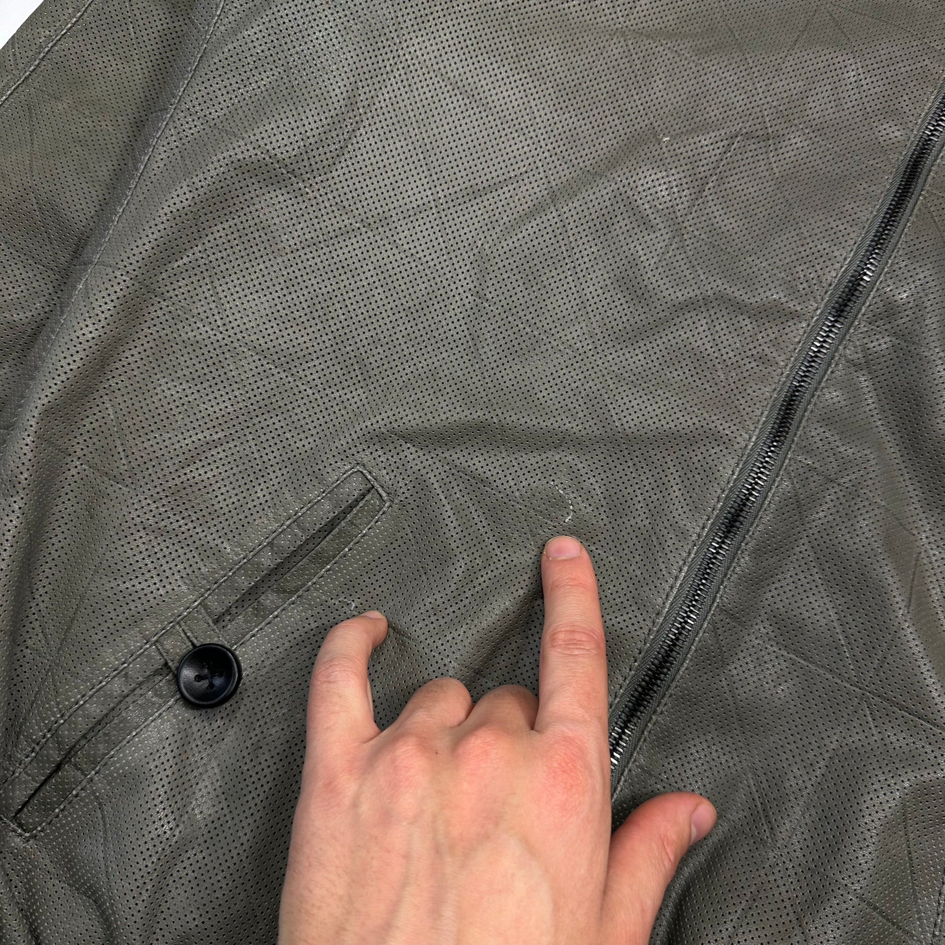 Extremely rare Giorgio Armani mainline lightweight lambs leather bomber jacket, lovely cropped sporty moto cut, unique perforated mesh leather with all over embossed grid pattern, soft khaki grey colour, dual branded lampo zips, made in Italy, buttoned cuffs and hand pockets, inside pockets and mesh lining.
