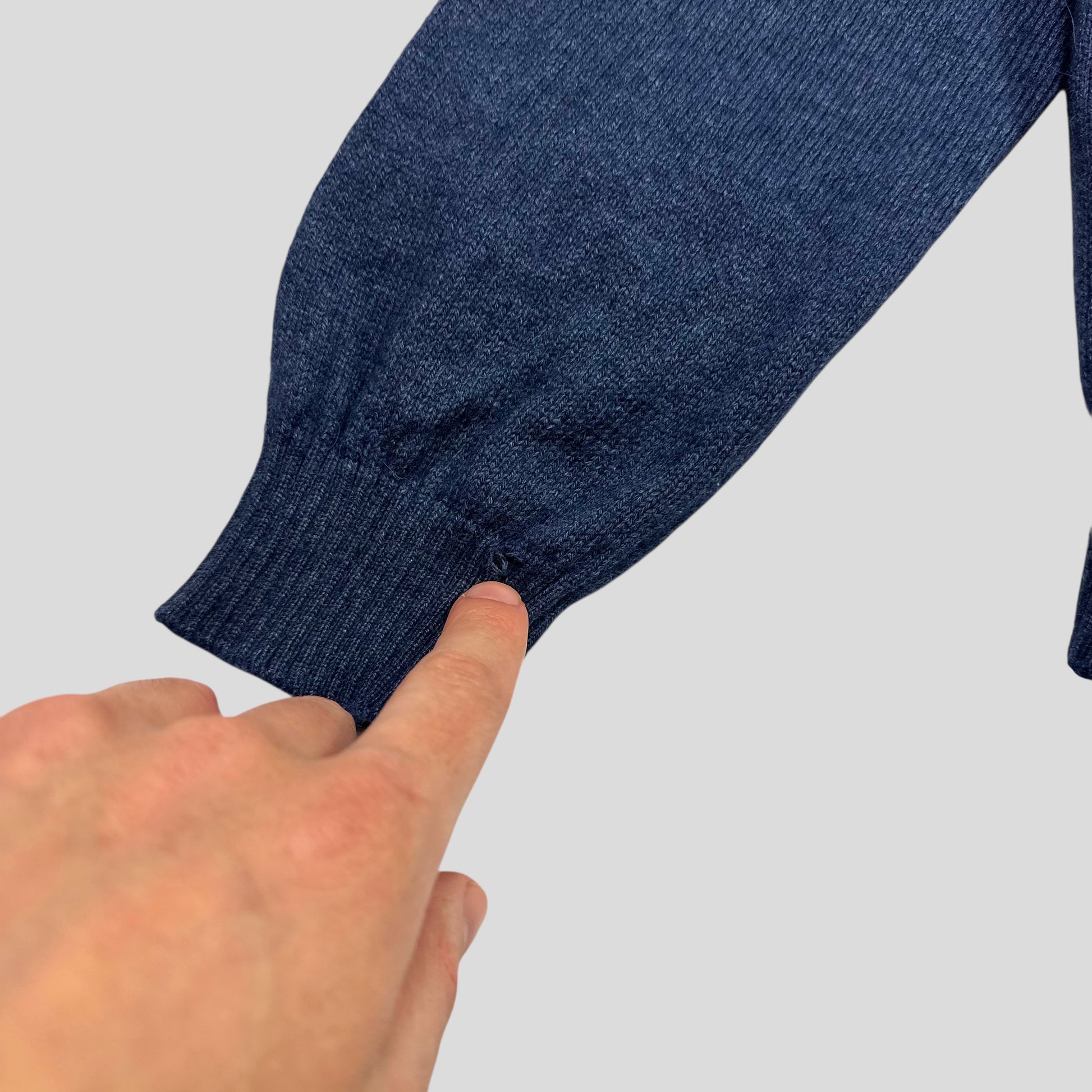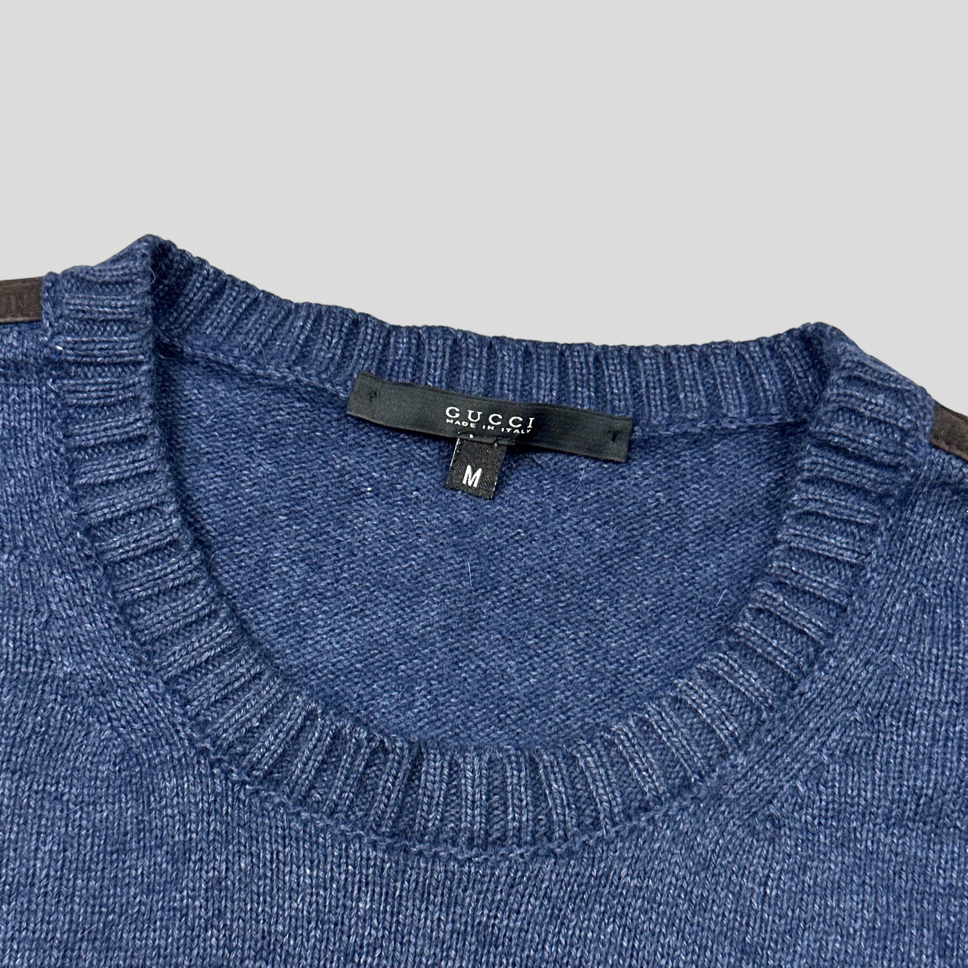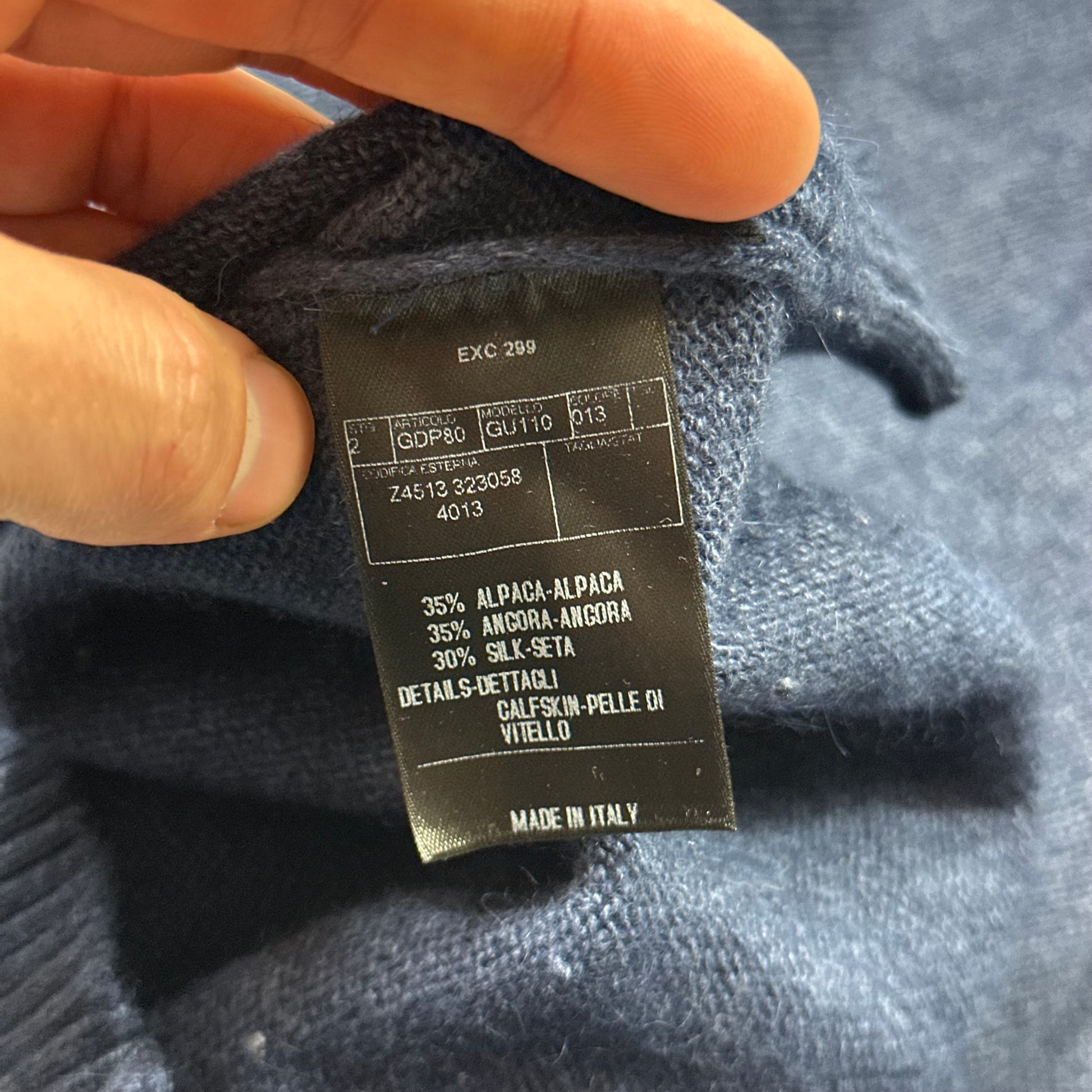 Beautiful Gucci Blue Mélange speckled knitted sweatshirt, incredible materials constructed from an ultra soft blend of Alpaca and Angora wool with silk, leather detailing to shoulder and Gucci italic logo tab to side.