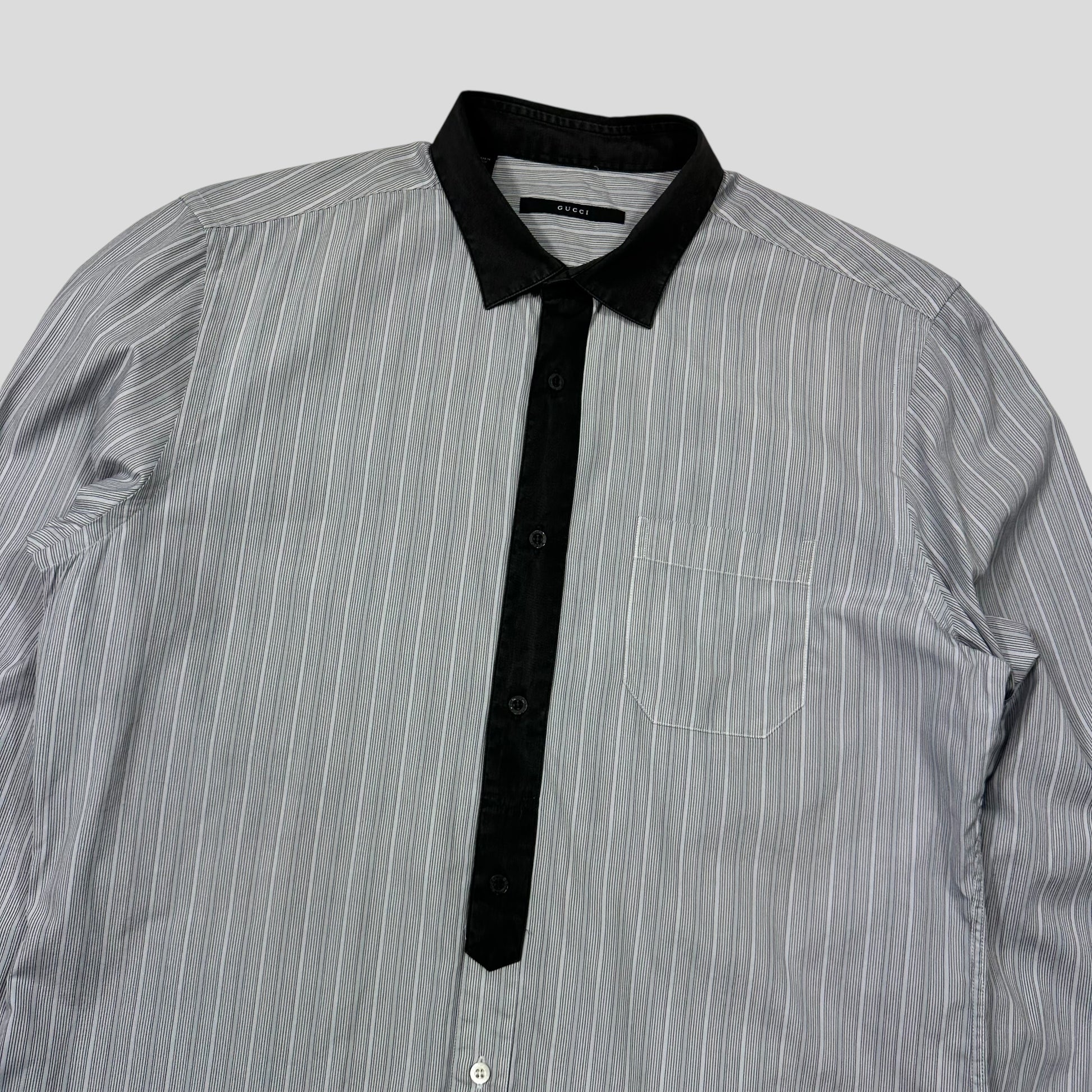 Gucci made in Italy grey striped button up plaquette shirt with charcoal detailing.