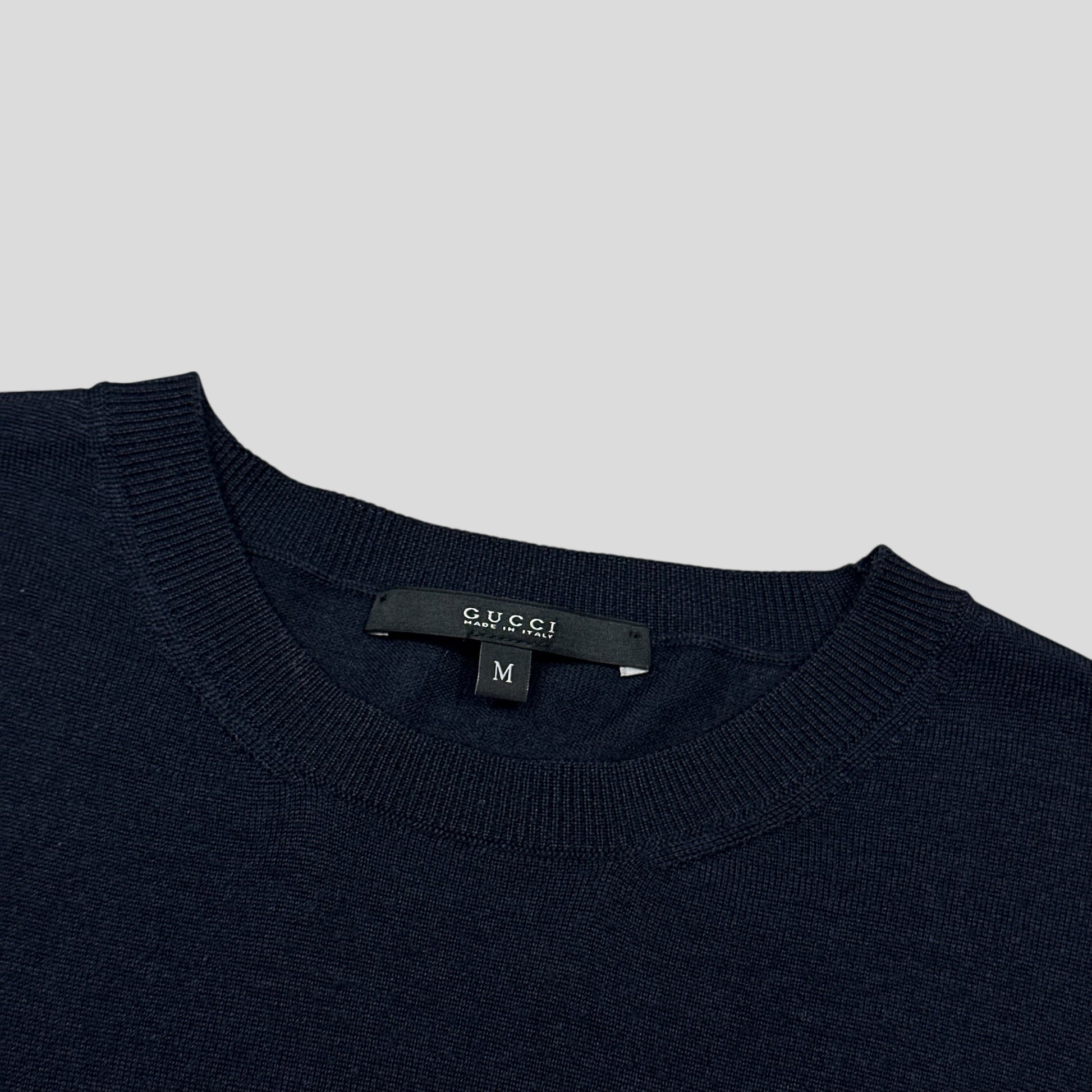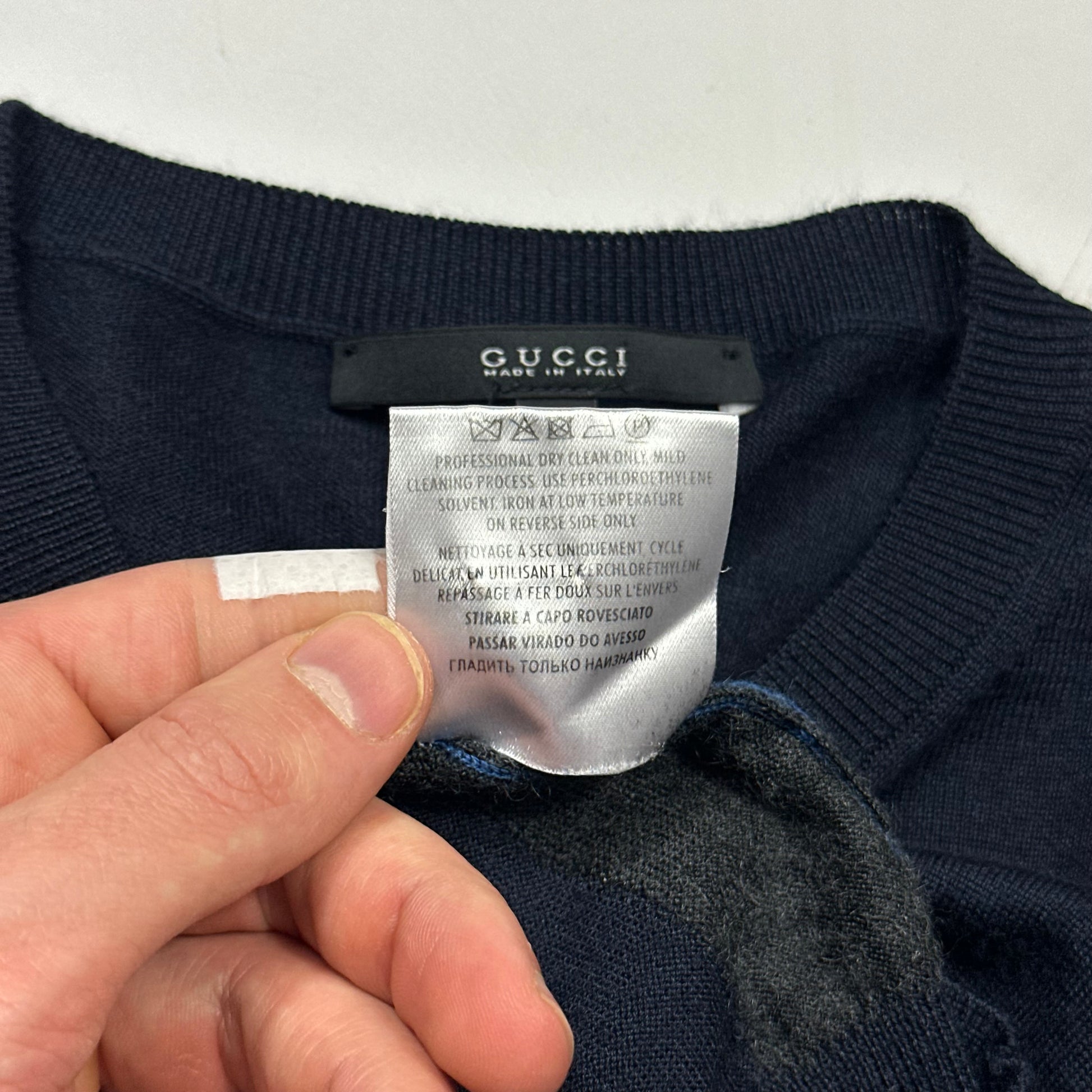 Beautiful 2010 era Gucci by Frida Giannini dark navy lightweight knit jumper with grey and blue panels, incredible material blend of silk, cashmere and wool, so soft and silky and holds great shape, lovely simple panelling with a perfect choice of colours.
