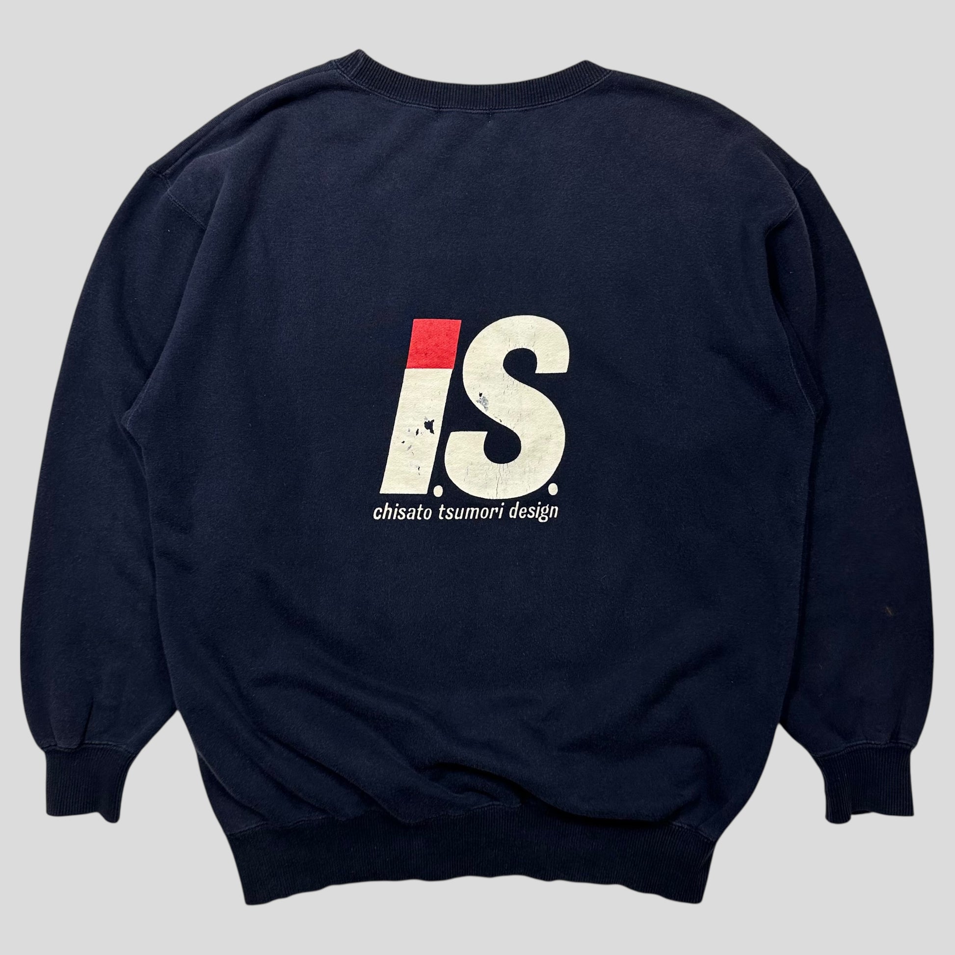 1980’s Issey Sport by Issey Miyake Chisato Tsumori Design I.S. Back print spellout graphic jumper, lovely washed navy colourway, mega rare, made in Japan.