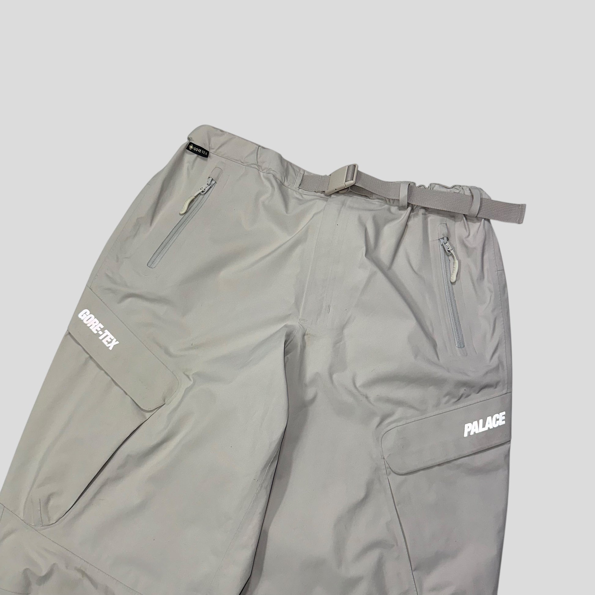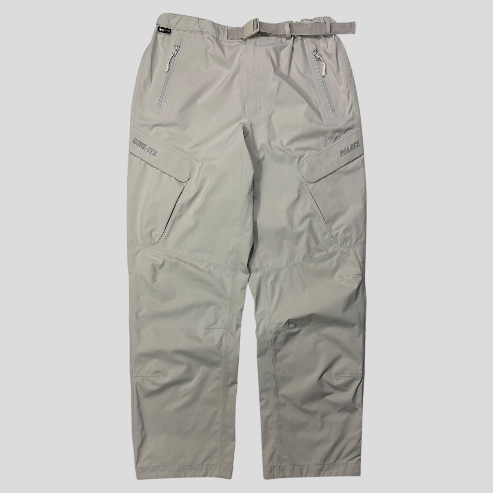Rare 2023 Stone light grey Palace cargo trousers, completely waterproof and windproof taped seam, crazy quality, 3m reflective palace and Goretex logos, adjustable cuffs and laminated zip pockets.