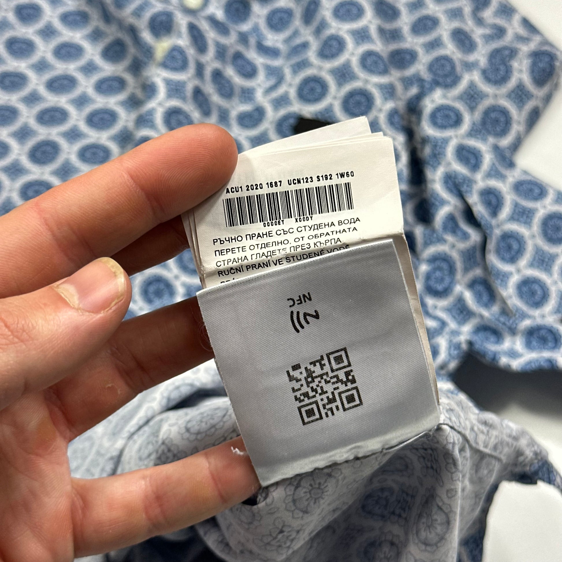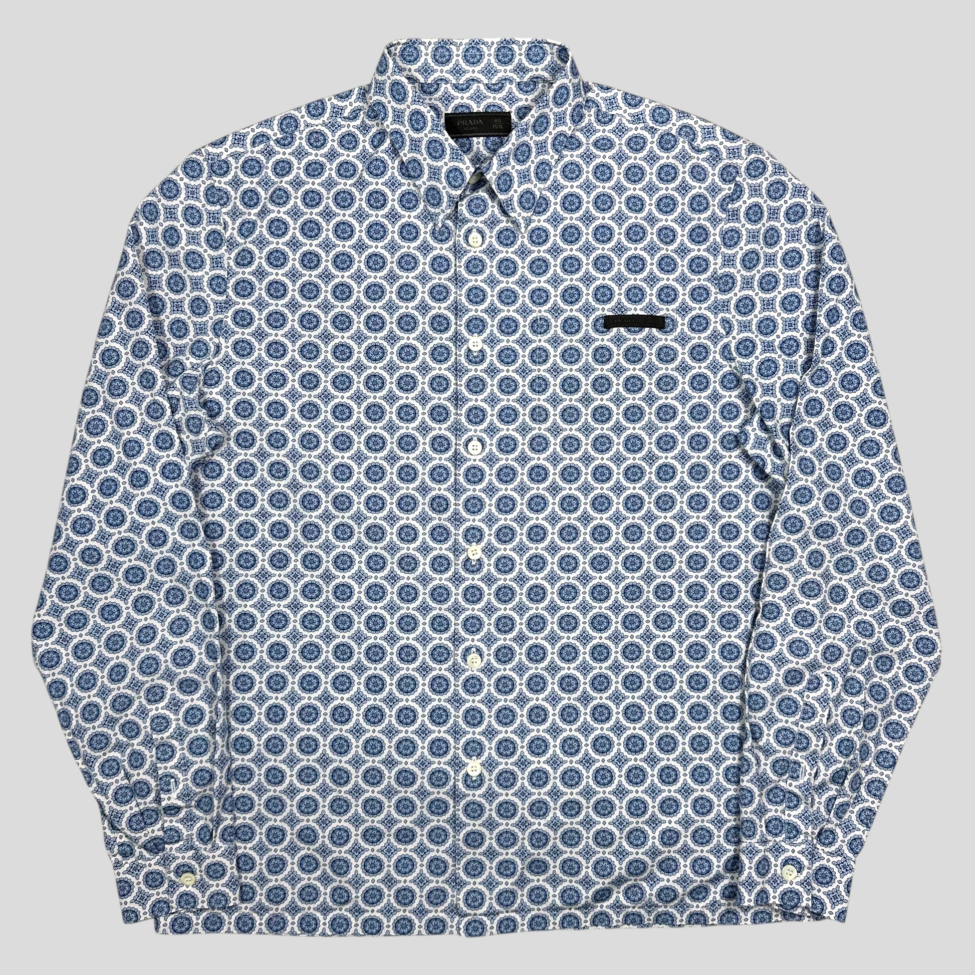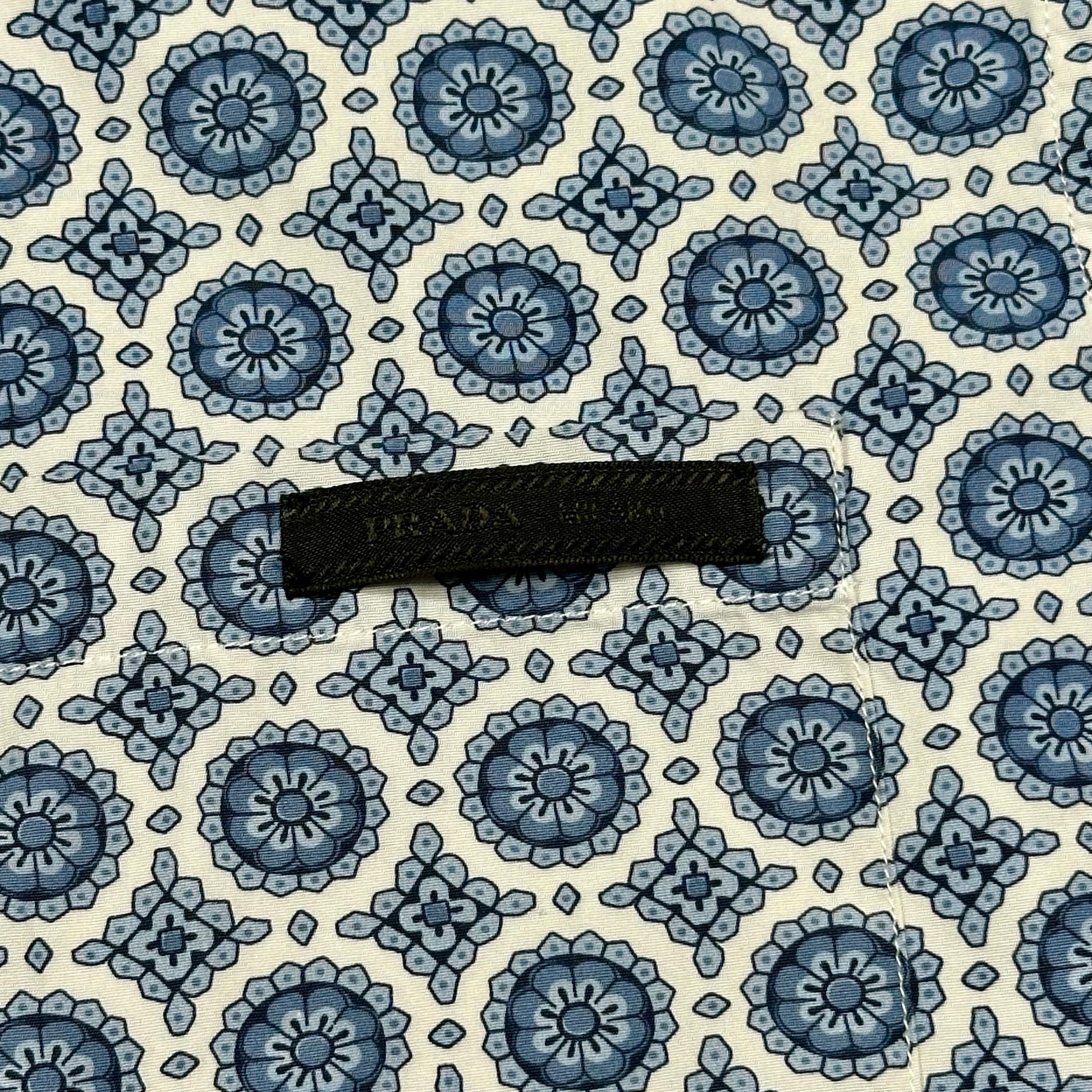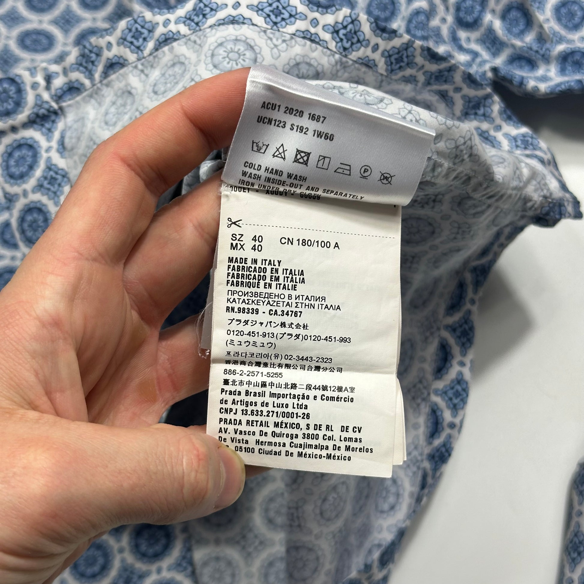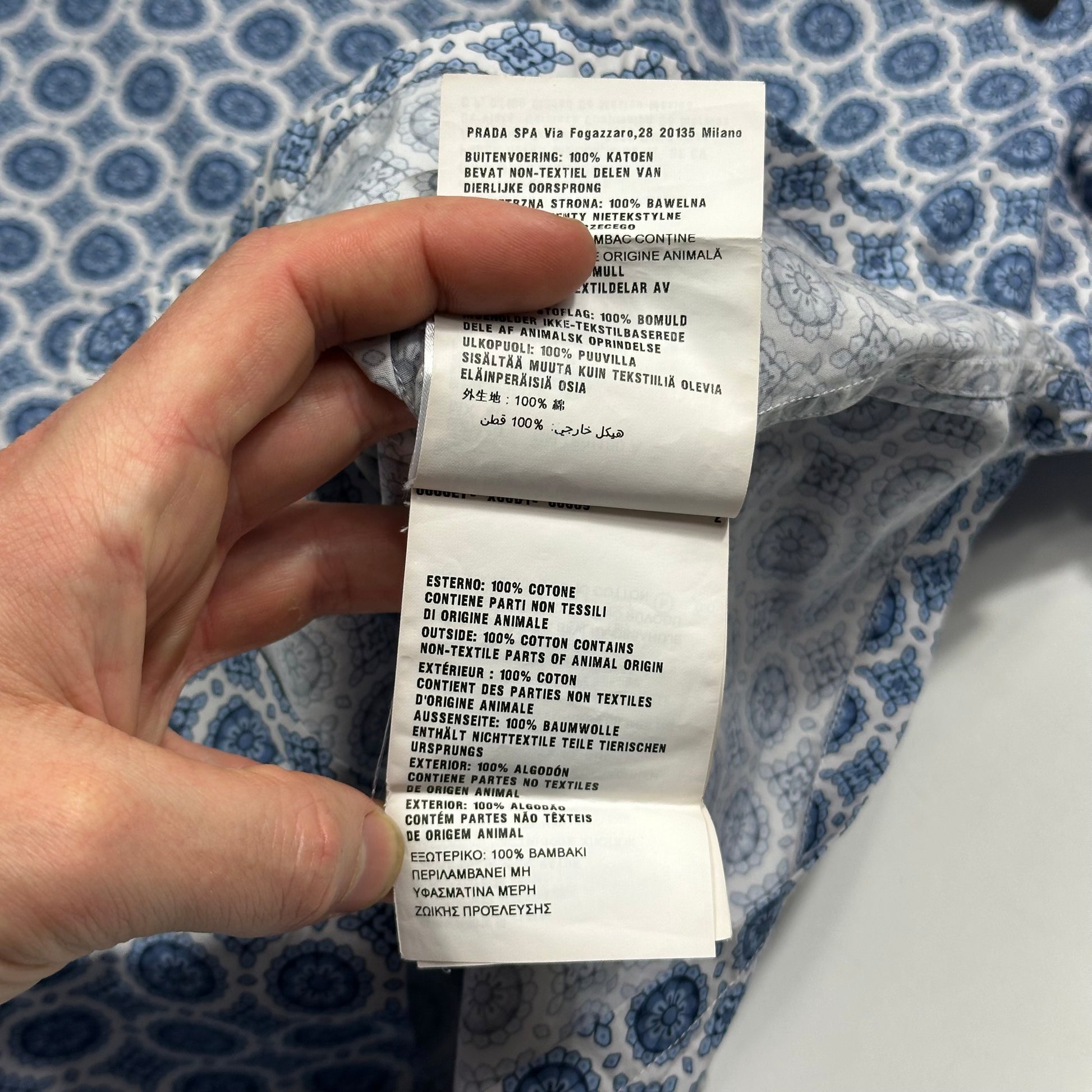 Rare 2020 Prada mainline Milano white cotton and baby blue Persian geometric graphic print cotton long sleeve shirt, black Prada Milano logo tab to chest pocket, straight hem.