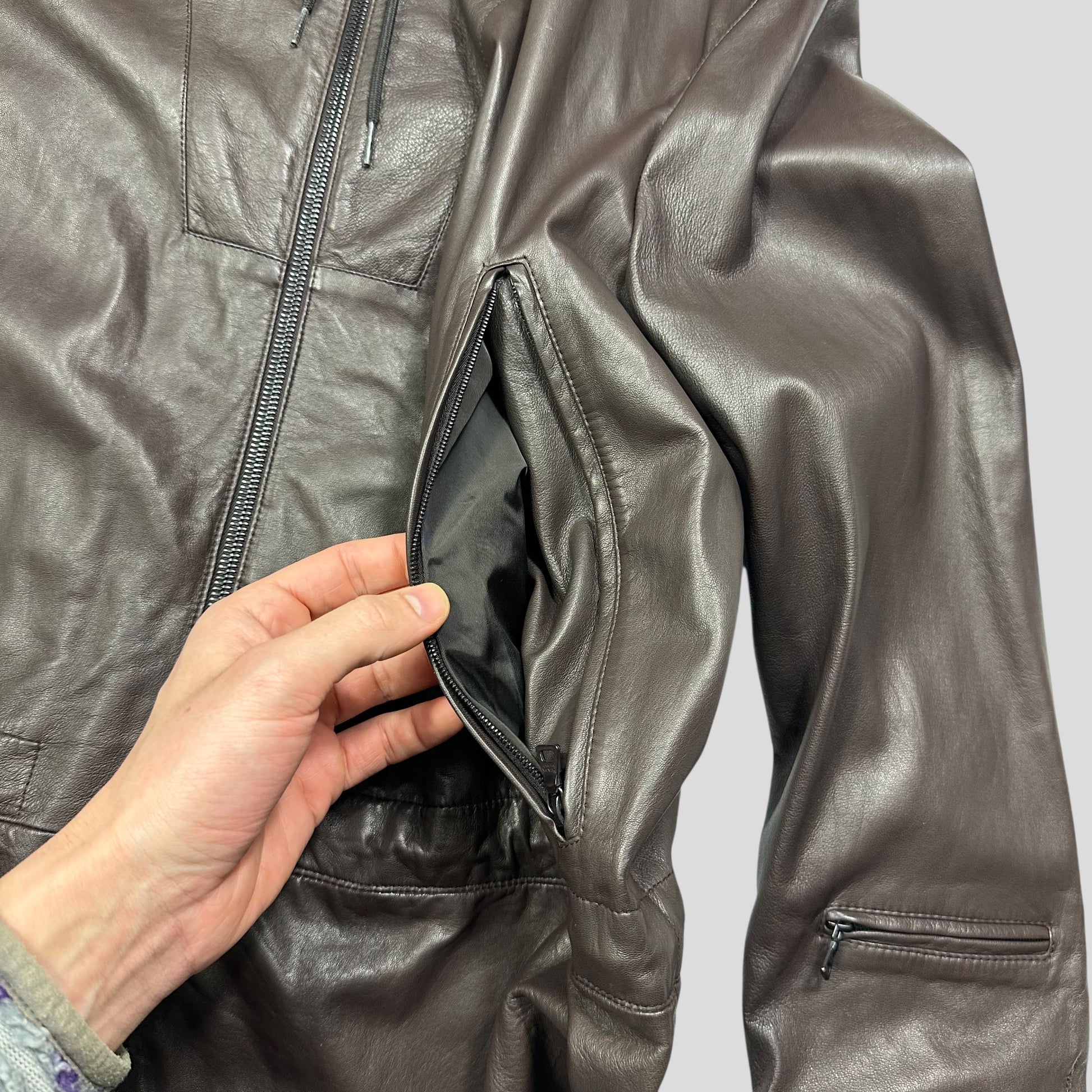 Beautiful early 2000’s dark brown Prada mainline lambskin Nappa leather field jacket, incredibly buttery and soft leather, unique stash zip pocket to wrist, lovely detailing throughout, drawstring to fit at waist and hood, big zip hands pockets, adjustable buttons at wrist, perfected minimalism
