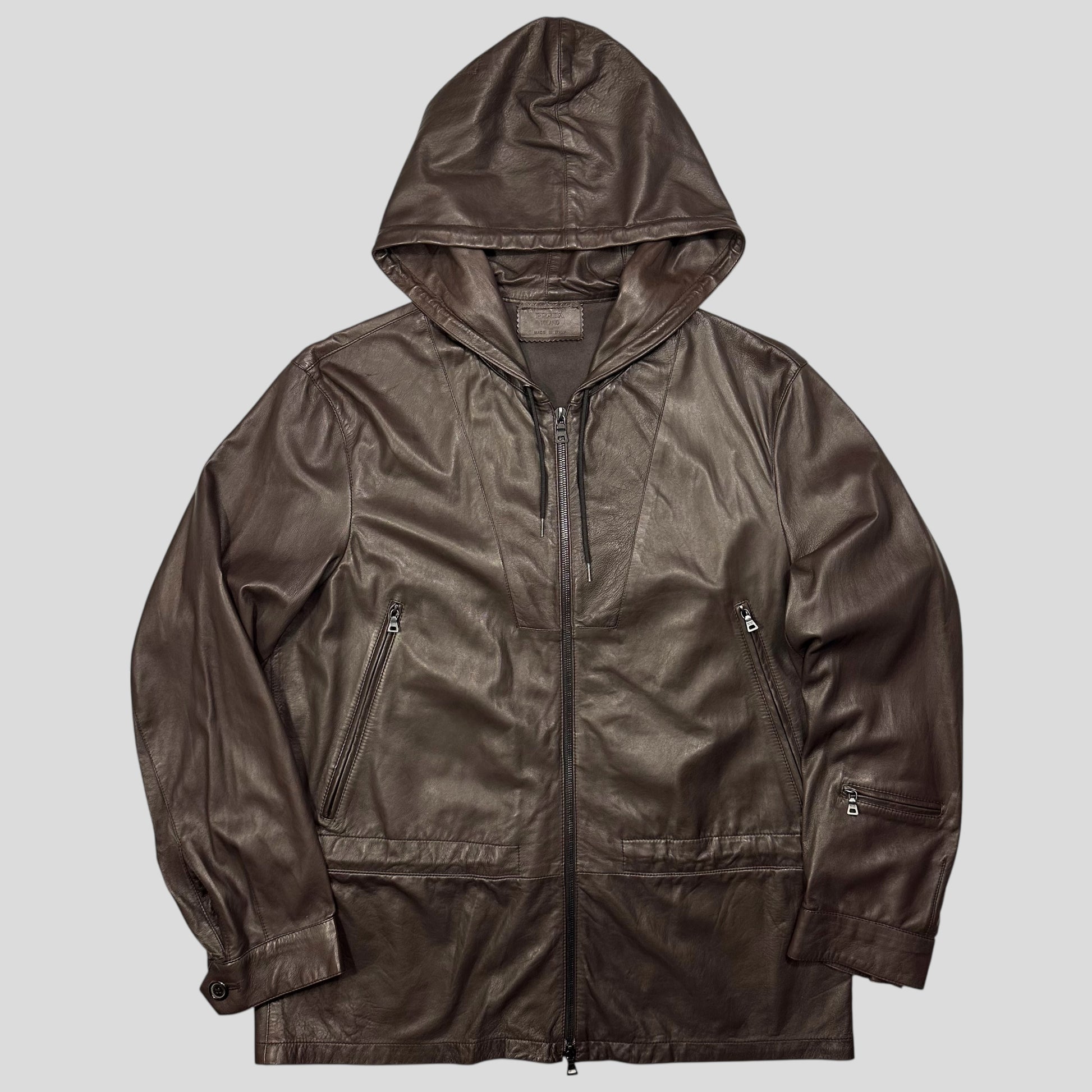 Prada Milano 00’s Nappa Leather Stash Pocket Hooded Jacket - L