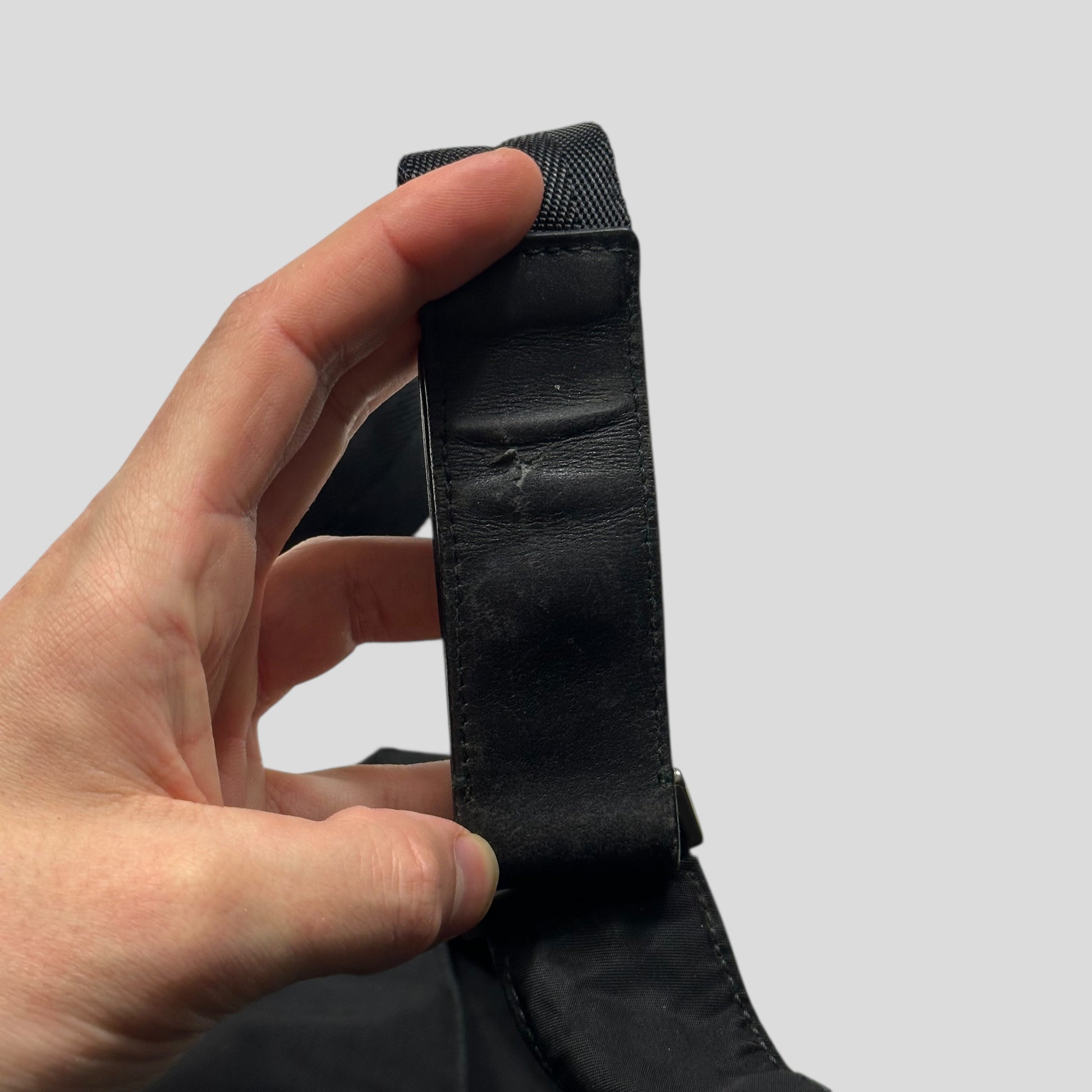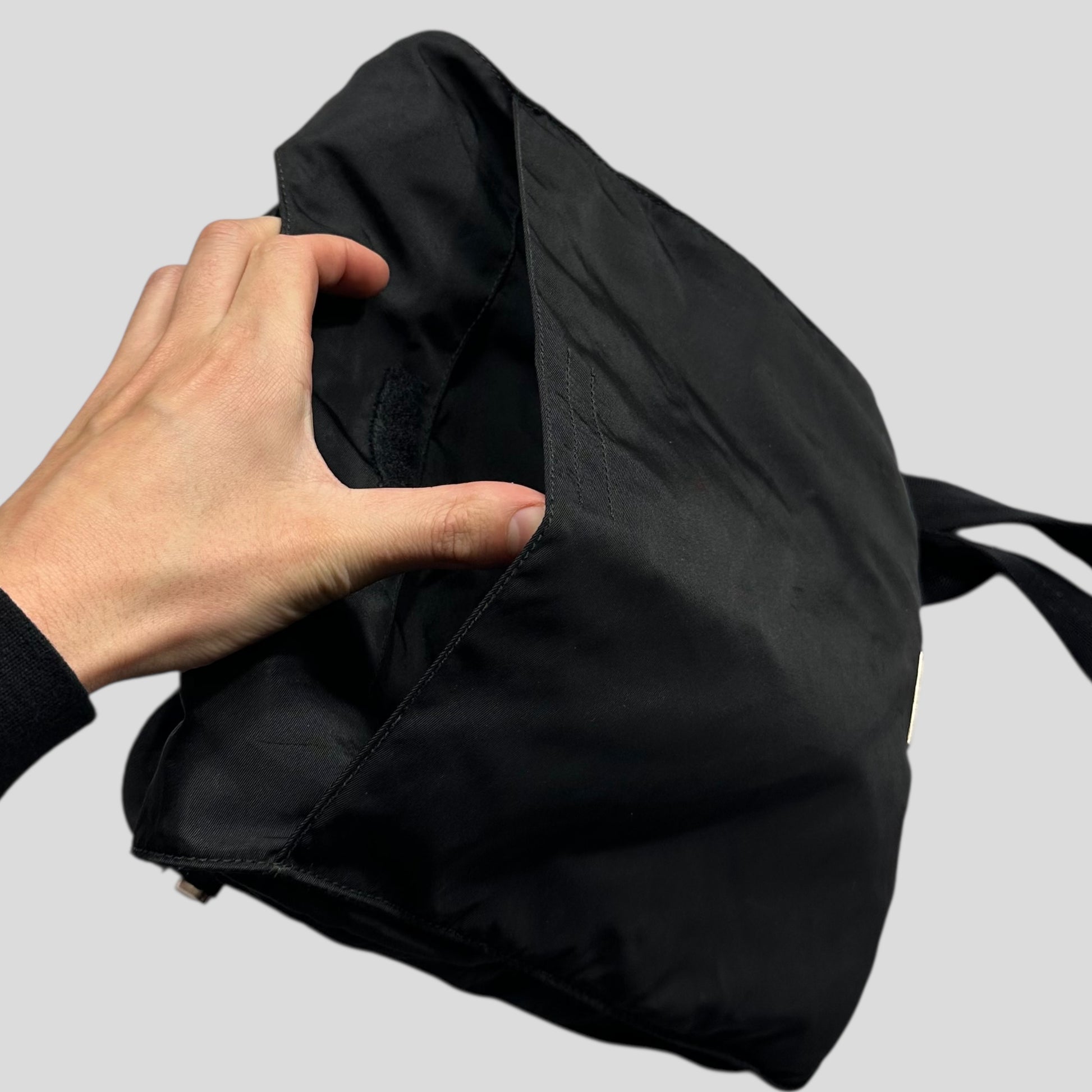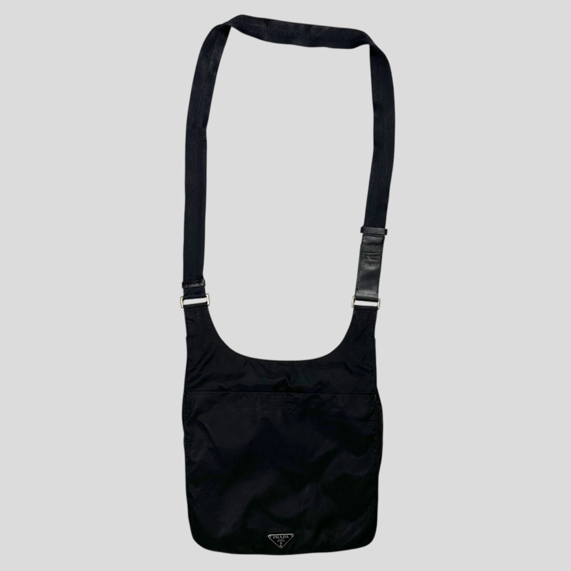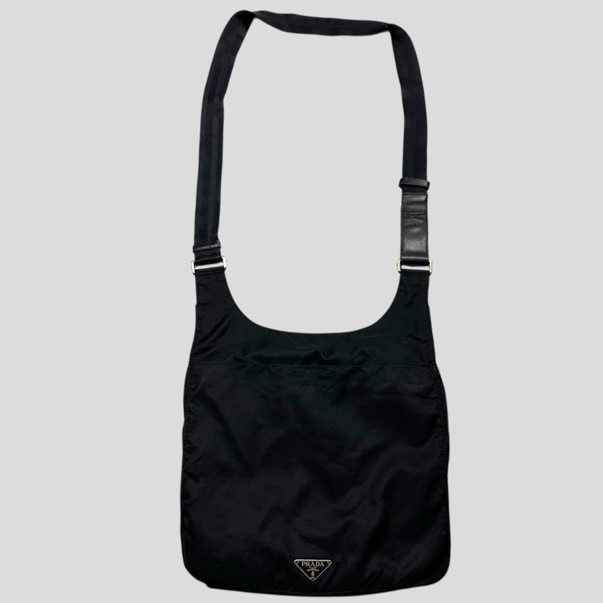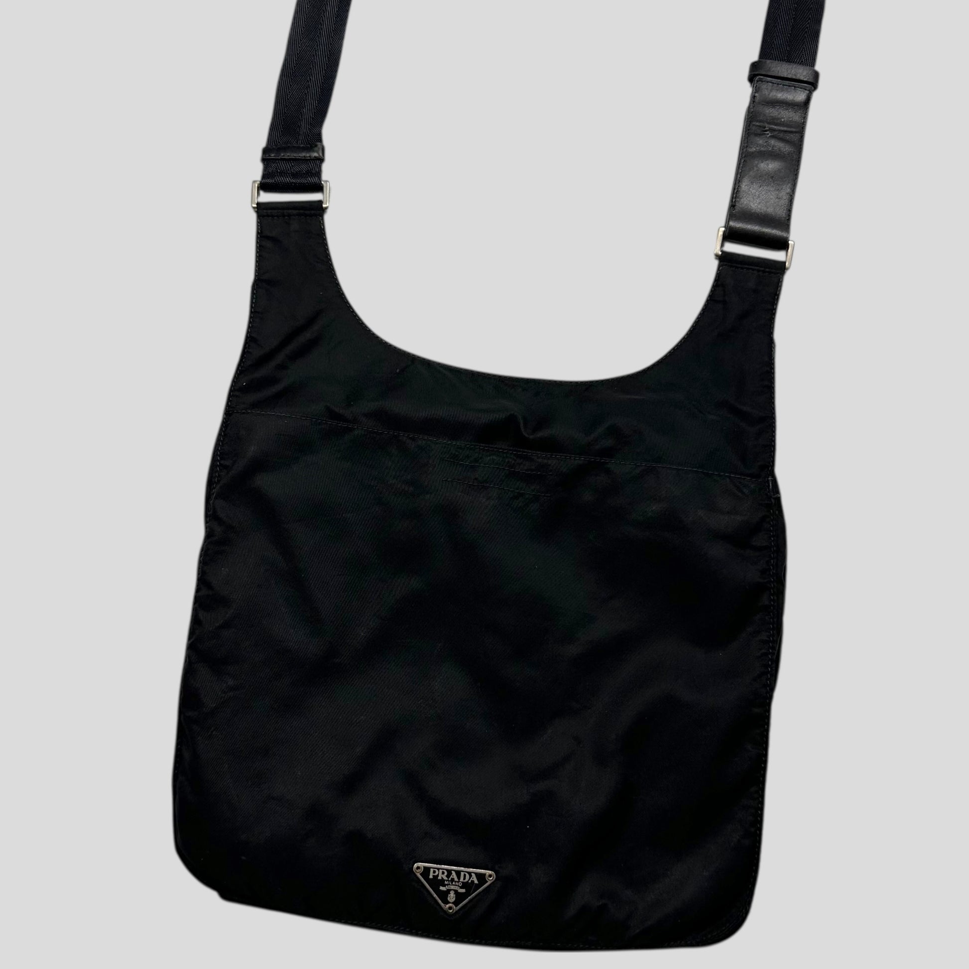 Rare 2000’s Prada mainline triangle plaque logo crossbody bag, unique shape and style that can expand due to a twin seam around the edge, multipocket design with lots of storage, leather detailing adjustable strap.