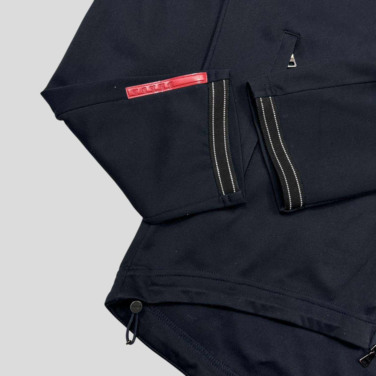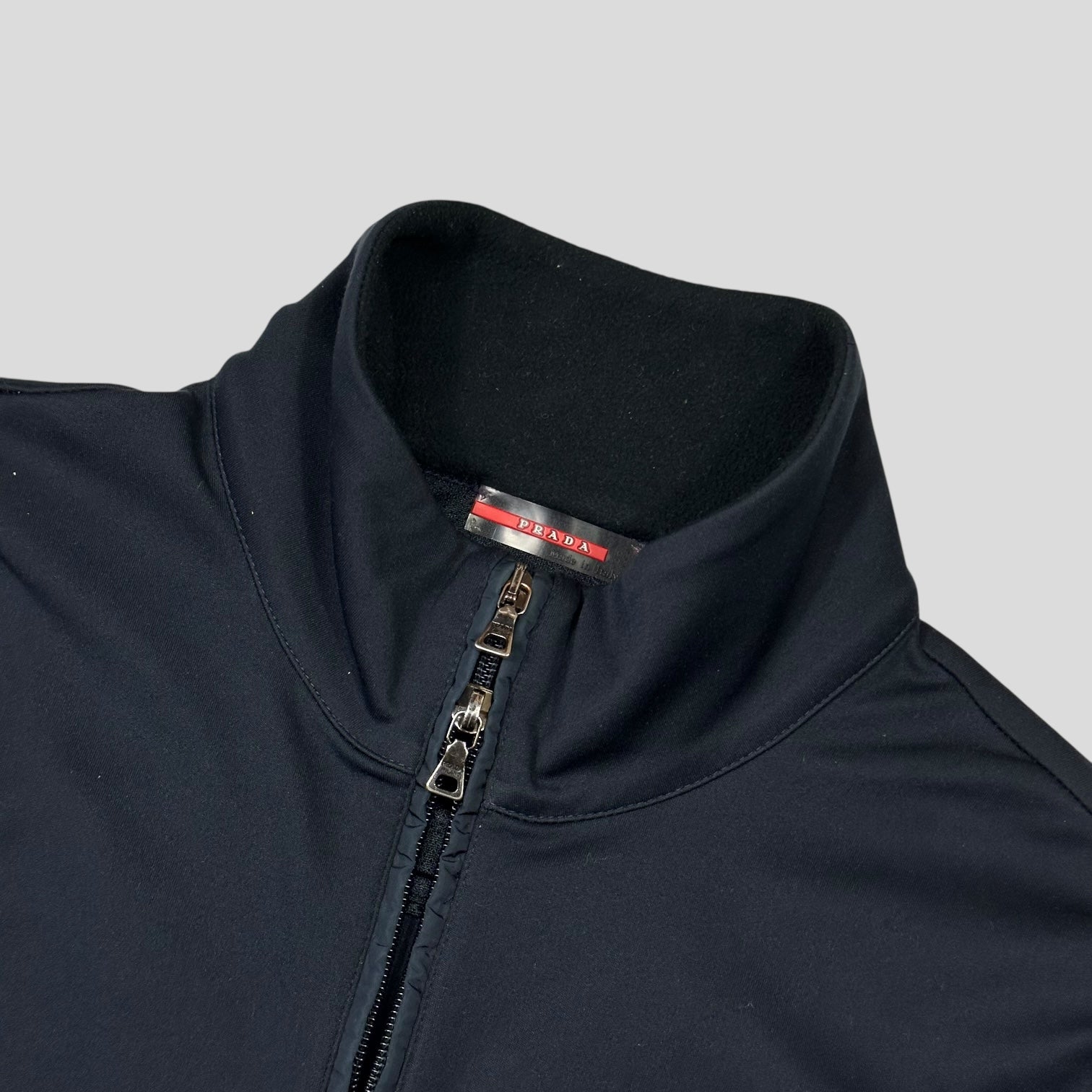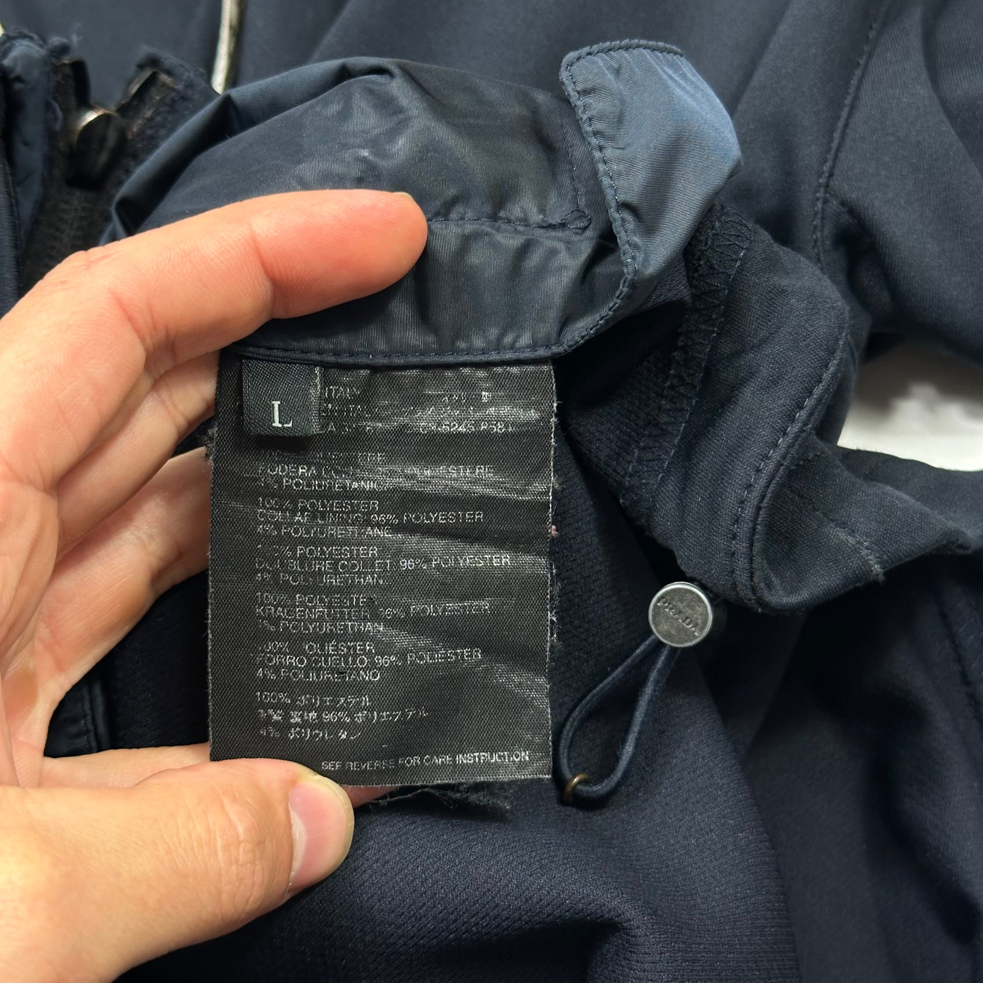 Rare early 2000’s Prada Sport navy polyester track jacket with nylon lined zip pockets, twin zip front with nylon detailing, glass beading on the cuffs and a cinchable cord at the hem.