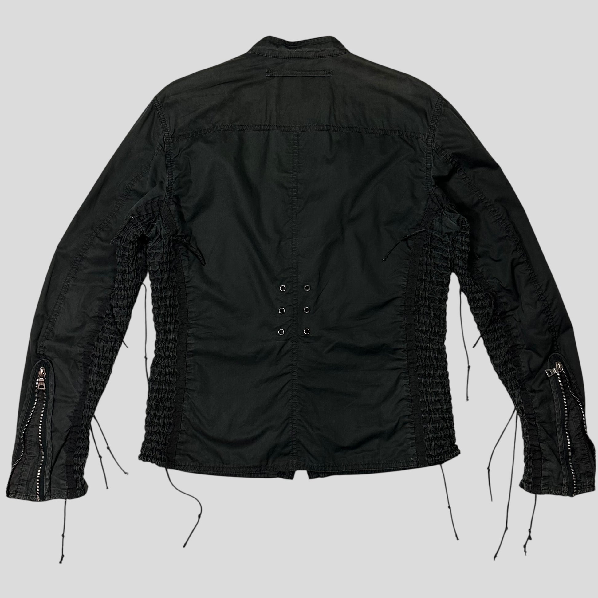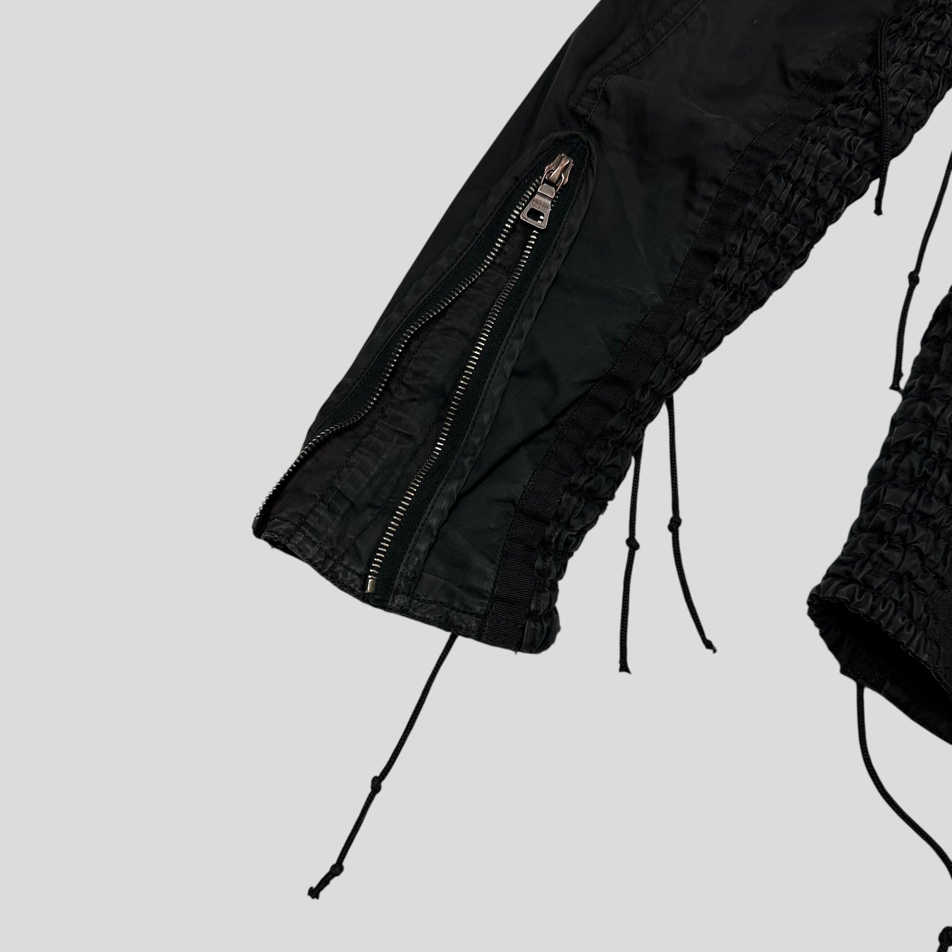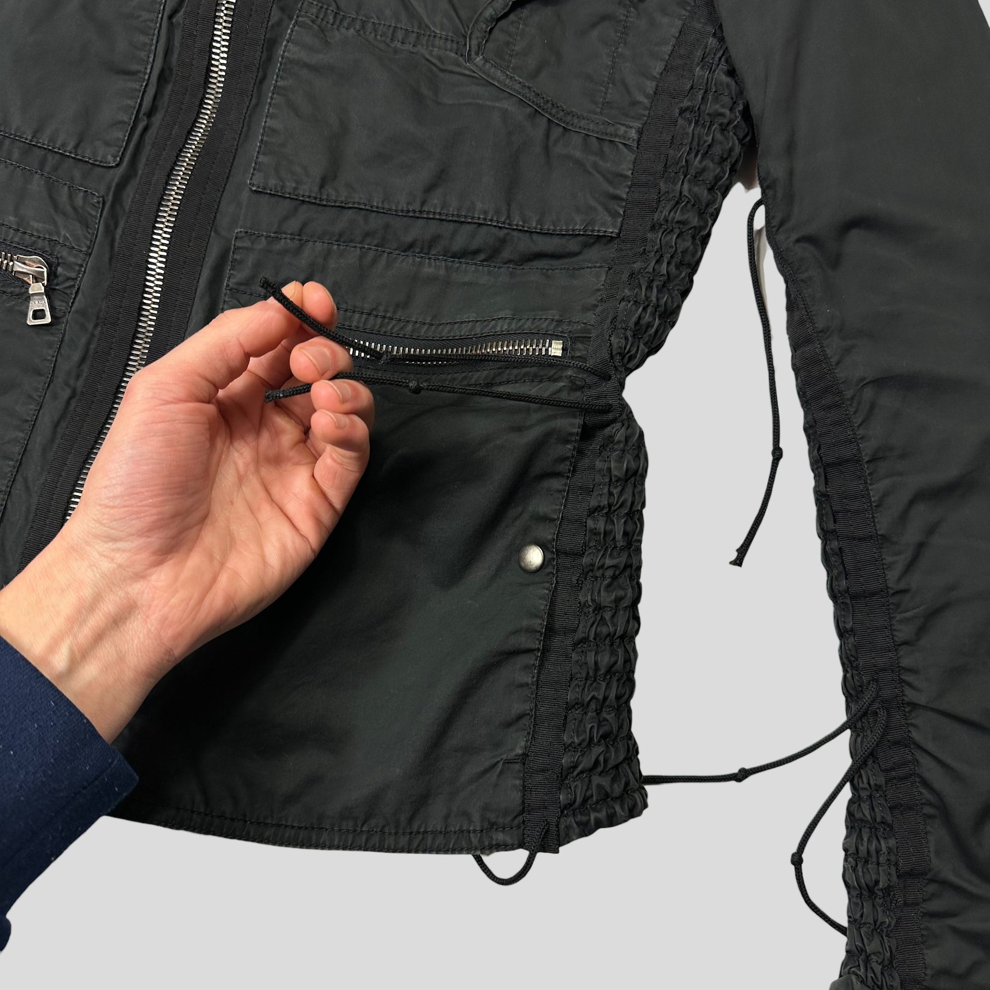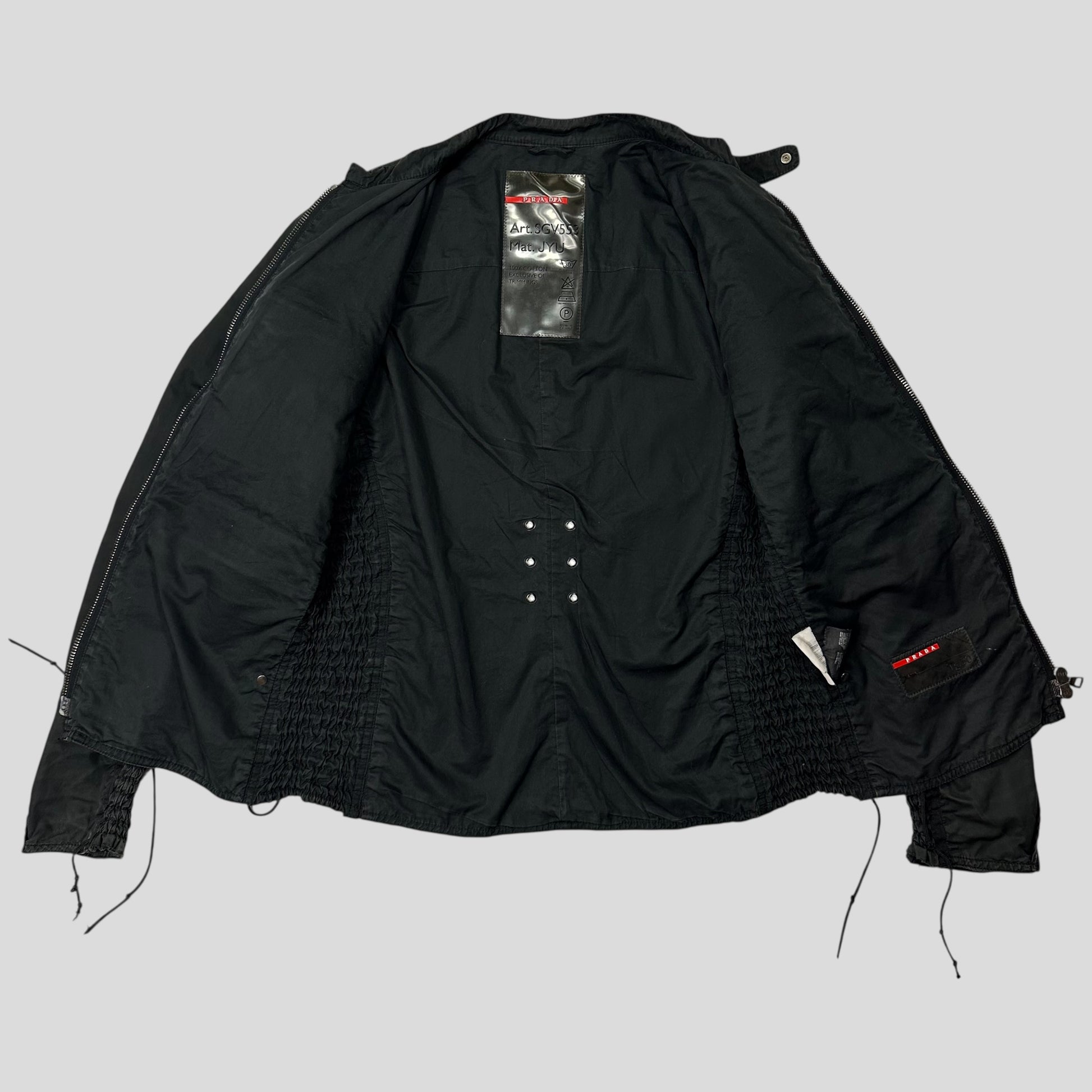 Very rare early 2000’s black cotton Prada Sport biker moto jacket, incredibly unique tassle cord detailing which are all functional and can be tightened to cinch the fit of the jacket, ventilated rivets at the back, accordion style stretchy panelling at the sides, multipocket design, zips at cuffs to tighten the wrist fit.