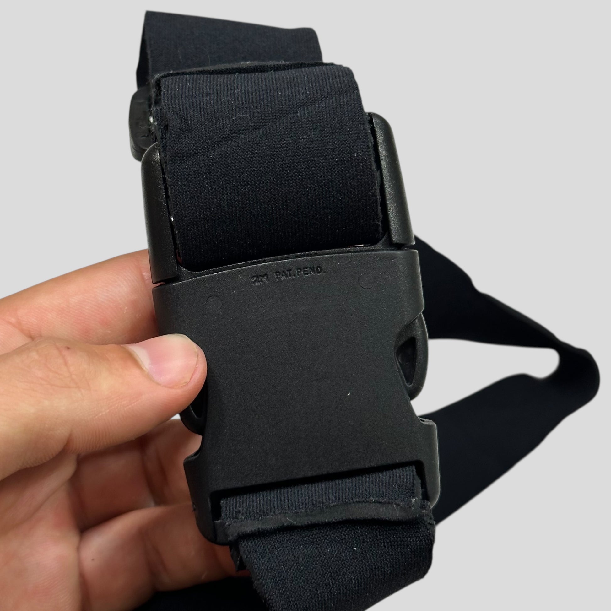 Very rare 1999 Prada Sport black neoprene soft belt bag / waistbag, can be worn across body or around waist, singular pouch with red rubber logo, fully adjustable strap length, small strap clip on back.