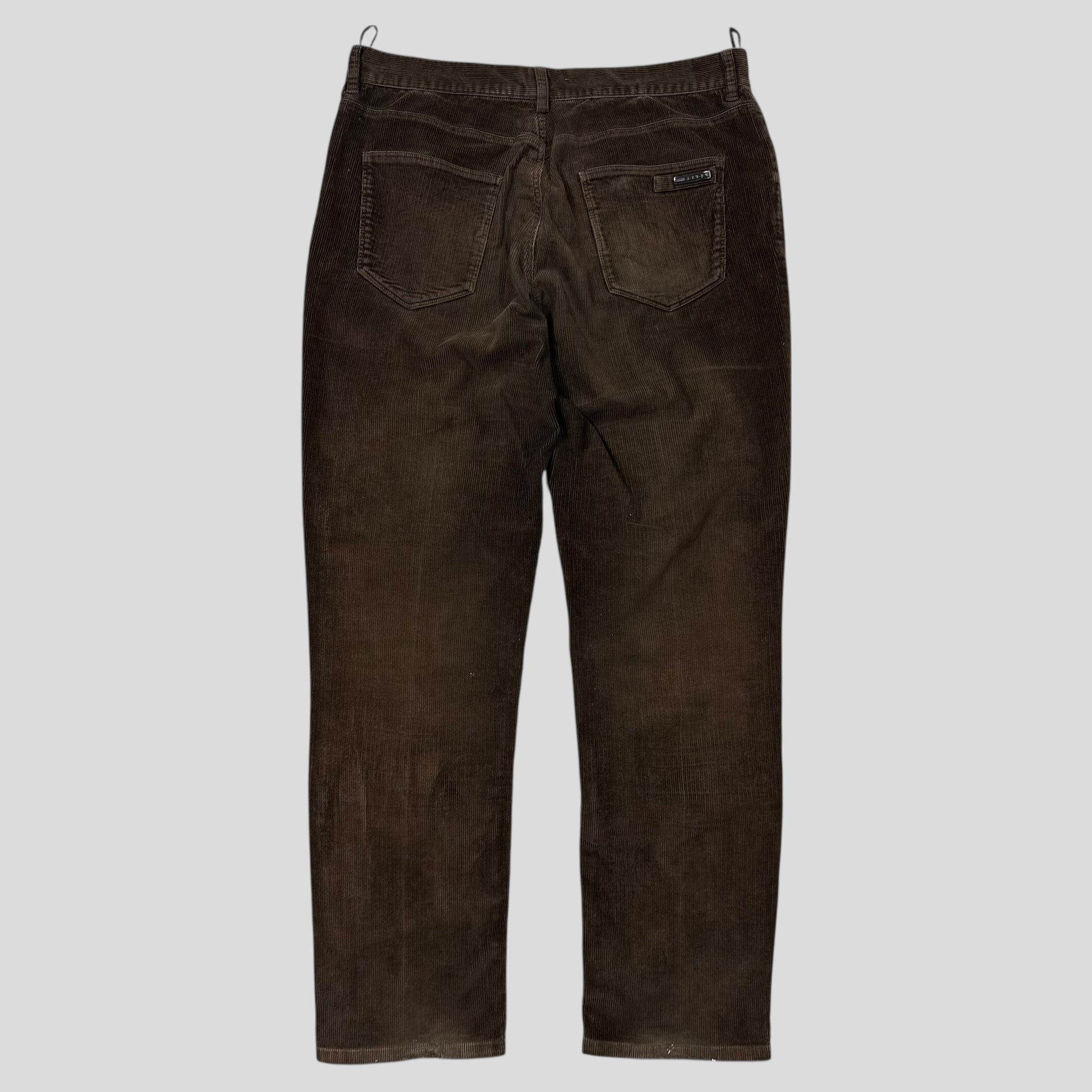Prada Sport brown cotton needle corduroy trousers, rubber black logo tab to back pocket, smart straight-slim fit.