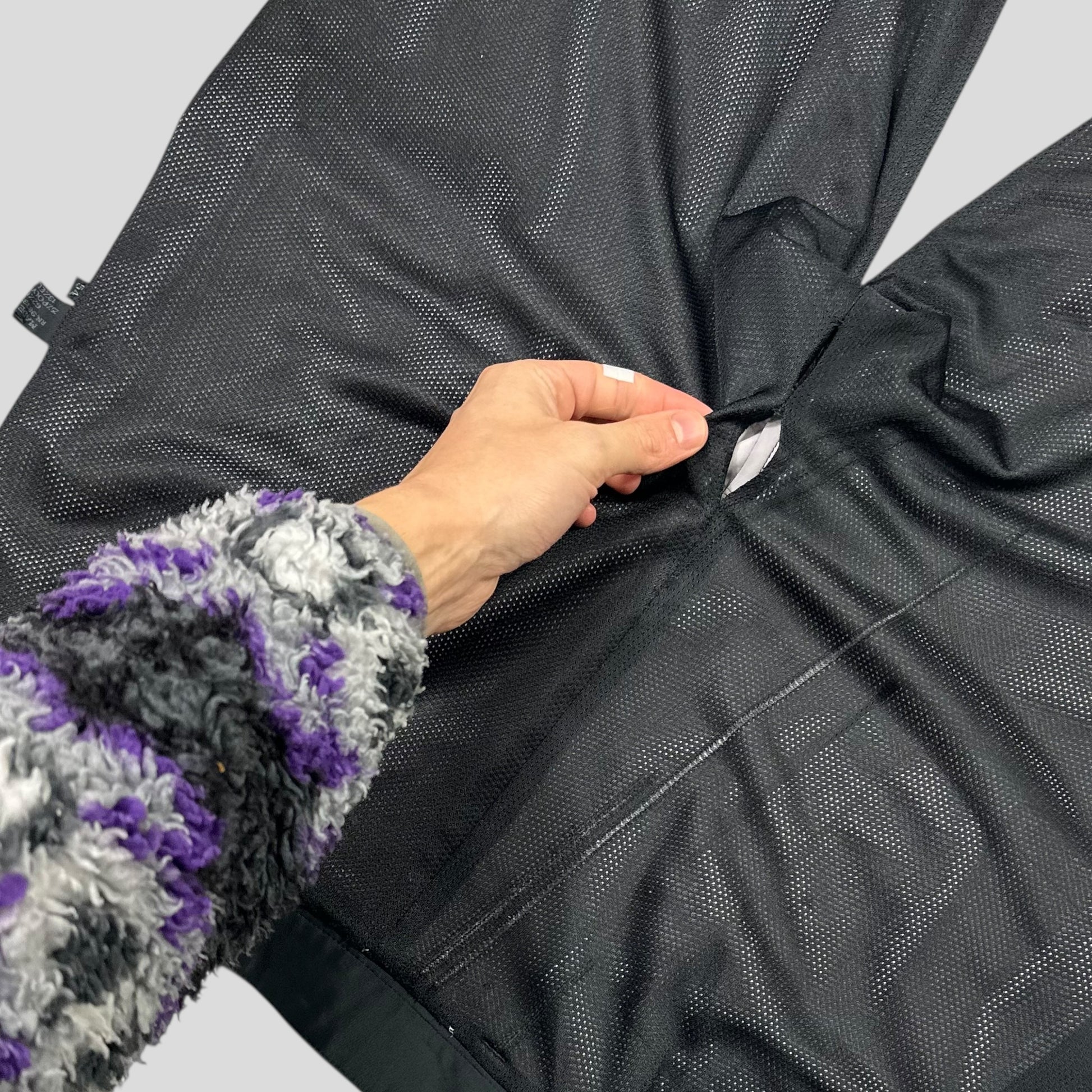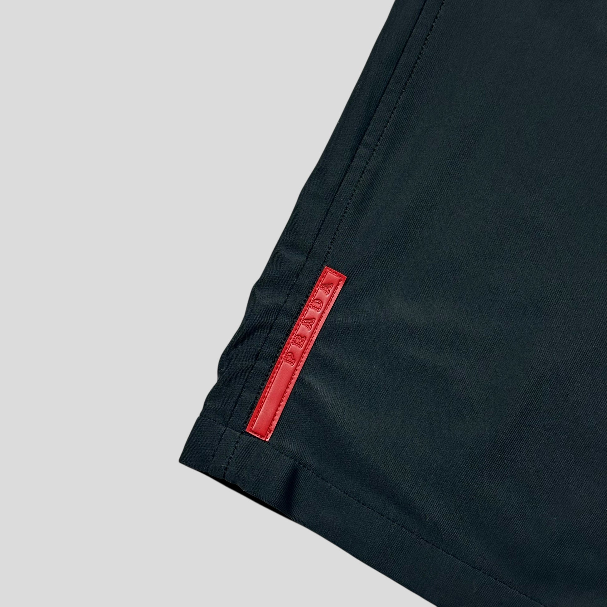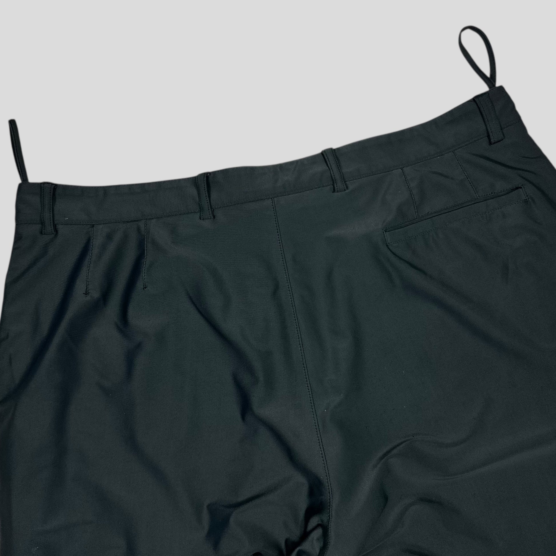 Very rare Prada Sport fall winter 1999, black / charcoal grey textured nylon polyester and elastin blend trousers, unique material to this season that’s soft and stretchy with a diagonal micro texture to it, the material shimmers and changes shades in the sun often looking black / grey / blue / green, mesh lined for comfort with red tab to ankle cuff.