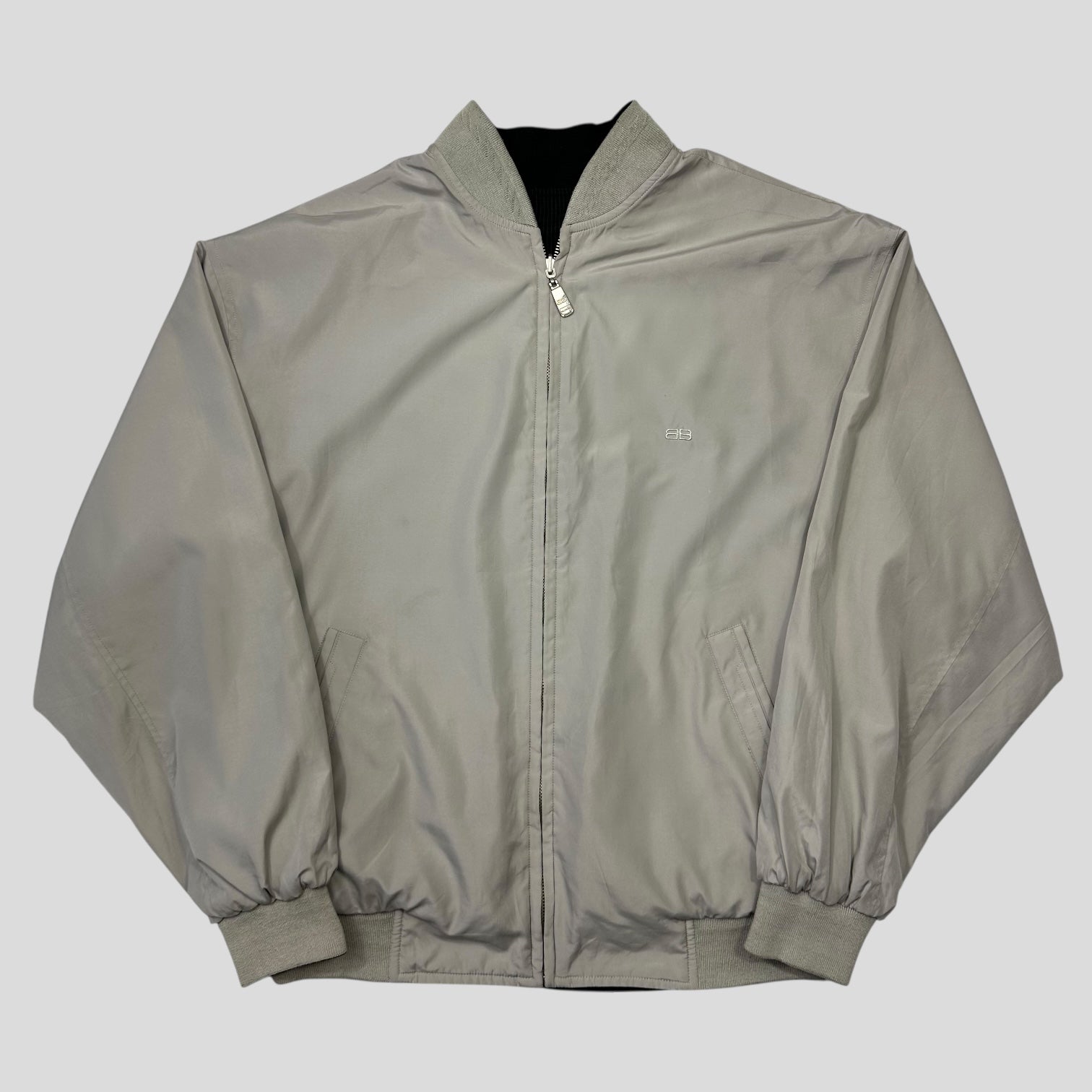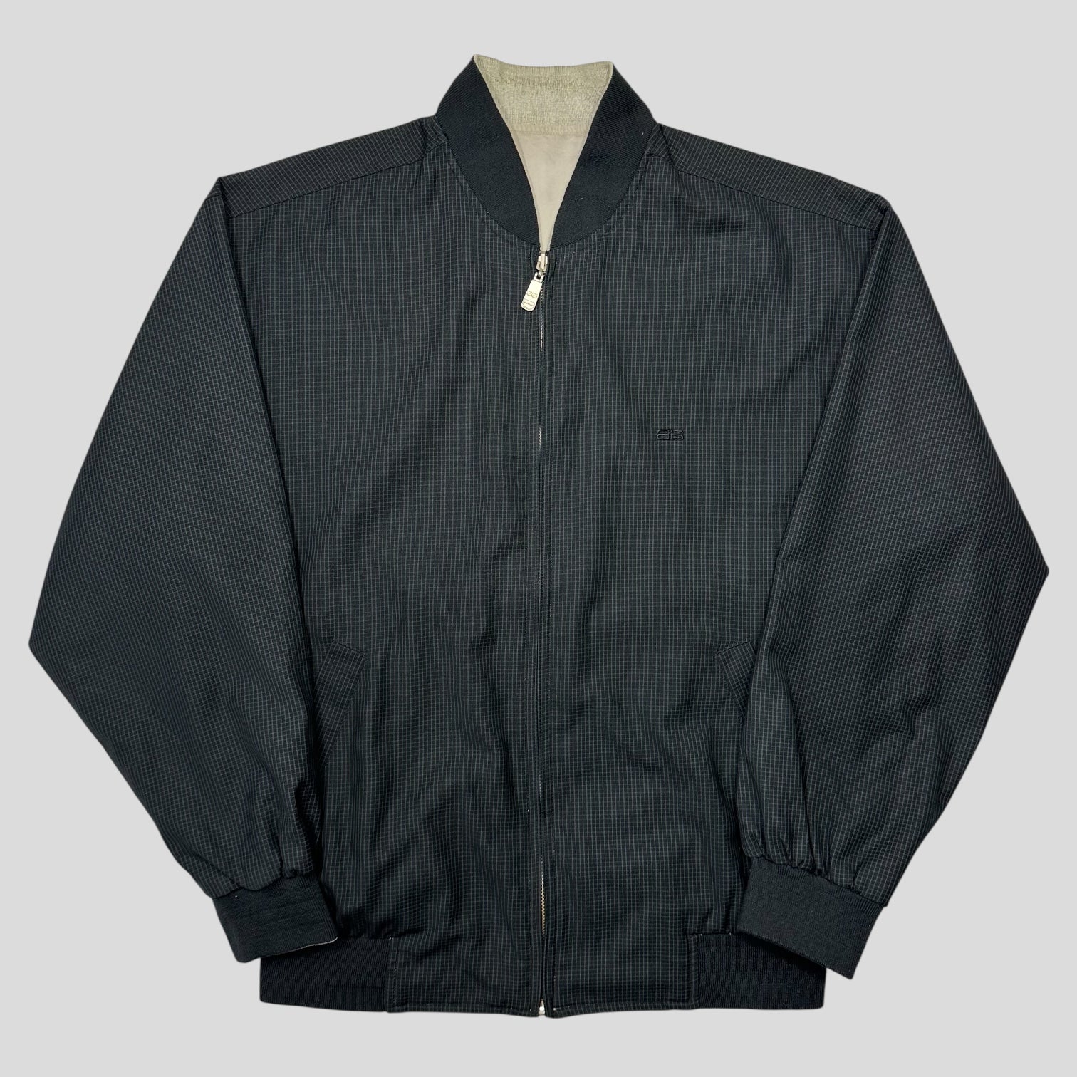 Very rare 1990’s Balenciaga Bomber, black micro grid check on one side, reversing into grey, both sides feature the BB embroidered Balenciaga logo to chest, beautiful quality, logo zippers.