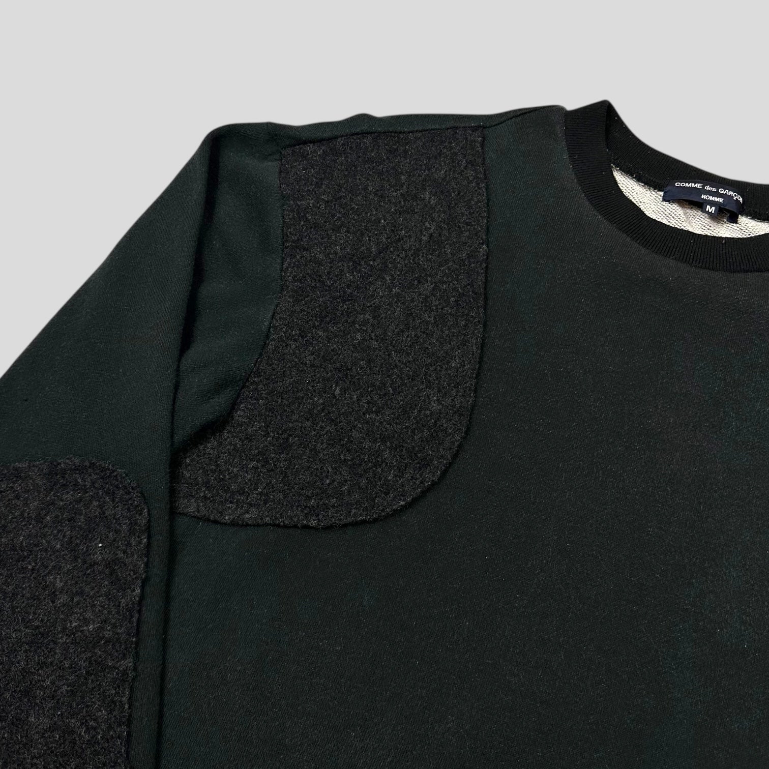 Rare AD2007 CDG Homme charcoal grey sweatshirt with black ribbing and grey mélange wool asymetrical appliqué panels, unique sporty take on classic Comme.