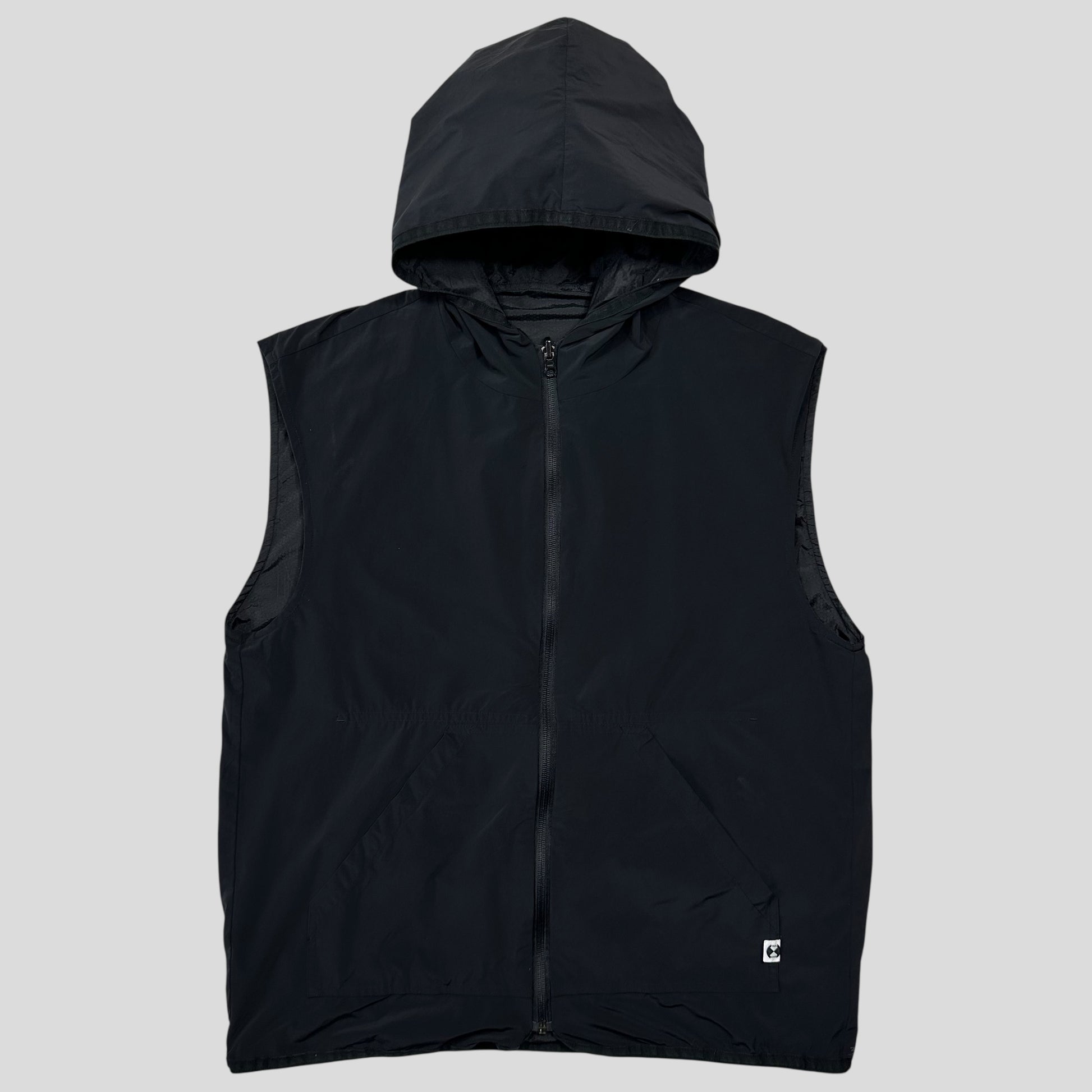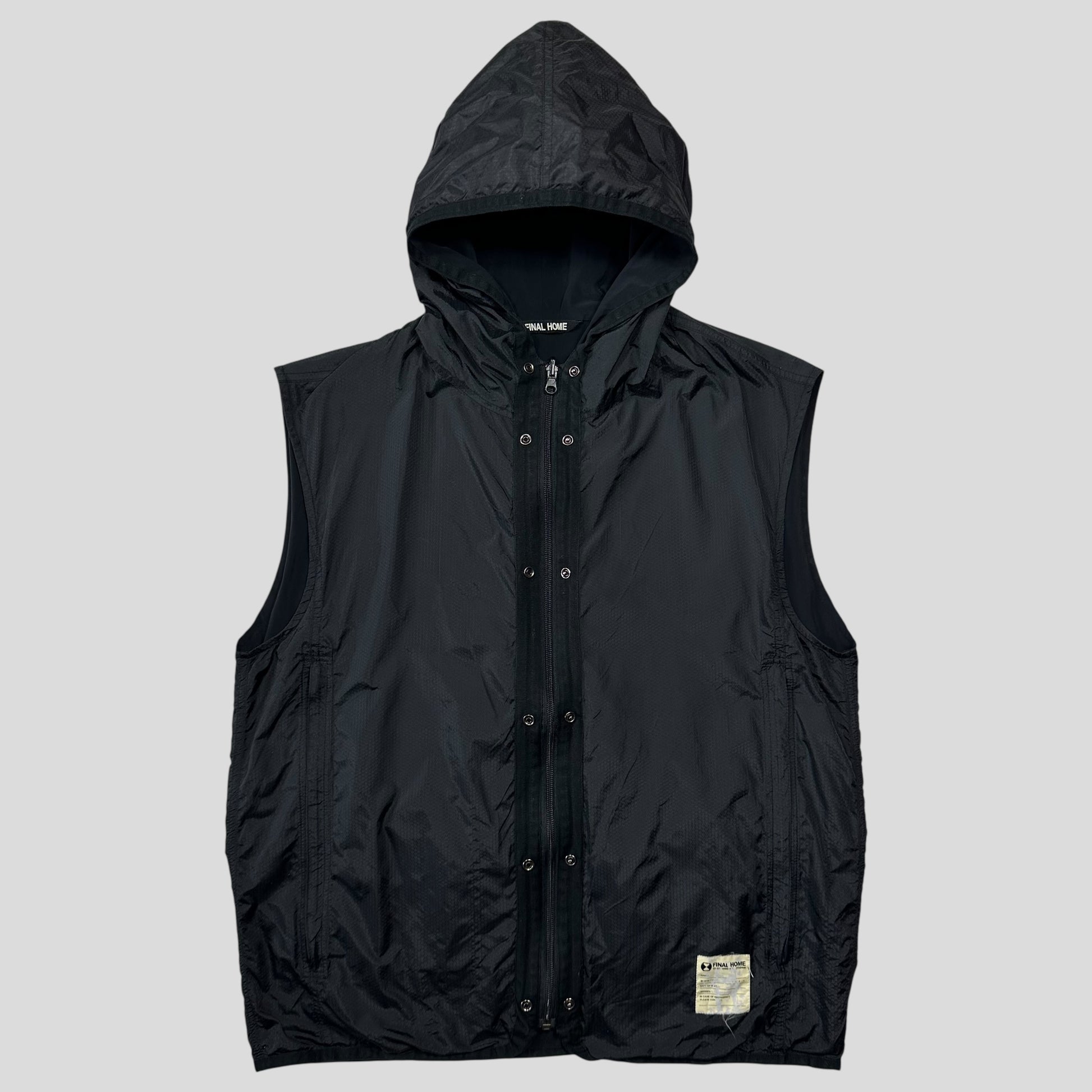 Very rare Final Home 2000’s Black nylon reversible hooded vest, unique hex patterned ripstop material on the front with Final Home survival logo patch and large zip pockets, features buttons that can be used to cinch the fit of the vest inwards making it more fitted, reverses into a jet black smooth nylon side with a small Final Home logo tab and hand pockets.