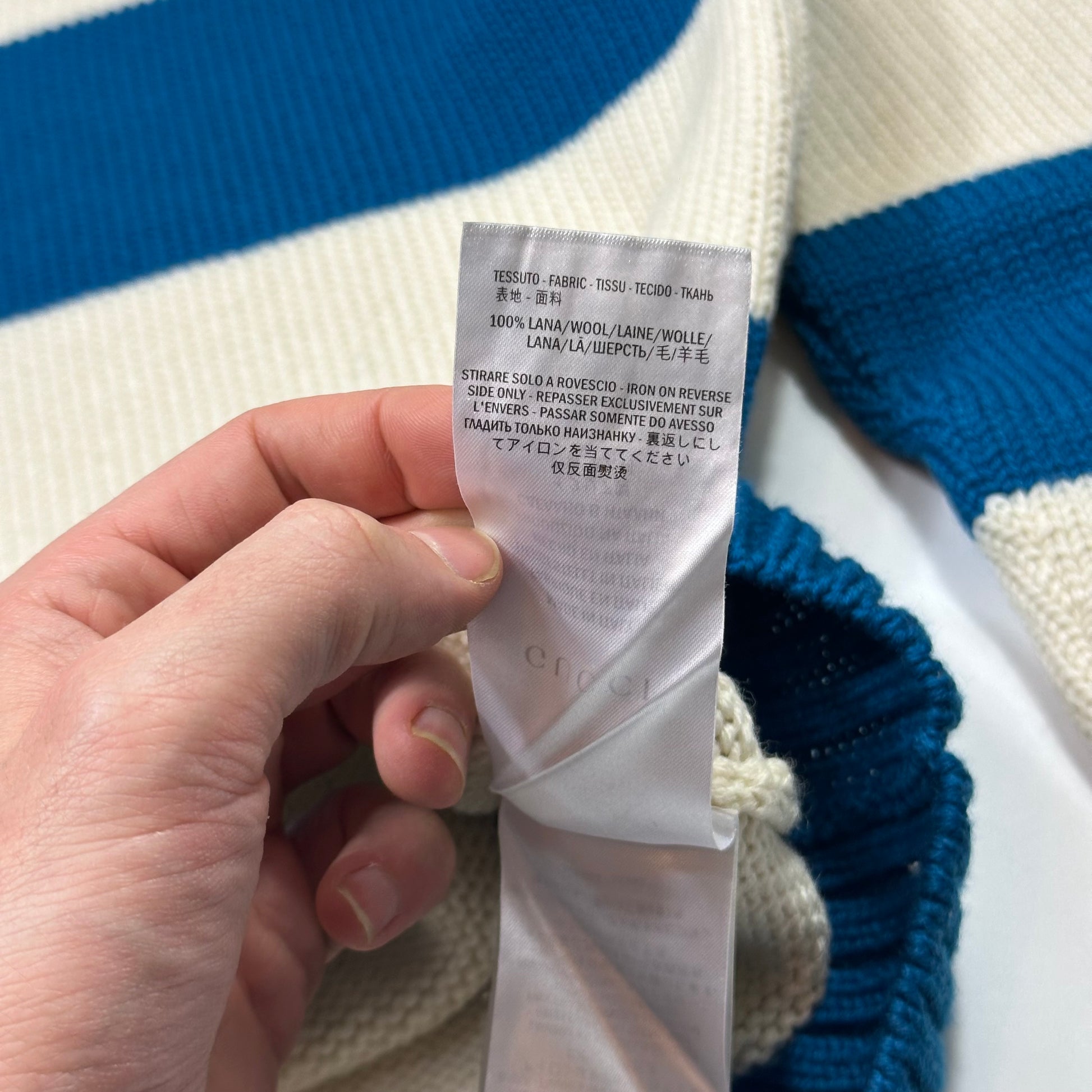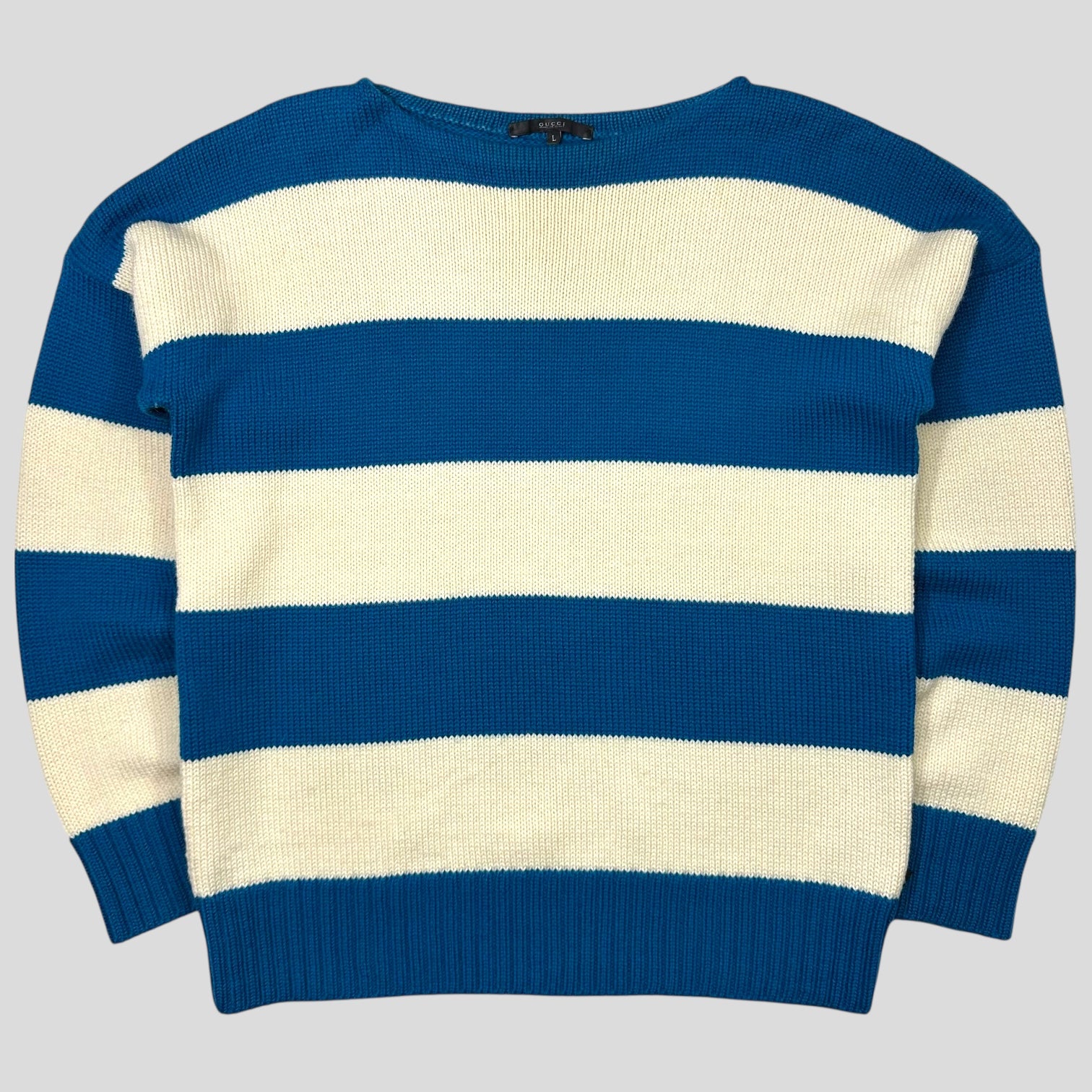 Beautiful aqua blue and soft cream striped chunky thick knitted Gucci 2016 jumper, Allesandro Michelle era, boat neck, Gucci leather logo tag to side, soft cozy and warm, made in Italy.