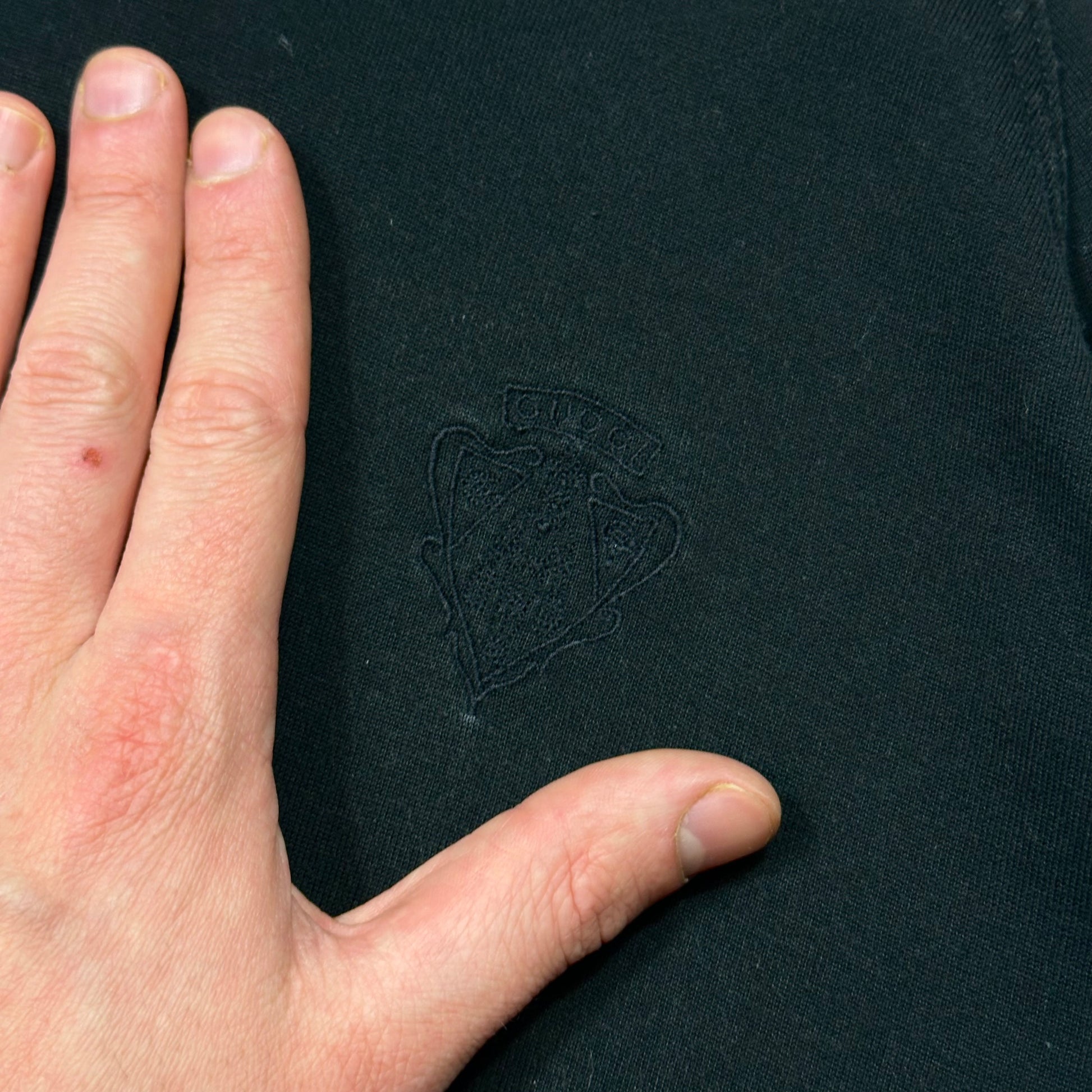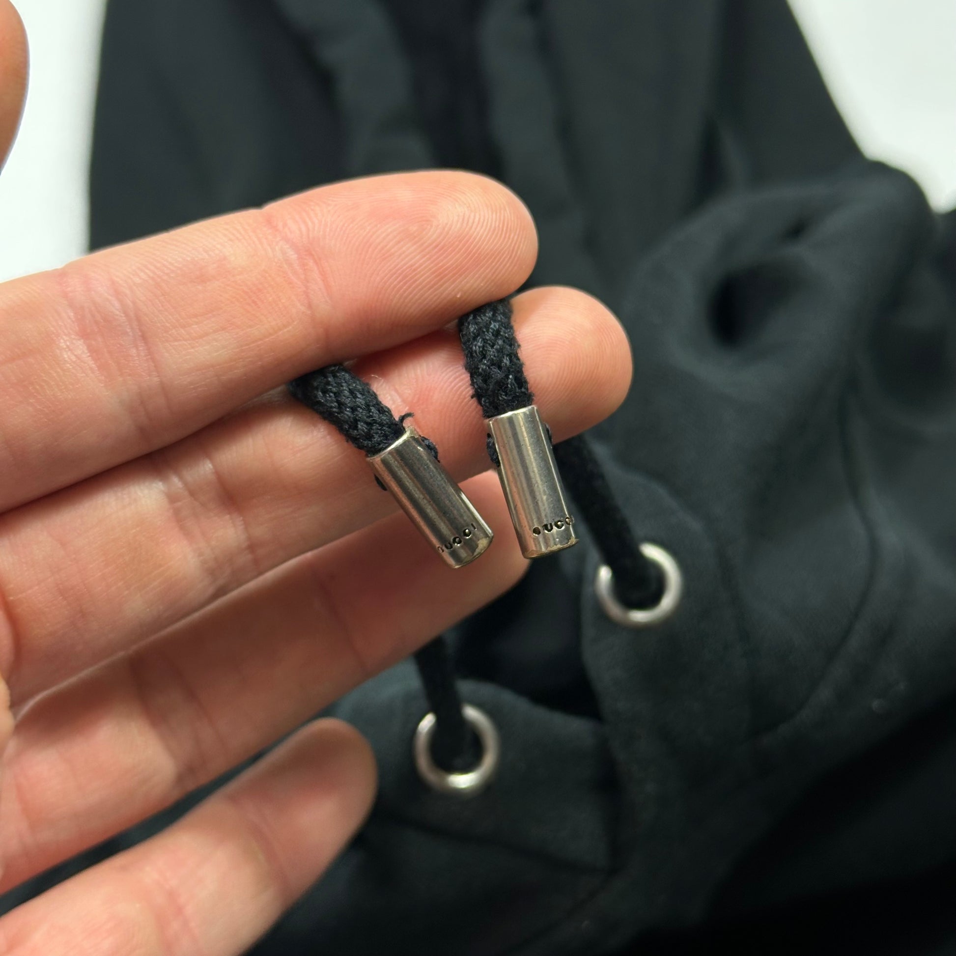 2007 Gucci charcoal black cotton hoodie with embroidered crest logo to chest, web stripe hem and cuffs, made in Italy, warm cozy teddy cotton fleece inside.