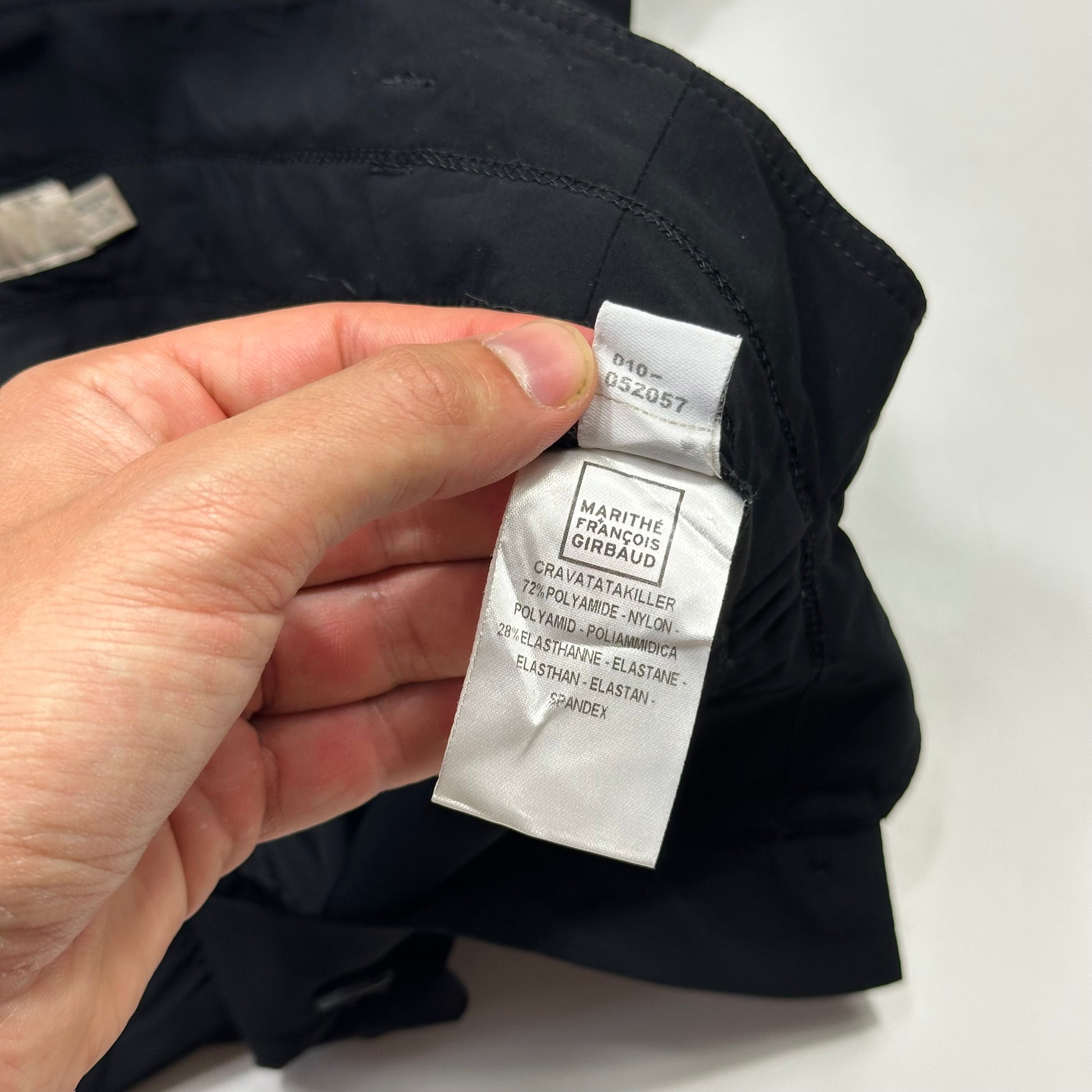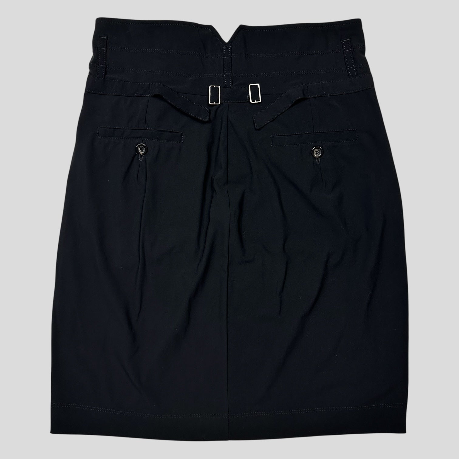 Rare early 2000’s Marithé + François Girbaud black A Line silk like rayon skirt with scrunch pleated detailing, elasricated waist and material, adjustable belt to back to fit, cargo style.