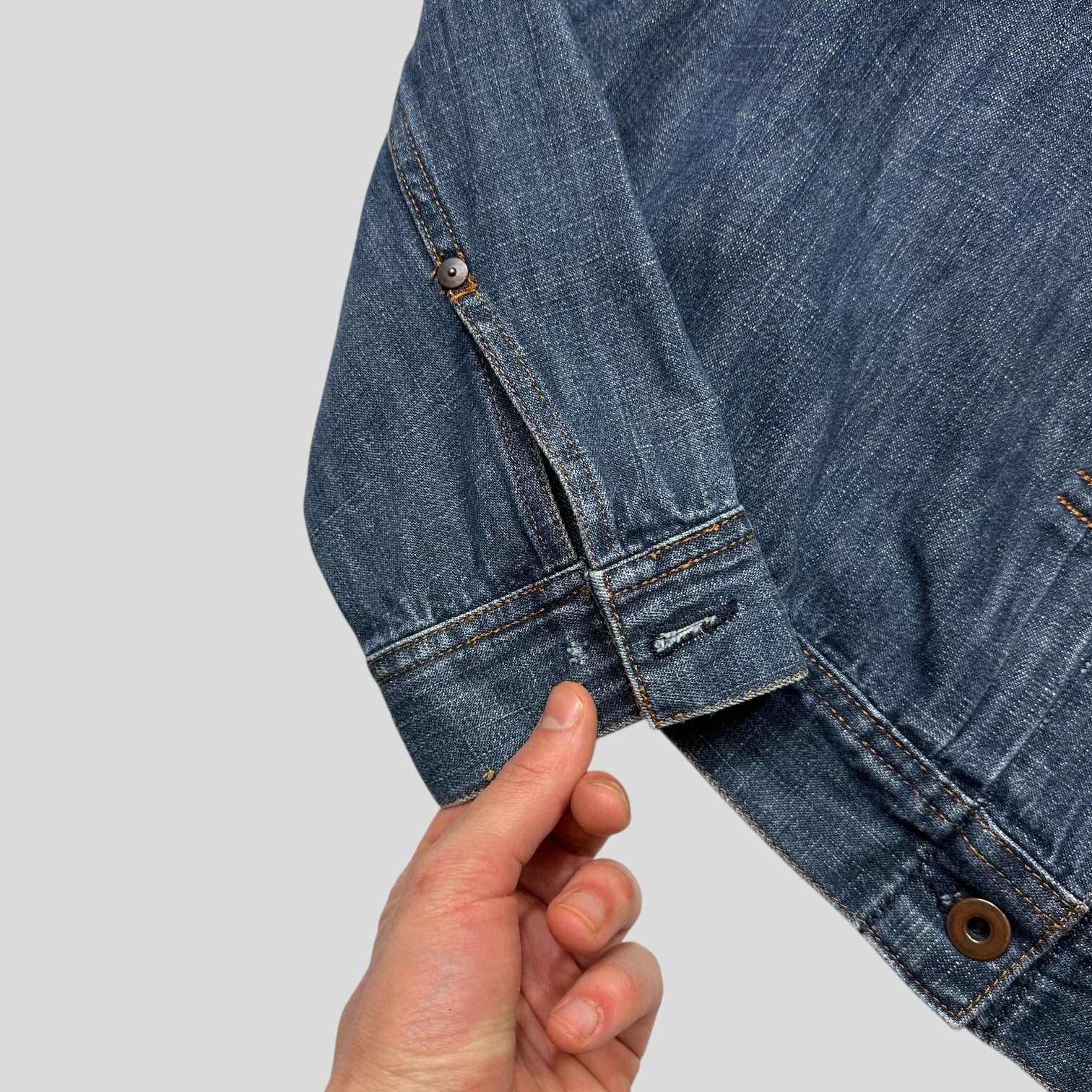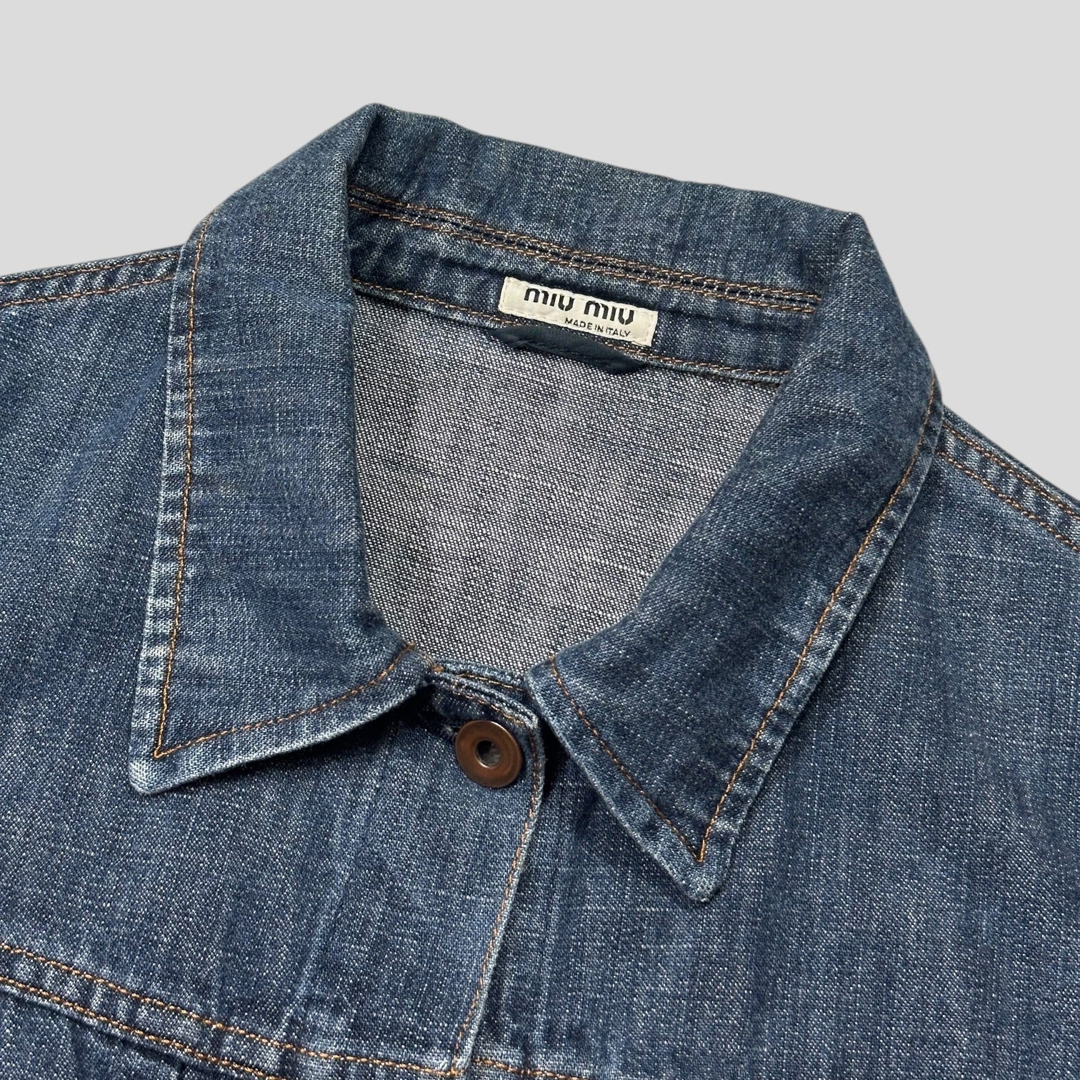 Incredible autumn winter 2001 Miu Miu boxy denim work jacket, as seen on the fall winter 2001 menswear runway, unique pleated stitch detailing to the front, asymmetrical central pocket, pleated detailing on the back.