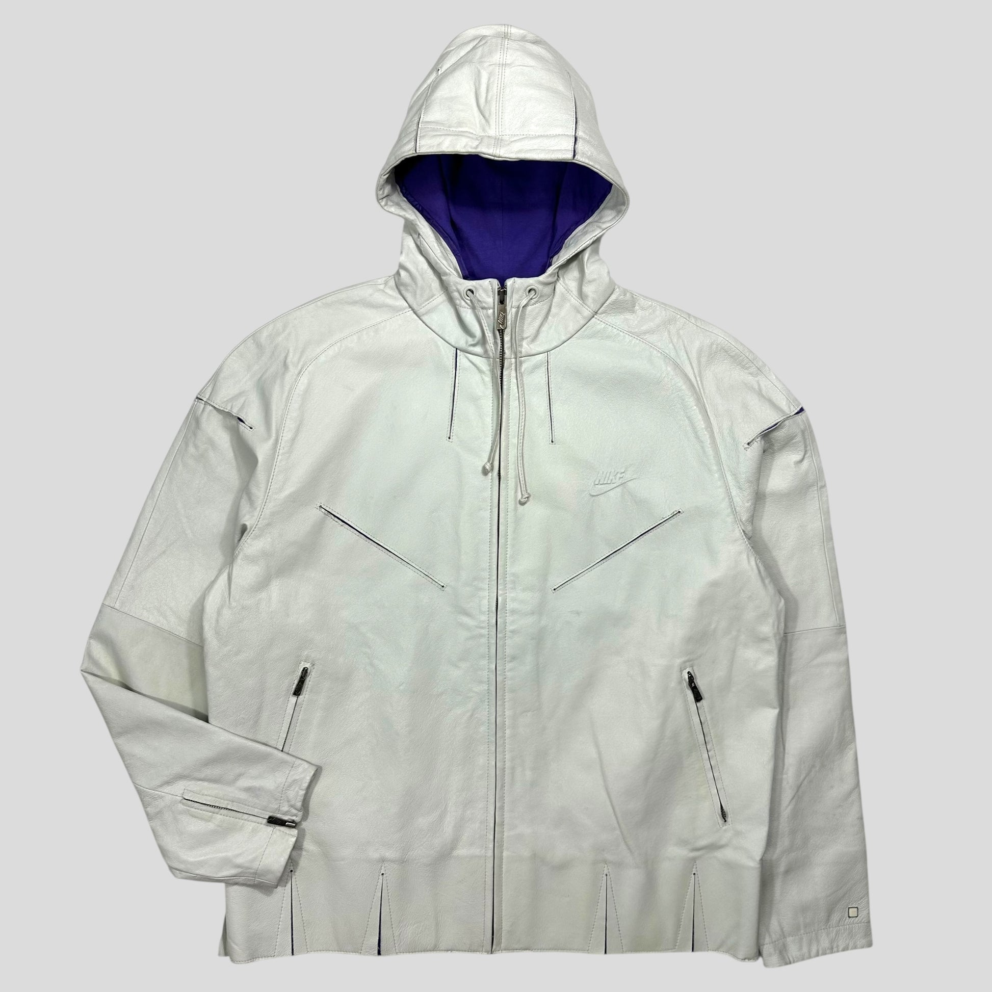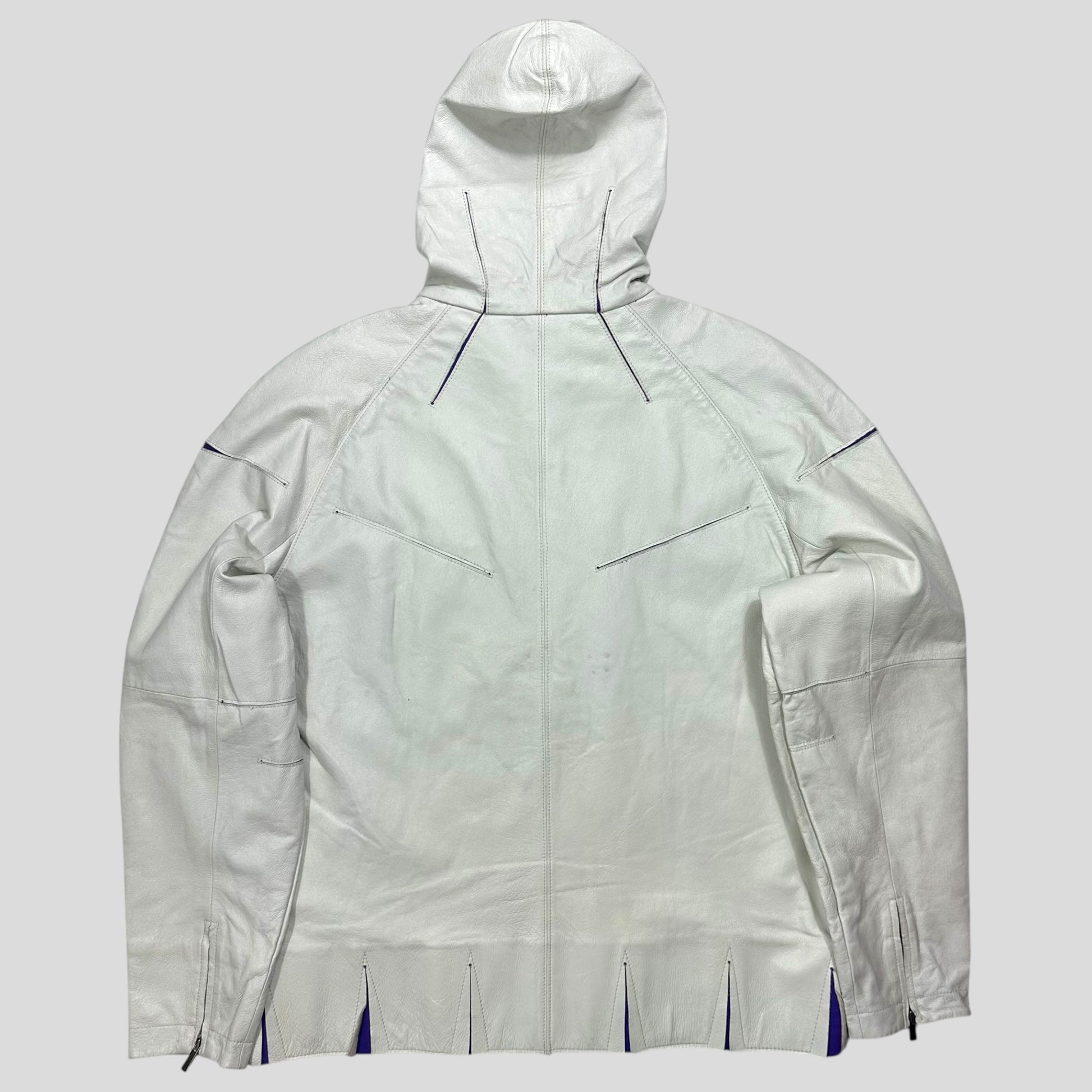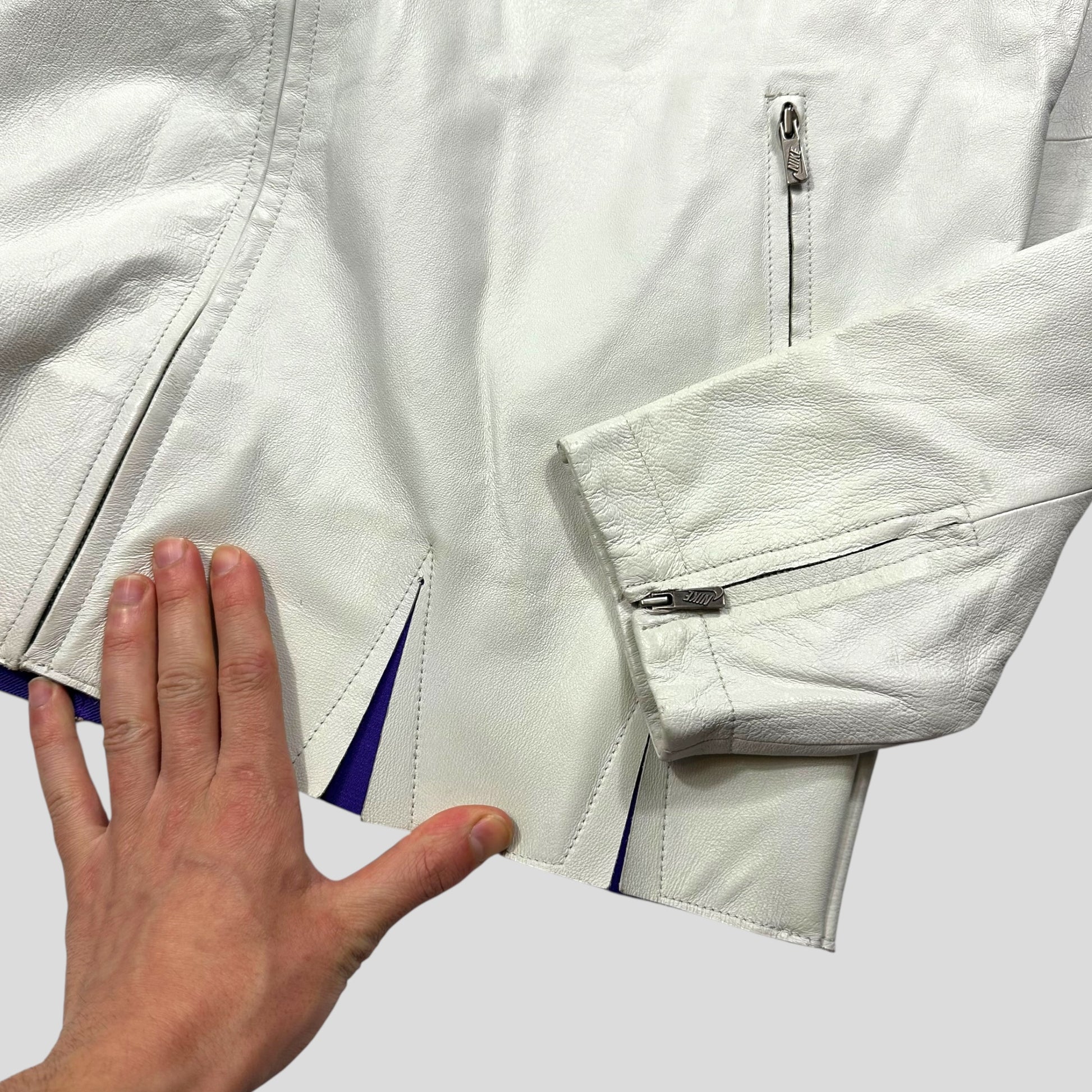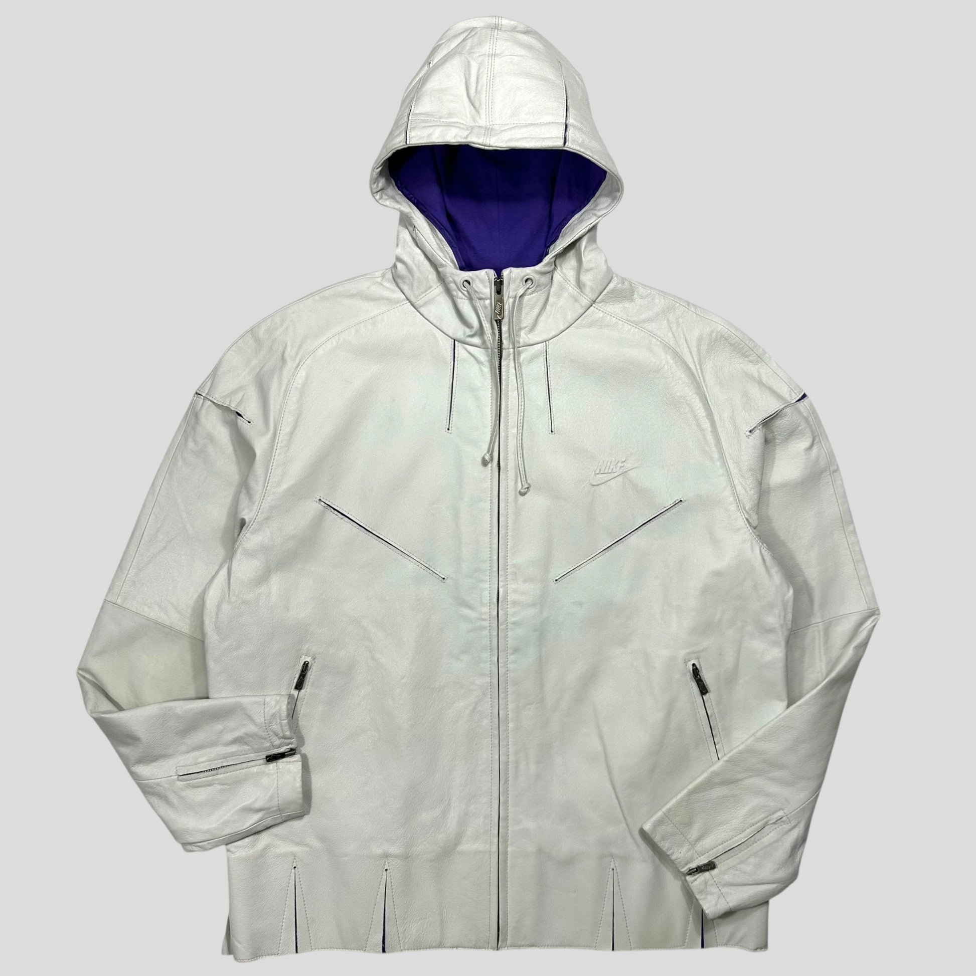 Extremely rare Nike by Tony Spackman White and Purple Pig Leather articulated jacket, unbelievably thought out unique design with split sliced openings throughout the jacket that reveal the purple under layer of cotton material when in motion, these also increase the ease of movement and breathability of the jacket, typical of Tony Spackman design.