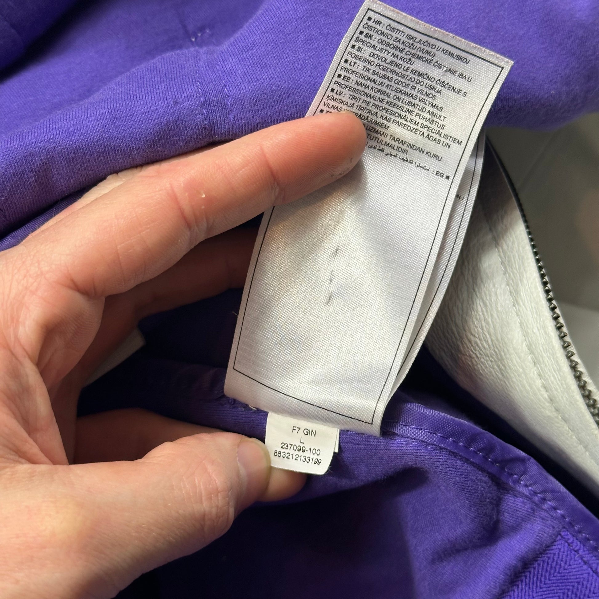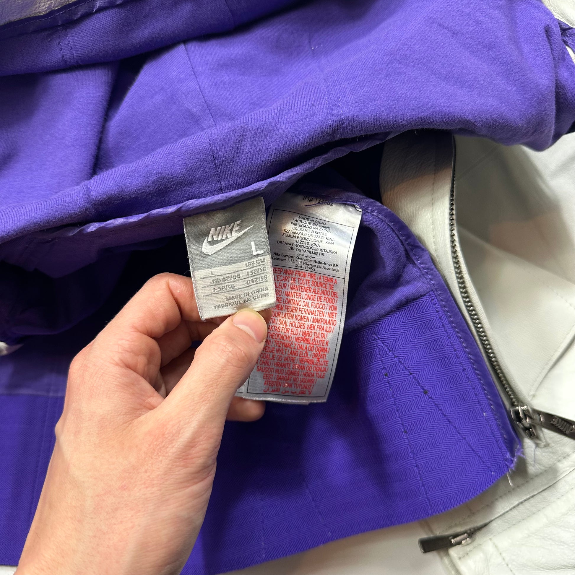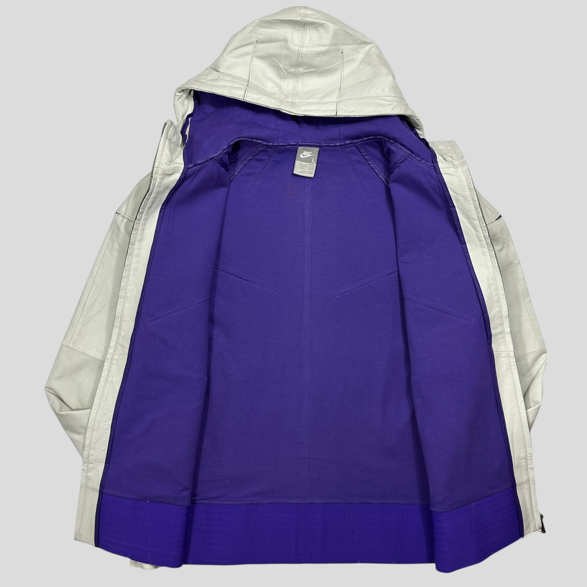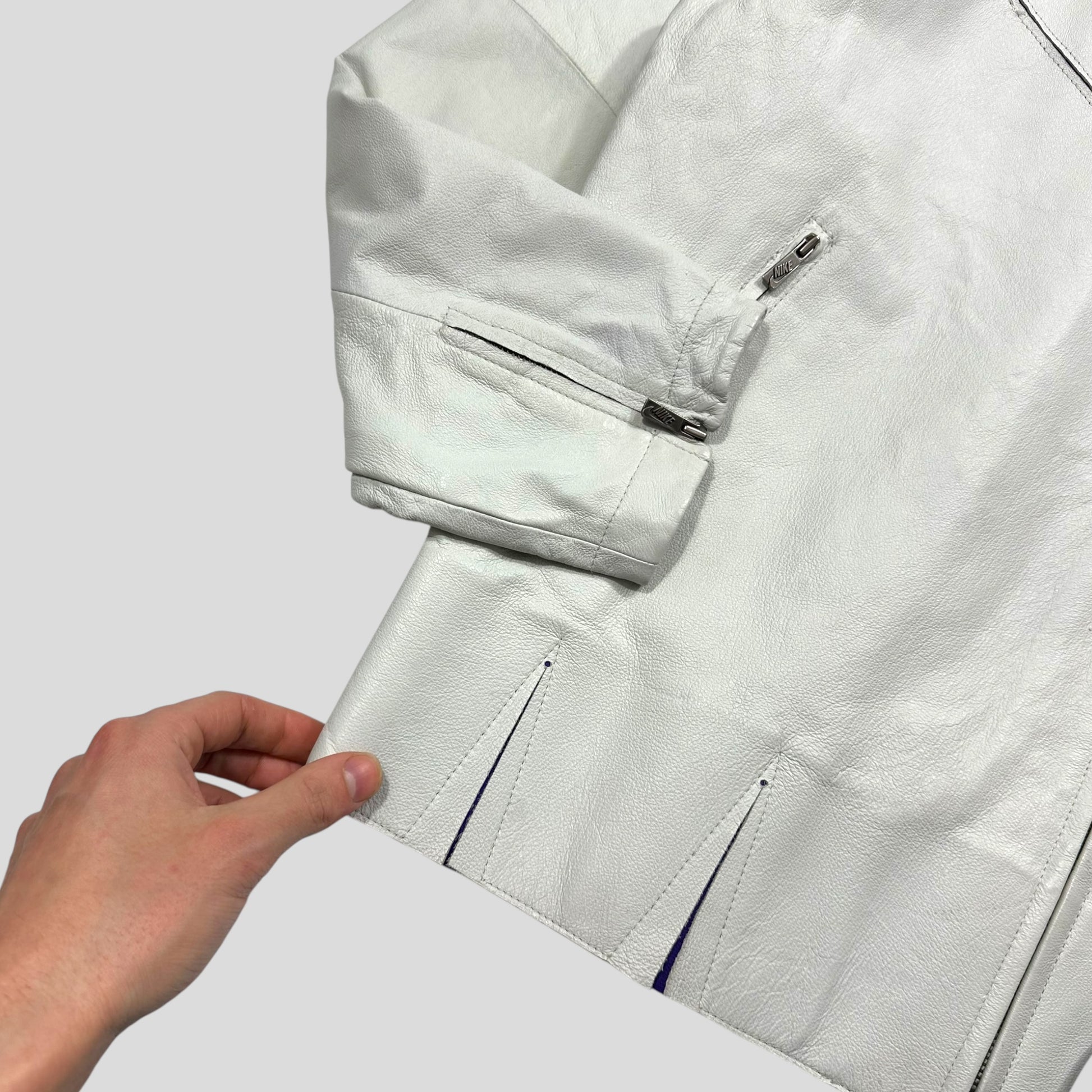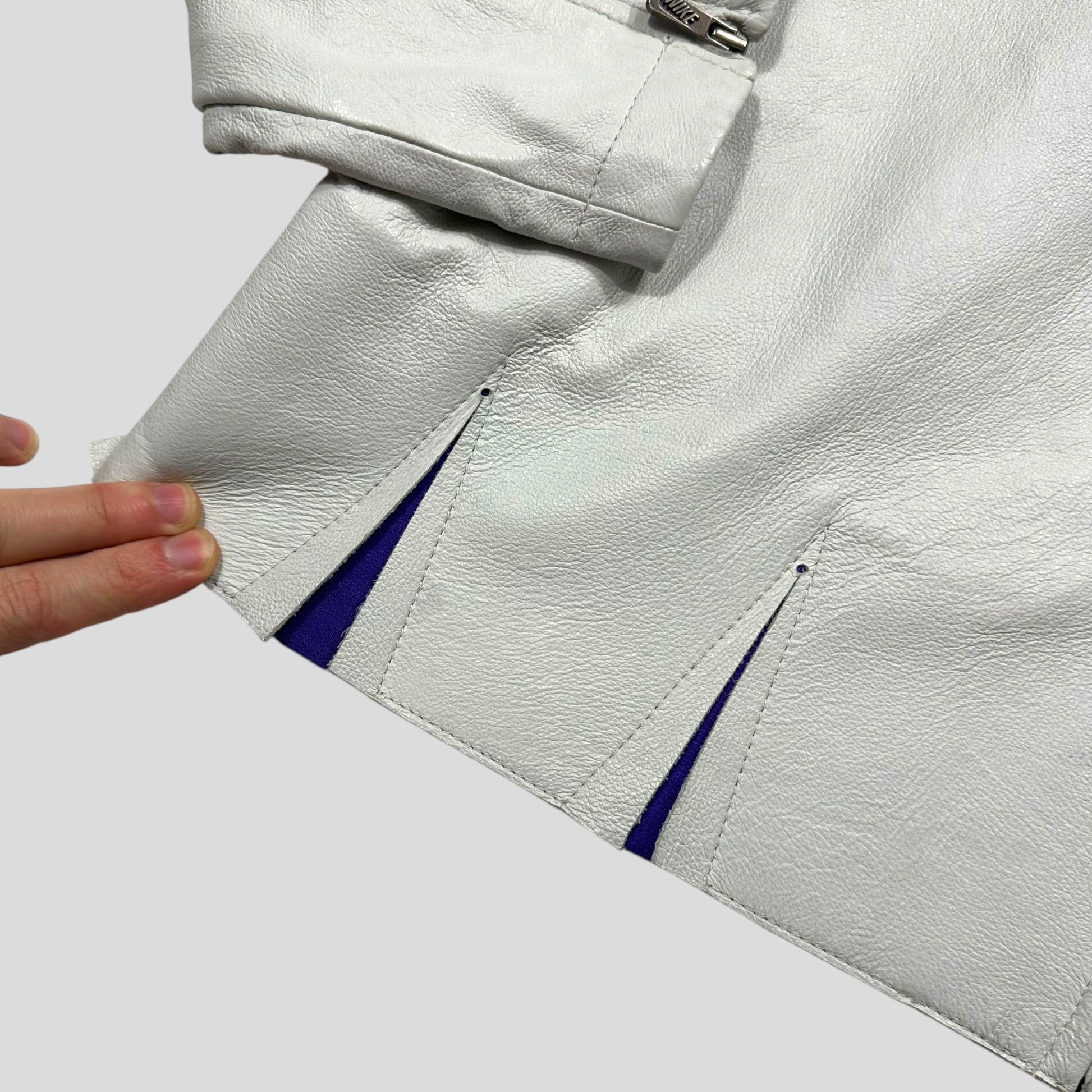 Extremely rare Nike by Tony Spackman White and Purple Pig Leather articulated jacket, unbelievably thought out unique design with split sliced openings throughout the jacket that reveal the purple under layer of cotton material when in motion, these also increase the ease of movement and breathability of the jacket, typical of Tony Spackman design.
