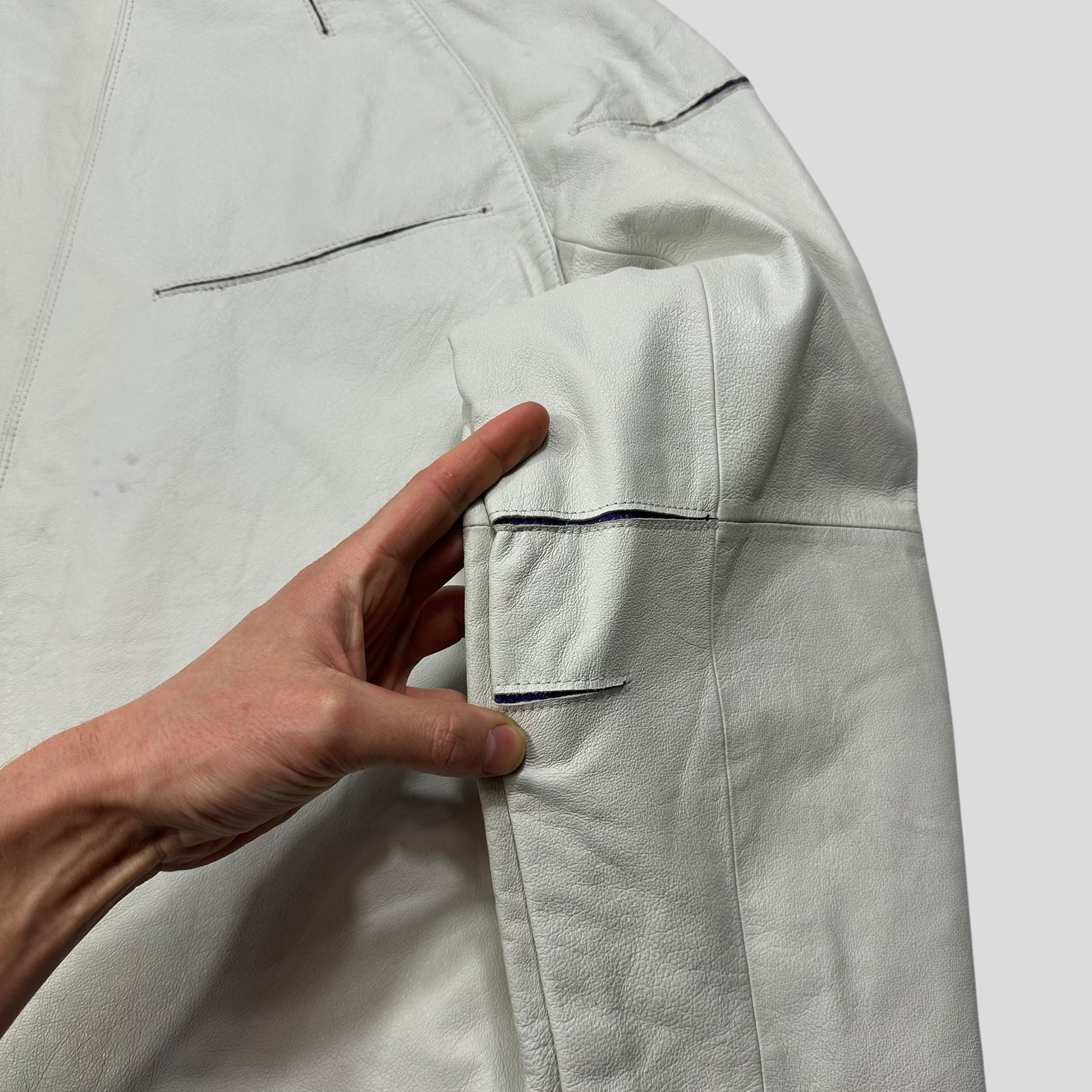 Great condition, leather has a few minor feint marks throughout, as you’d expect with vintage white leather, however the lining and general feel of the jacket is excellent, no tears holes or damage.