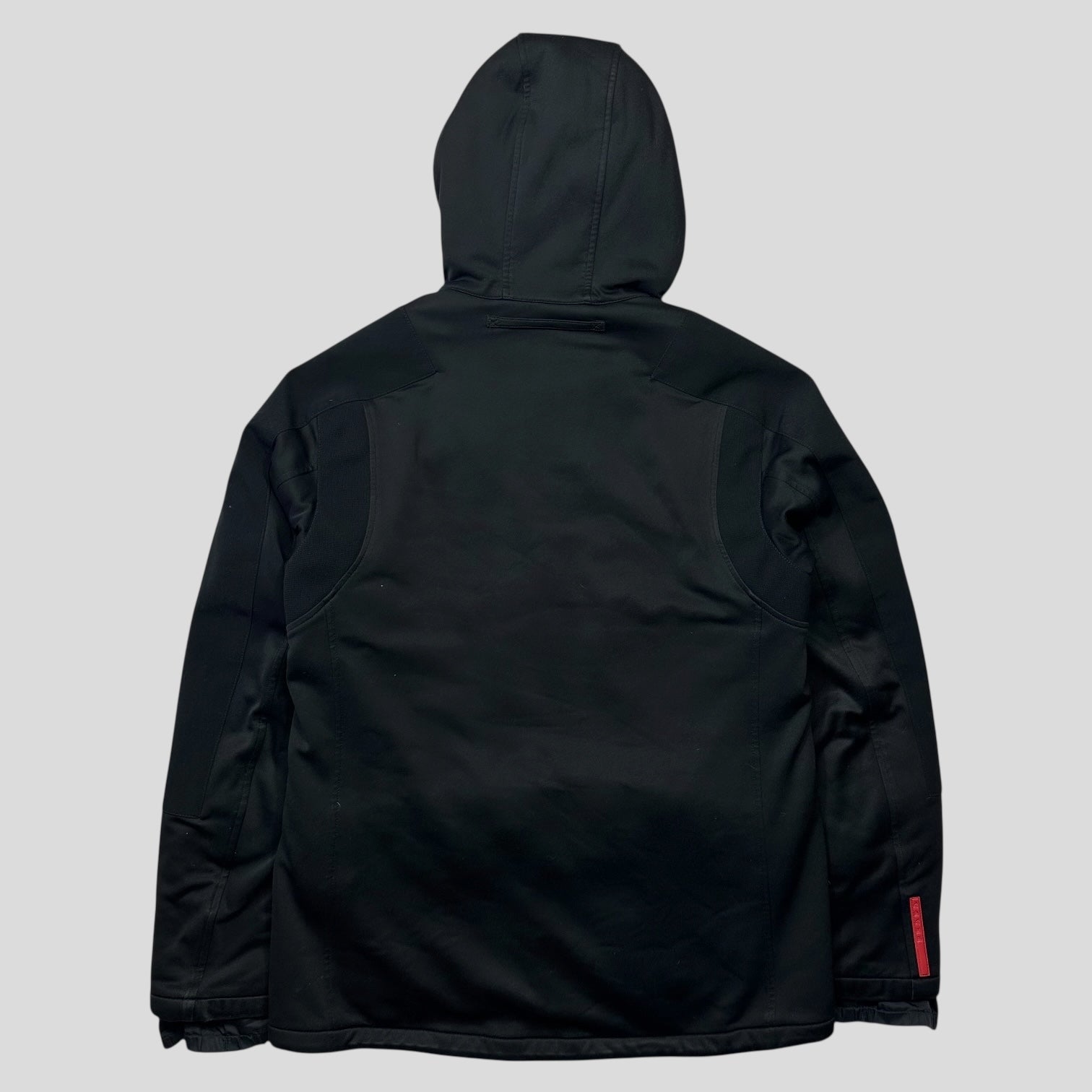 Prada Sport early 2000’s Nero black heavy soft polyester jacket with ninja style peaked hood, unique heavy nylon moto jacket panelling down the arms / back, Prada ski pass extendable carabiner in left zip pocket, red logo tab to cuff, nylon lined with a snow skirt and inside pocket storage.
