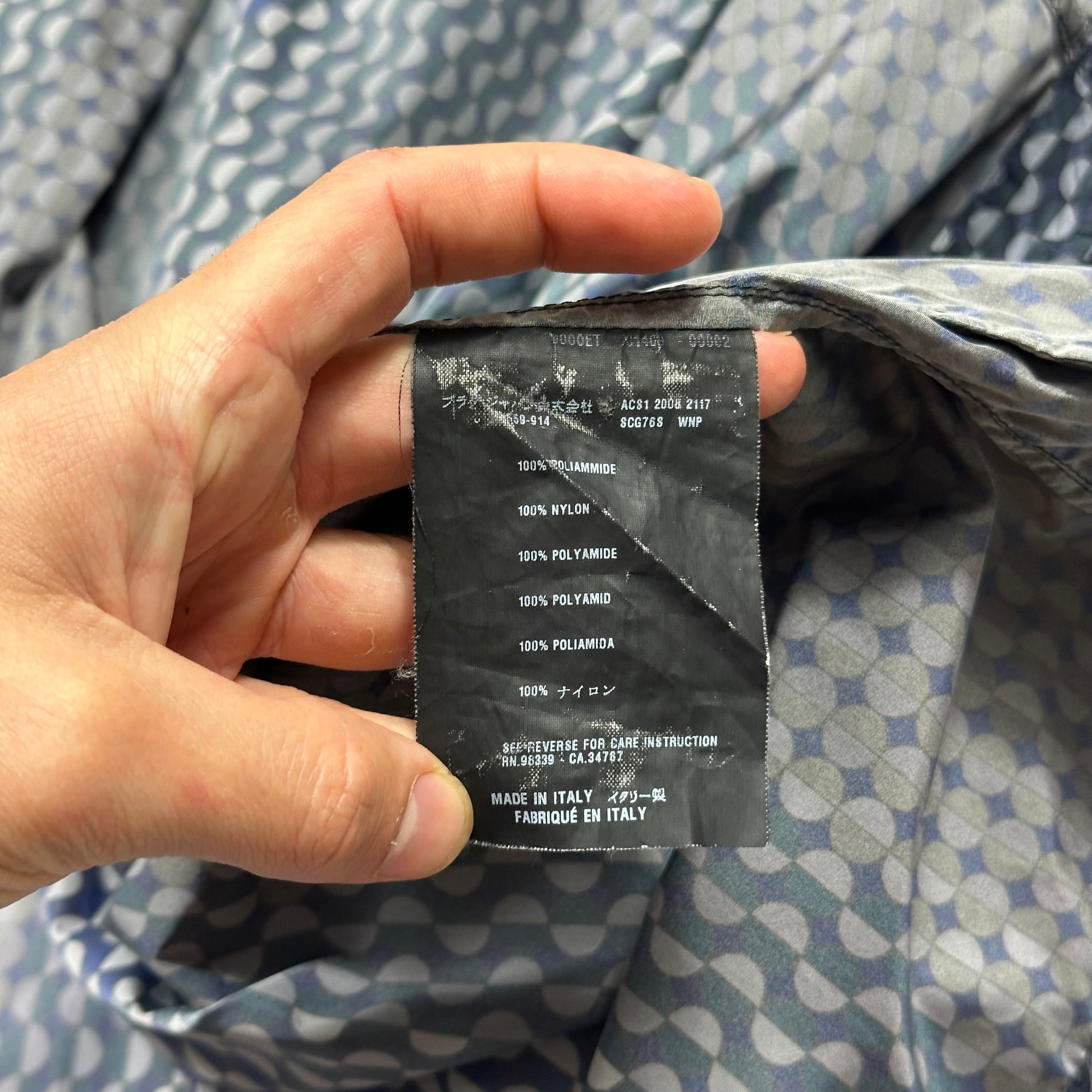 One of the rarest and nicest Prada printed jackets that have been released, 2008 geometric print with shadowing / mapping creating a unique blend of shades and visual textures, printed on PU resin coated nylon which shimmers in the sun and holds a lovely rich colour pallet.