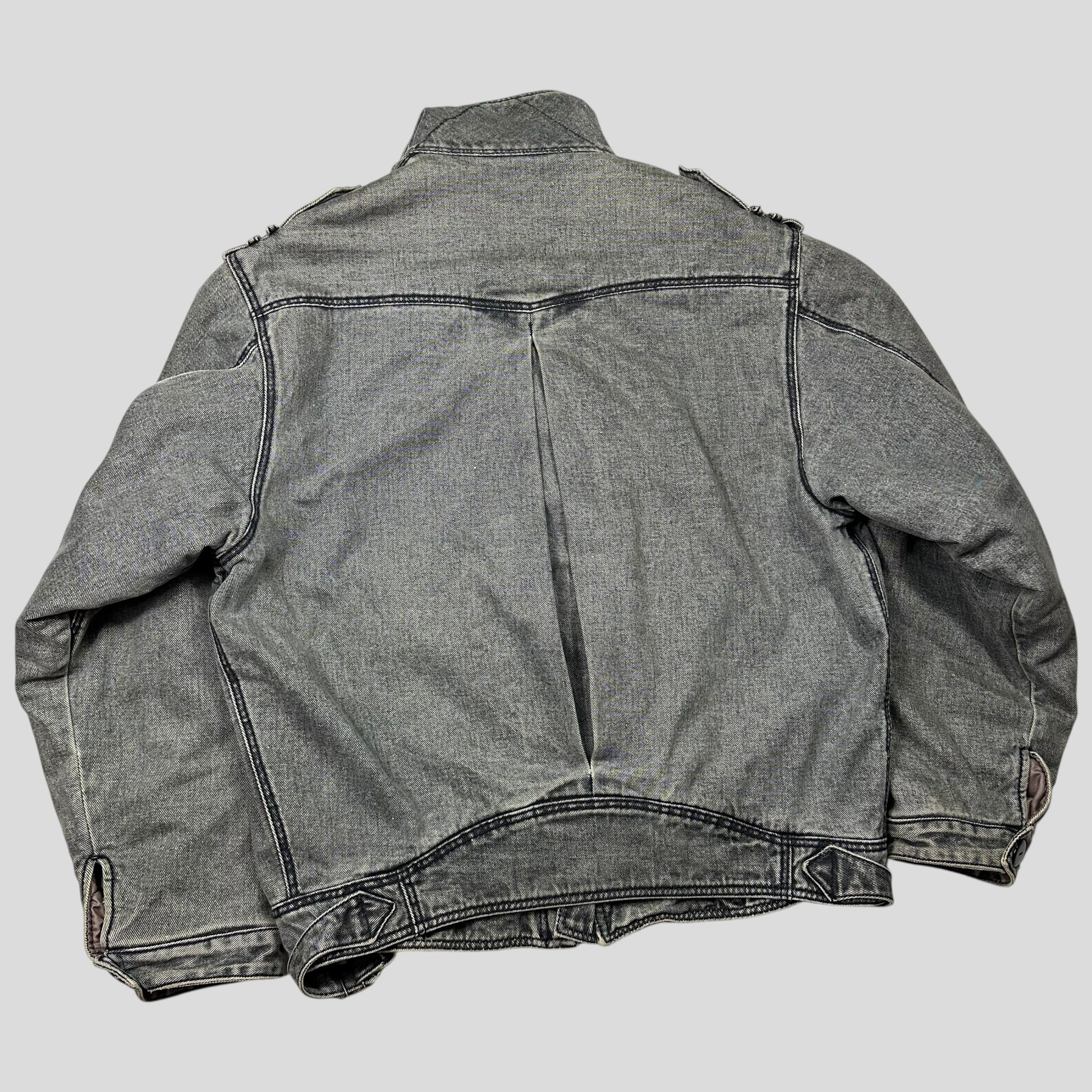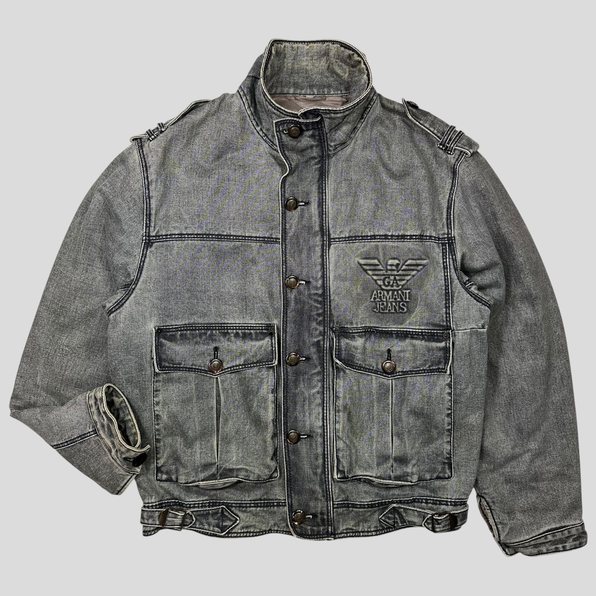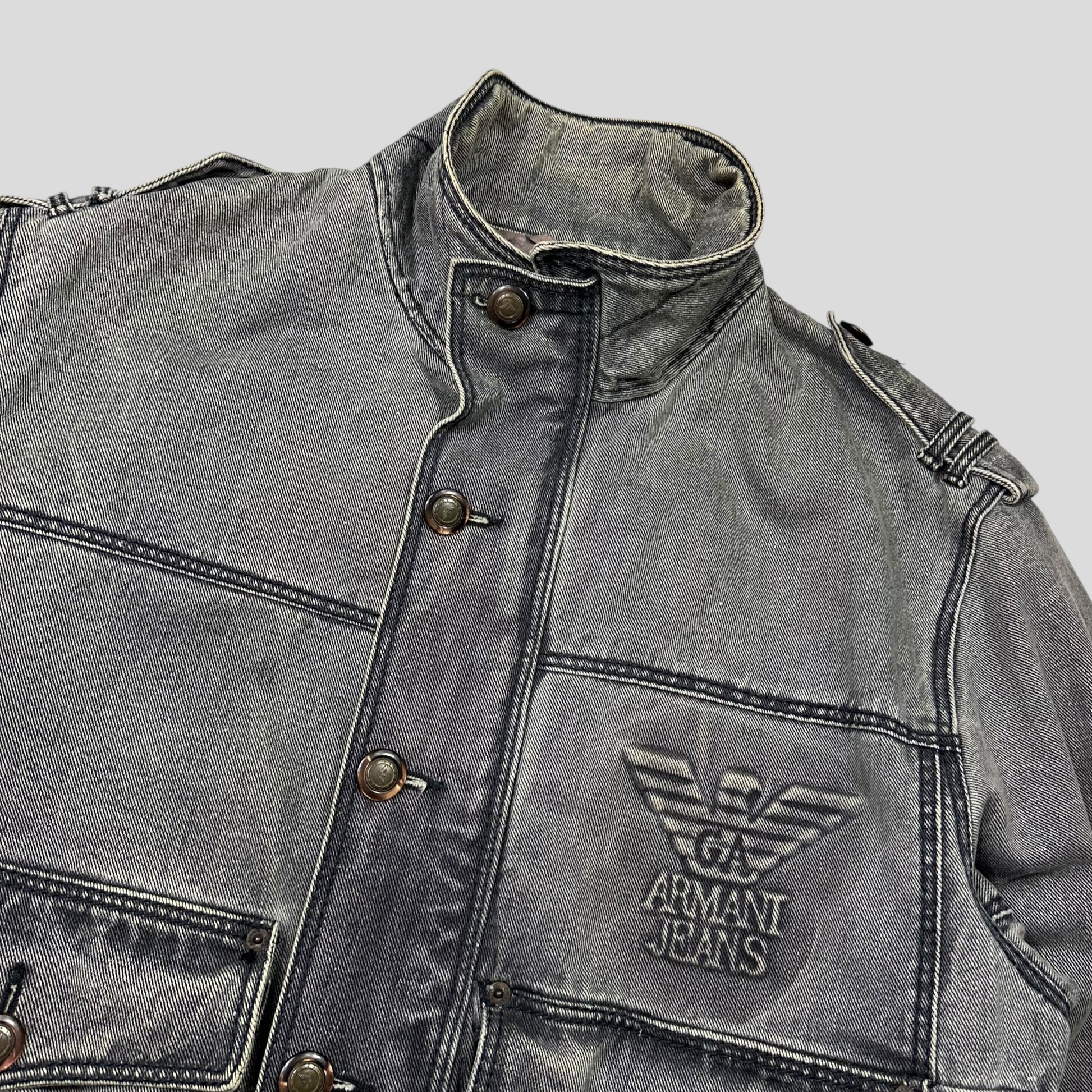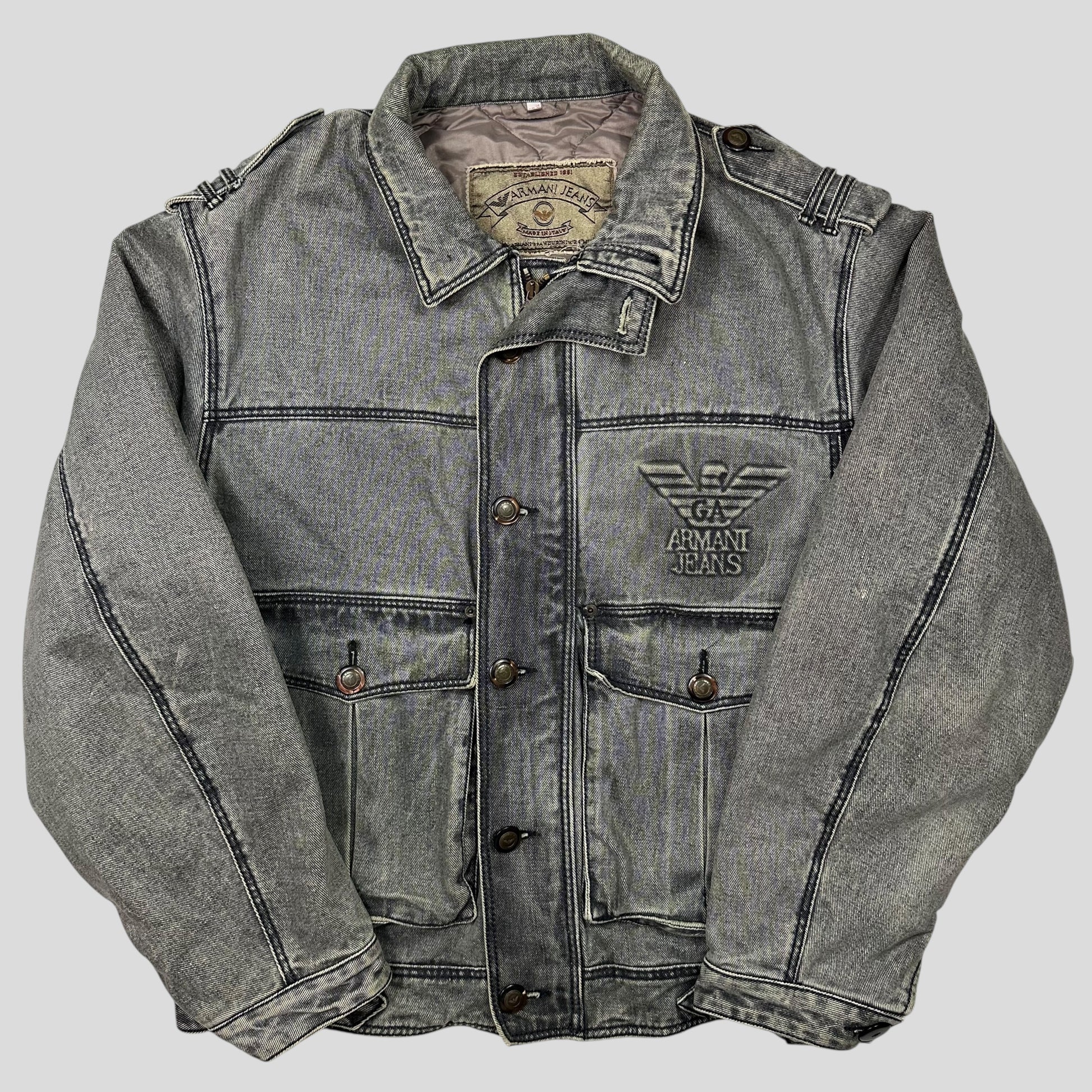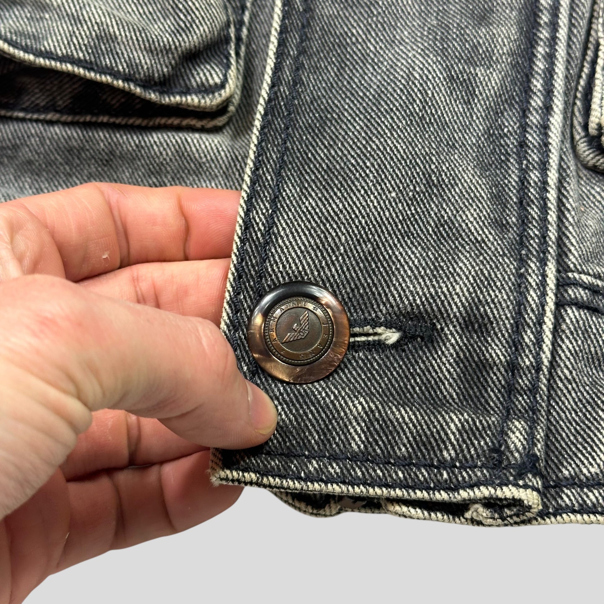 Extremely rare Armani Jeans gold label fall winter 1991 blanket and quilt lined trucker work jacket, large embossed Armani Jeans Eagle logo to chest, huge 3D pockets to front, incredible pleated seam on the back, triple rivet ventilation under arms, adjustable buckle belts at sides to fit.