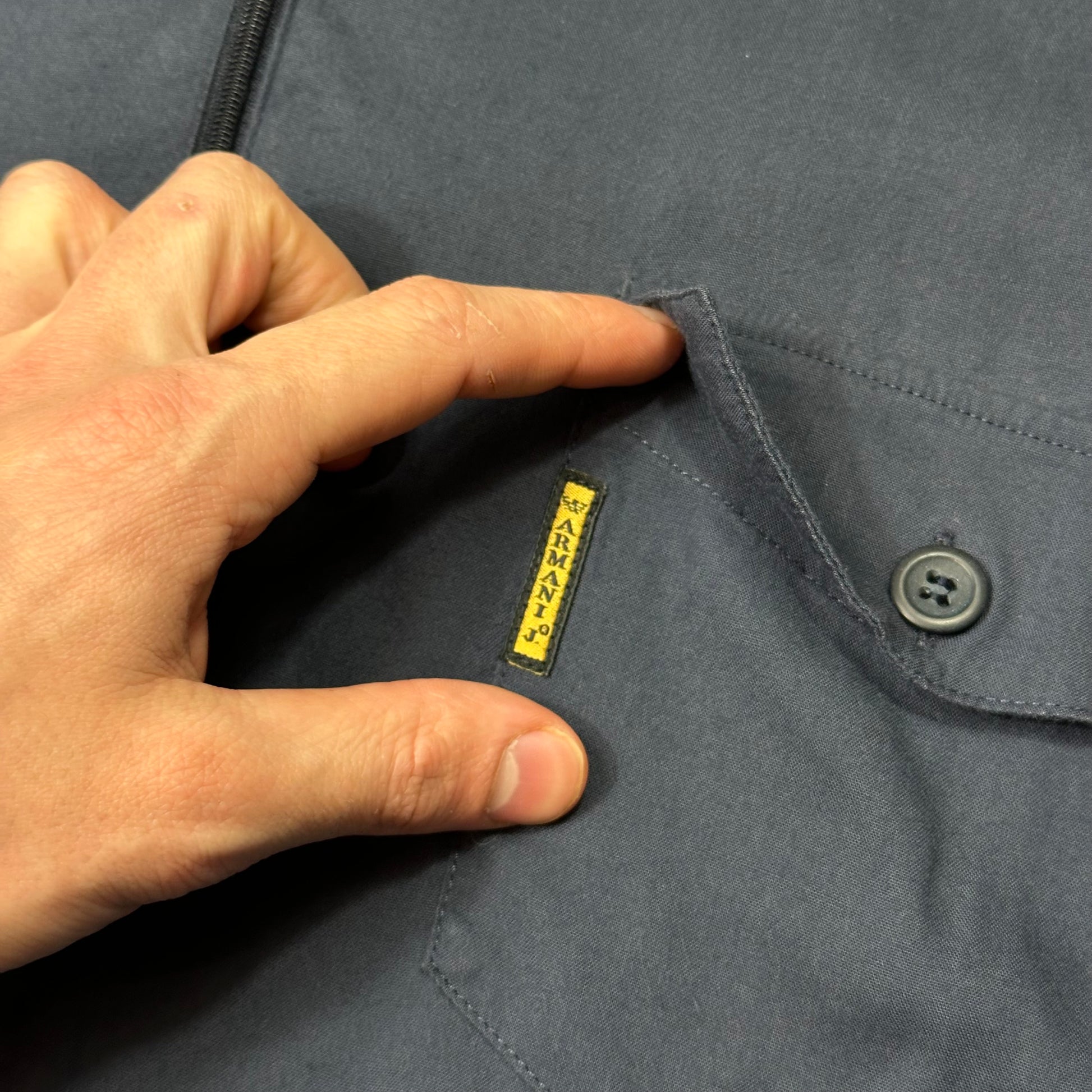 Rare 1990’s Armani Jeans navy blue tech shirt, unique Lyocell Eco material construction that’s made of Eucalyptus wood pulp, soft and lightweight.