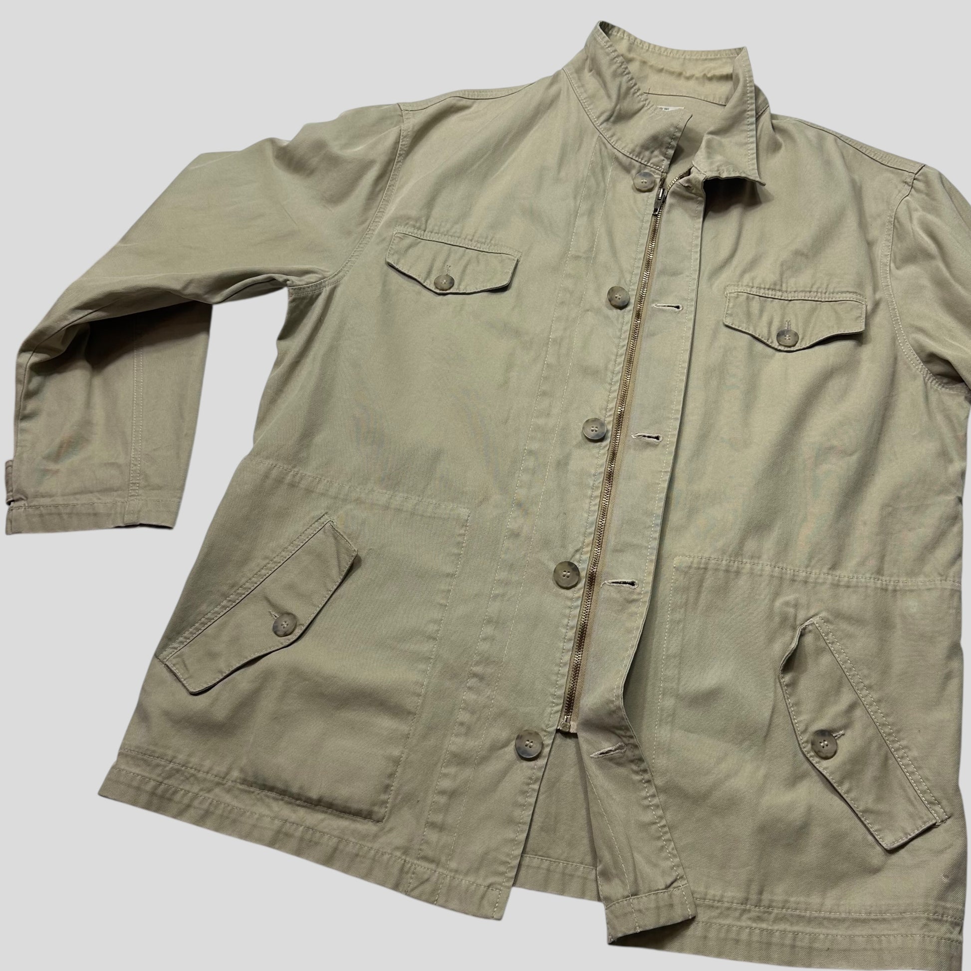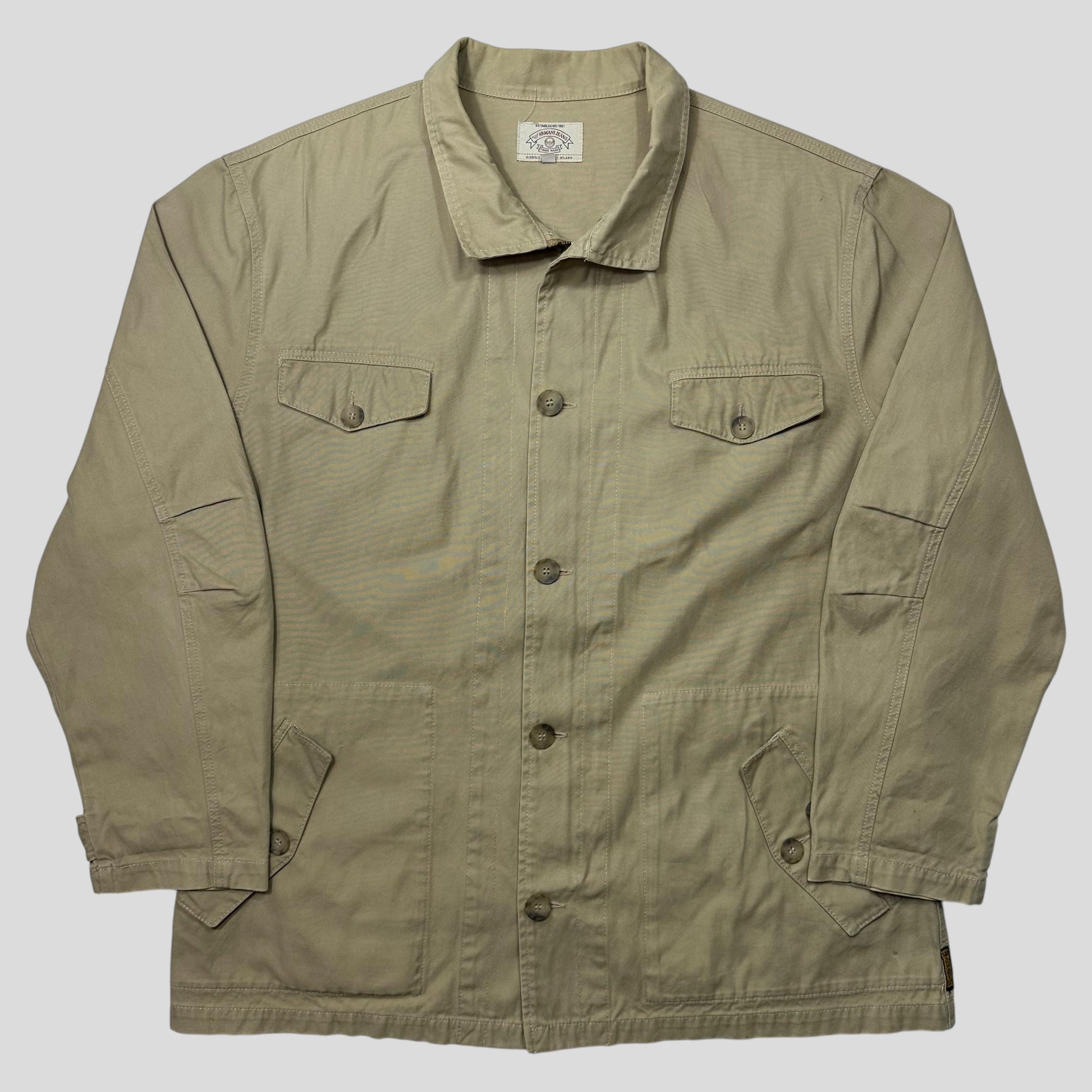 Rare mid 90’s Armani Jeans beige sandy cotton chore jacket, multipocket design, Armani label to bottom right, adjustable buttons to cuff and inside belting system.