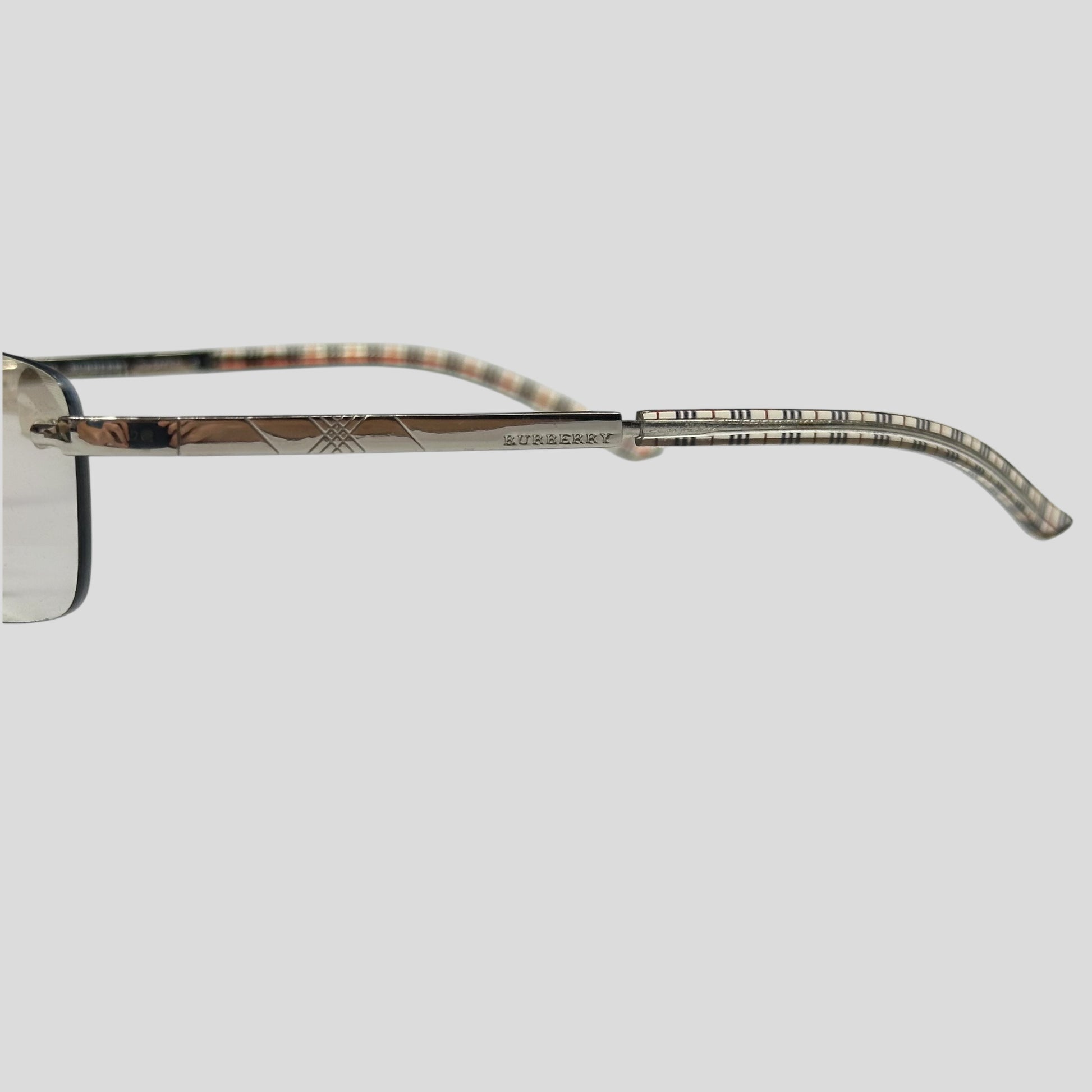 Burberry vintage thin square frame light sunglasses, metal with Burberry logo and nova check print to each arm, lightly tinted UV lenses, made by Safilo.